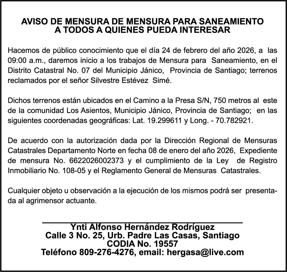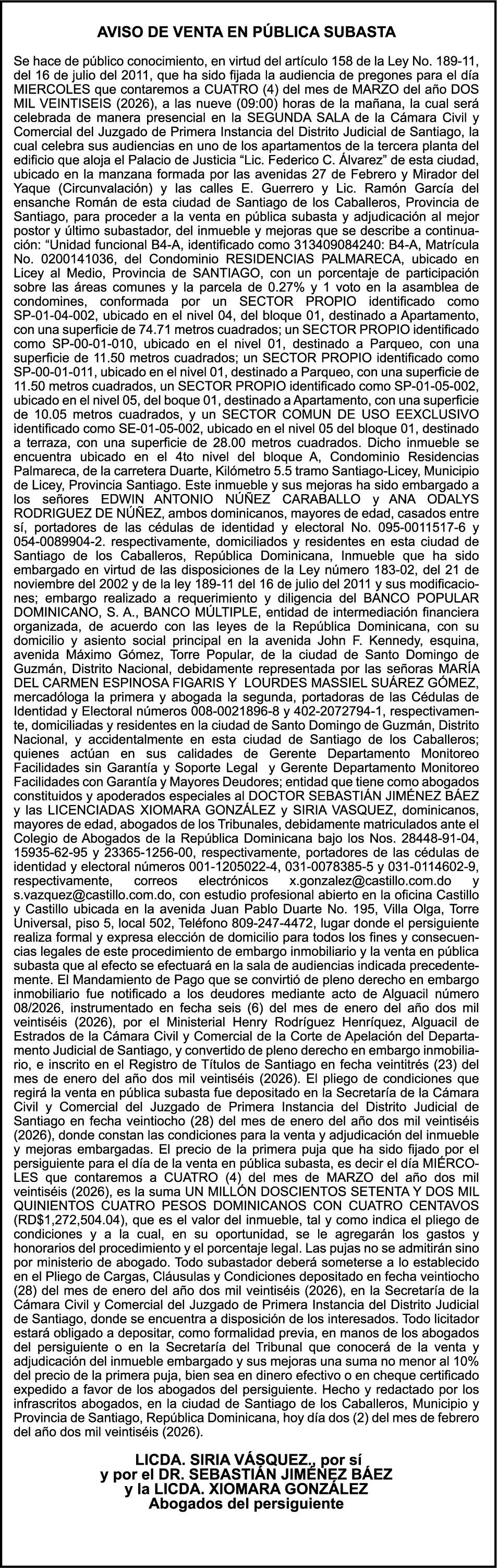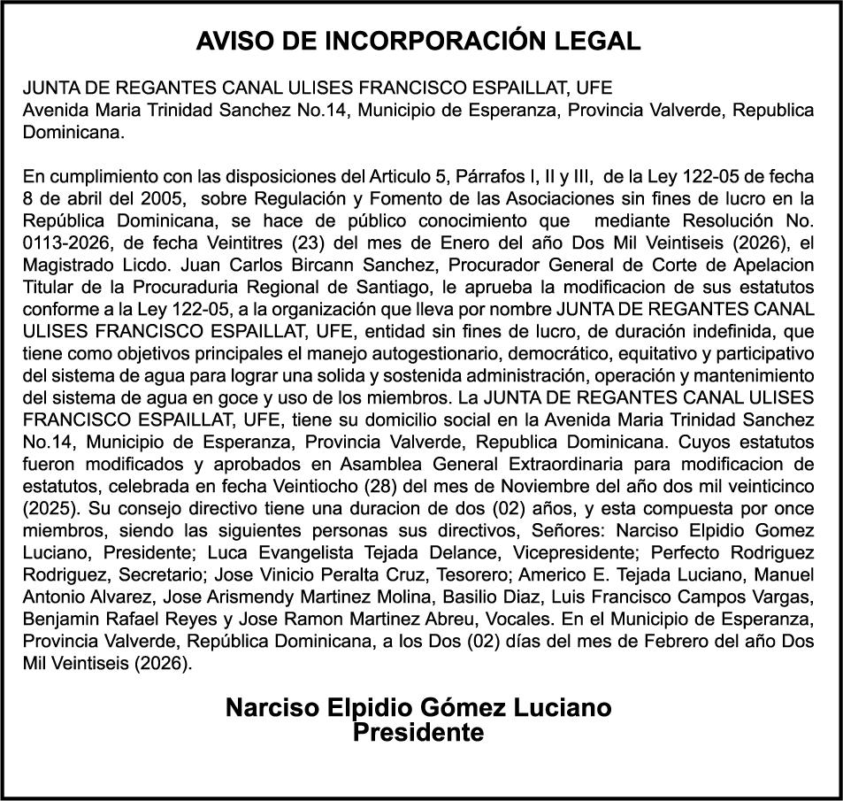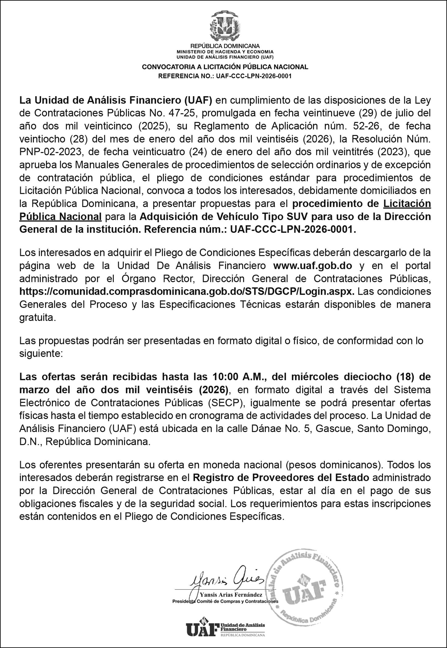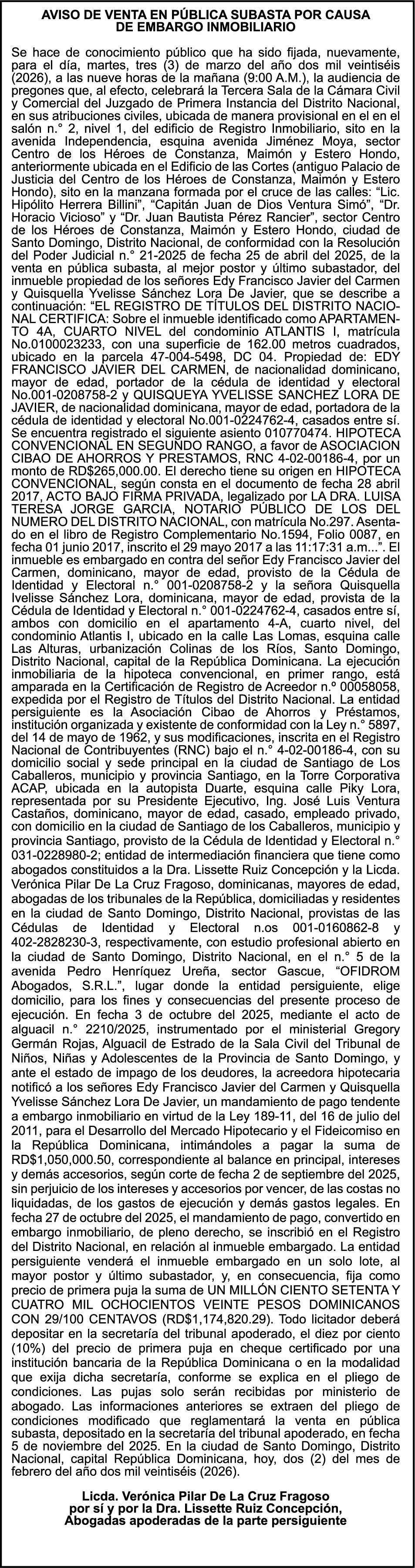 SE hace de público conocimiento la pérdida del Certificado Financiero número 847880119 emitido por Banco Popular Dominicano, S. A., a nombre de INDHIRA ROSALIA RODRIGUEZ VALDEZ, portadora de la Cédula de Identidad y Electoral número 402-3129189-5, certificado número 847880119 expedido en fecha 14 de marzo del 2025 por el monto de (RD$450,873.49), más intereses generados a la fecha.