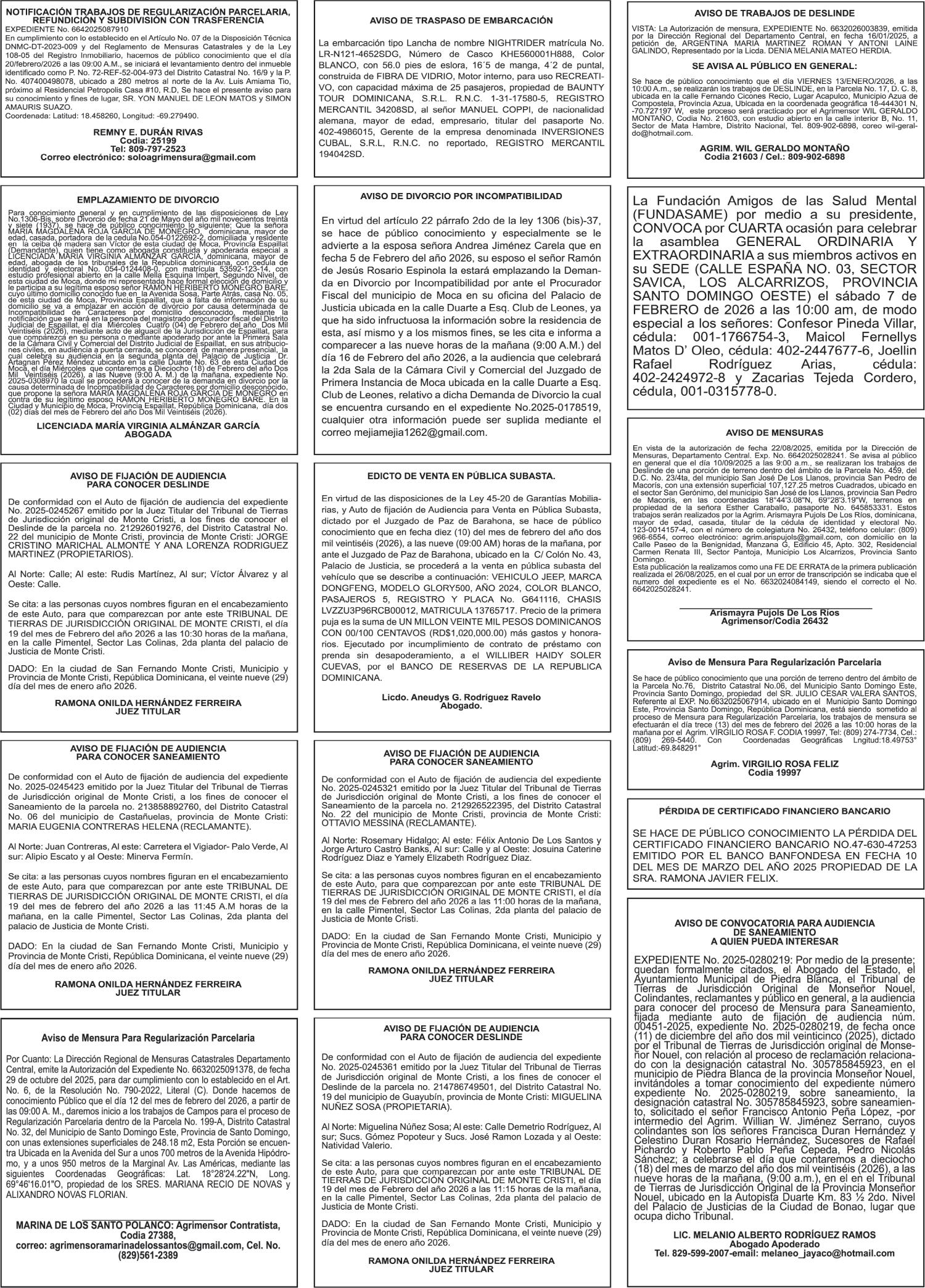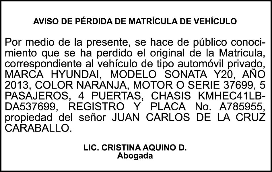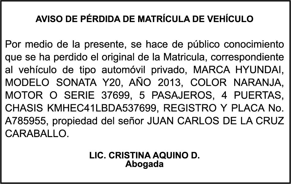 AVISO: perdida de matriculaSe hace de publico conocimiento la perdida de la matriculadel bote “LUIS MARIA-I”, No. BP-L250-1825SBS, de colorNaranja y Amarillo, propiedad de la señora. LUZ MARIA SEVERINO KING.