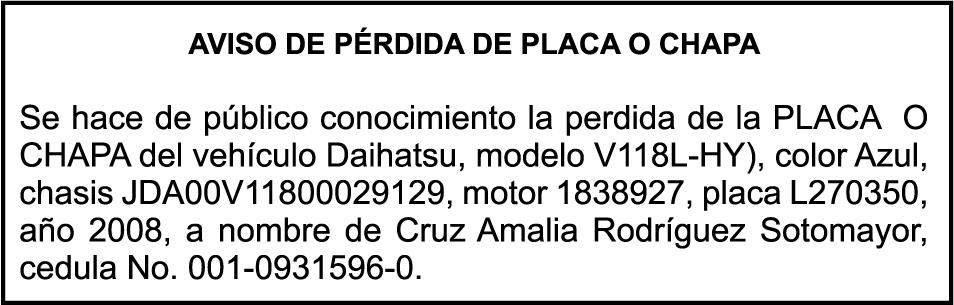 PERDIDA DE MATRICULA: Placa N554131,Chasis LC6PAGA13A0803197,Marca SUZUKI,Modelo AX100,Color NEGRO,Año 2010, a nombre de PLIMIO PEÑA BELLIARD,ced.101-0009984-4