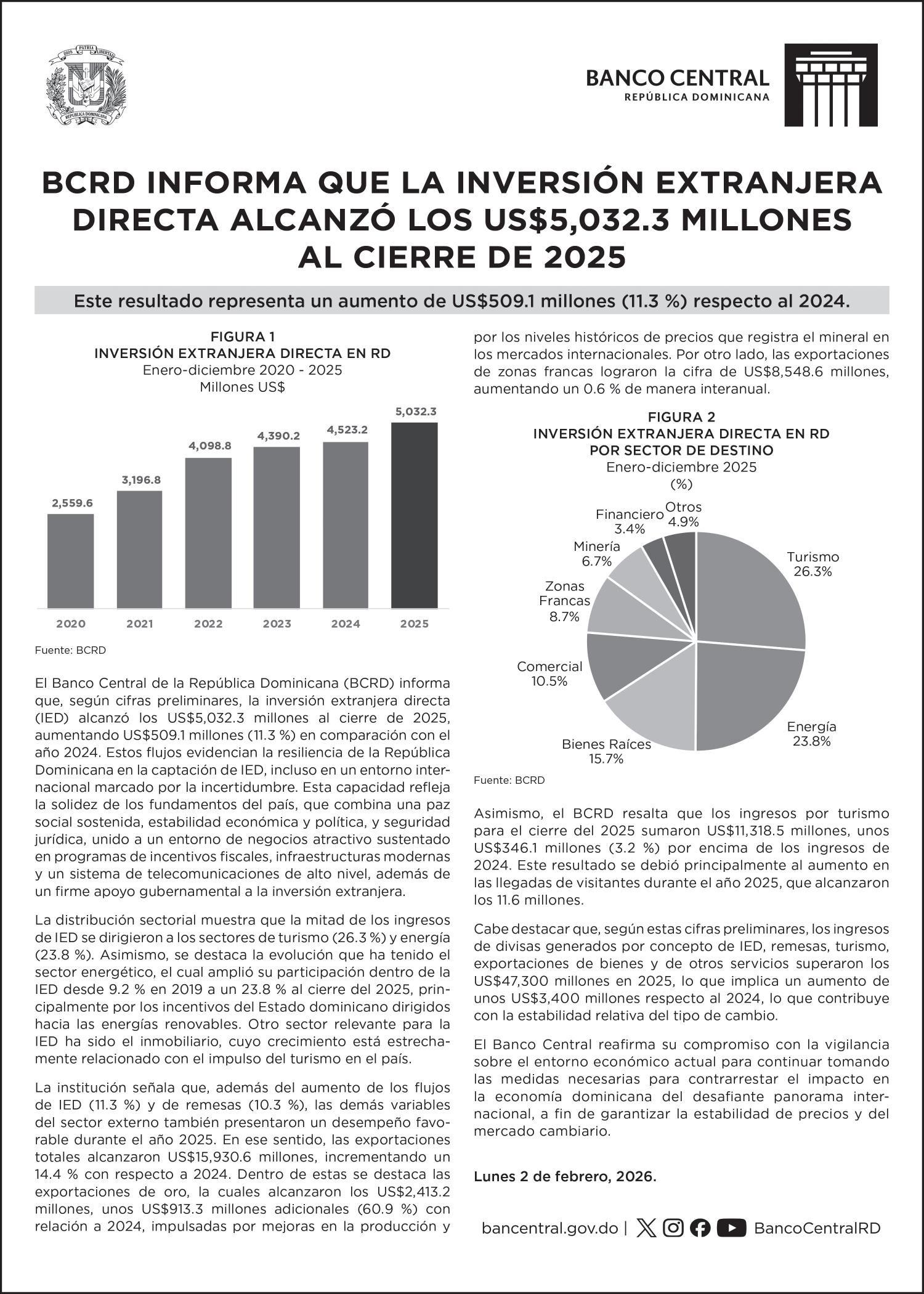 IED logra la cifra récord de US$5,032 millones en el 2025; crece 11.3 por ciento