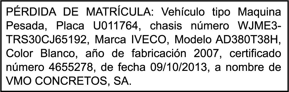 PERDIDA DE PLACA No. N031015,Motocicleta YAMAHA, Modelo AXIS- 1990, Color MORADO, Año 1990, Chasis 3VP0471801, a nombre de IMPORTADORA VENTURA C POR A. PERDIDA DE MATRICULA Motocicleta COMETA, Modelo CG200, Color ROJO, Año 2019, Placa K2005058, Chasis LBEPCX14TKB147744, a nombre de DAGO ALBERTO HERNANDEZ DUARTE.