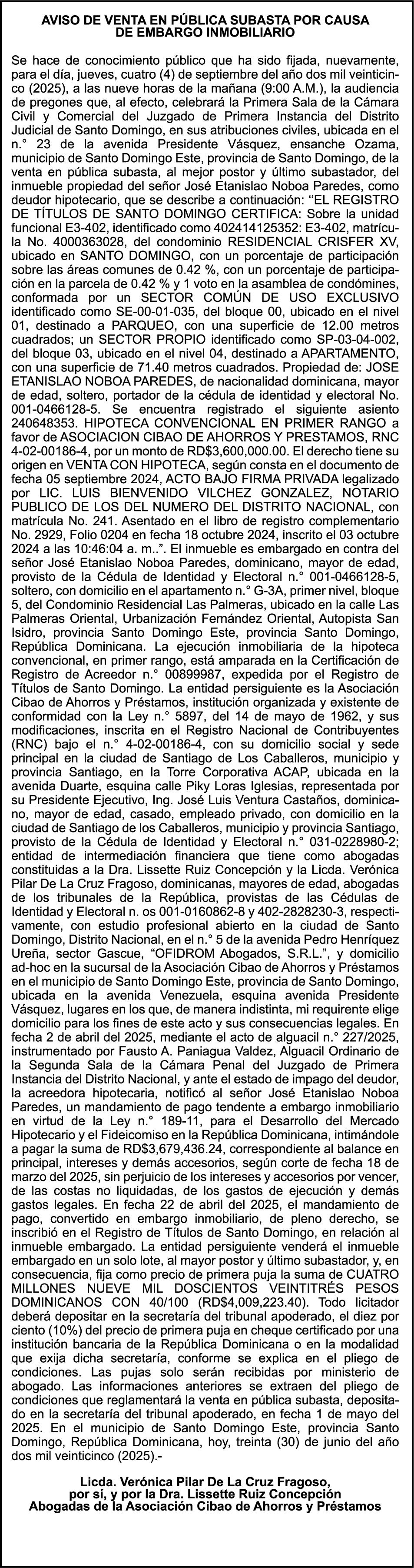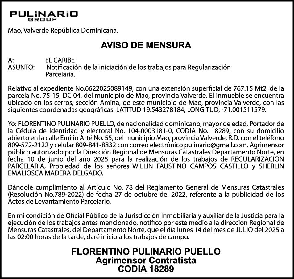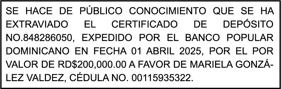 SE hace de público conocimiento la pérdida del Certificado Financiero número 826124950 emitido por Banco Popular Dominicano, S. A. Banco Múltiple, a nombre de ANA MERCEDES MARTINEZ, portadora de la Cédula de Identidad y Electoral número 402-2548784-8, certificado número 826124950 expedido en fecha 4 de febrero de 2022 por el monto de (RD$800,000.00) más intereses generados a la fecha.