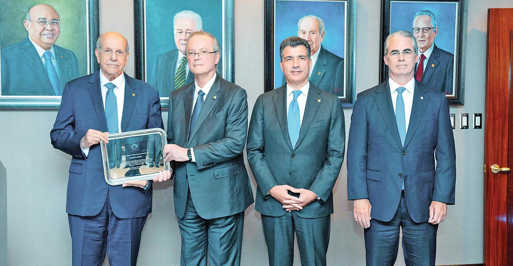 Eduardo Sanz Lovatón, director general de Aduanas, recibe una franela de Metros de parte de la diputada Dilenia Santos, Rovin Rodriguez y el ingeniero Manuel Estrella. FE