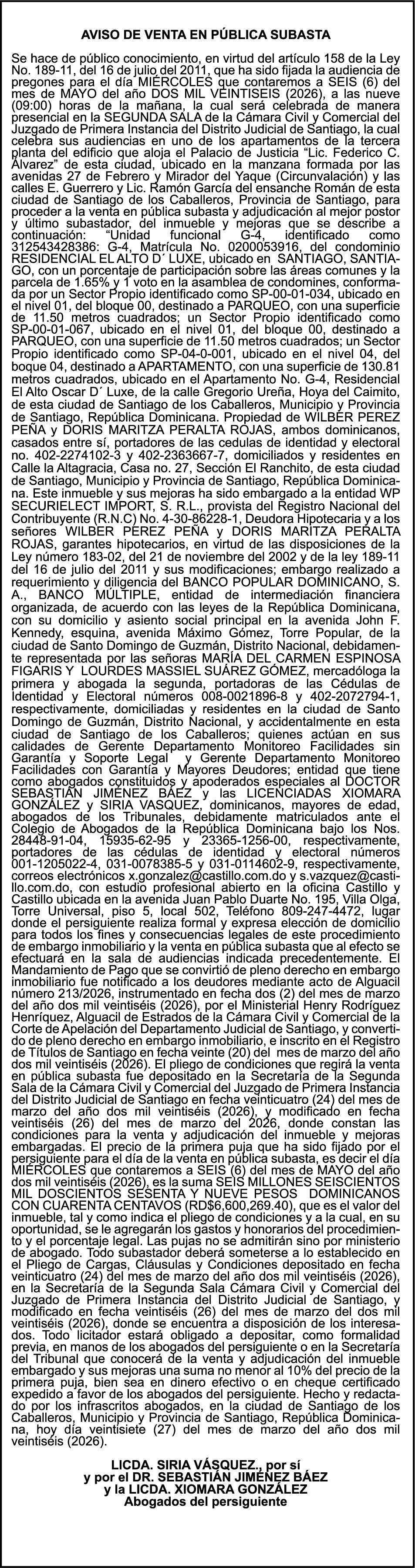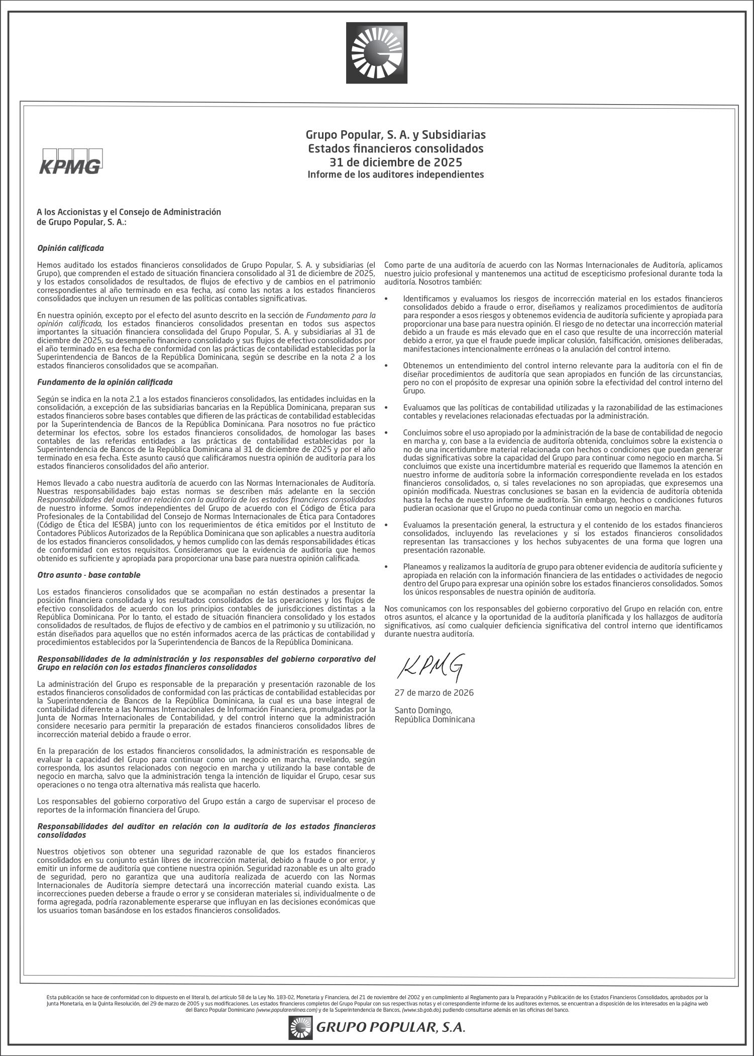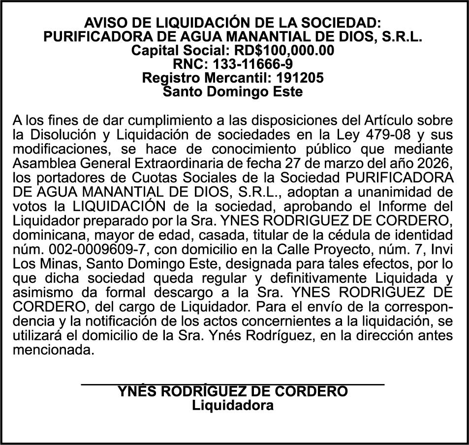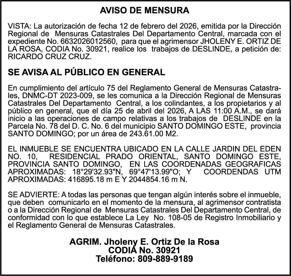 SE hace de público conocimiento la pérdida del Certificado Financiero número 839599883 emitido por Banco Popular Dominicano, S. A. Banco Múltiple, KATTY LOPEZ CONTRERAS, portadora de la Cédula de Identidad y Electoral número 001-1738085-7 y DOLAINES ROSALIS TOLENTINO LOPEZ , portadora de la Cédula de Identidad y Electoral número 402-3305654-4, certificado número 839599883, expedido en fecha 28 de febrero de 2024 por el monto de (RD$55,781.67) más intereses generados a la fecha.