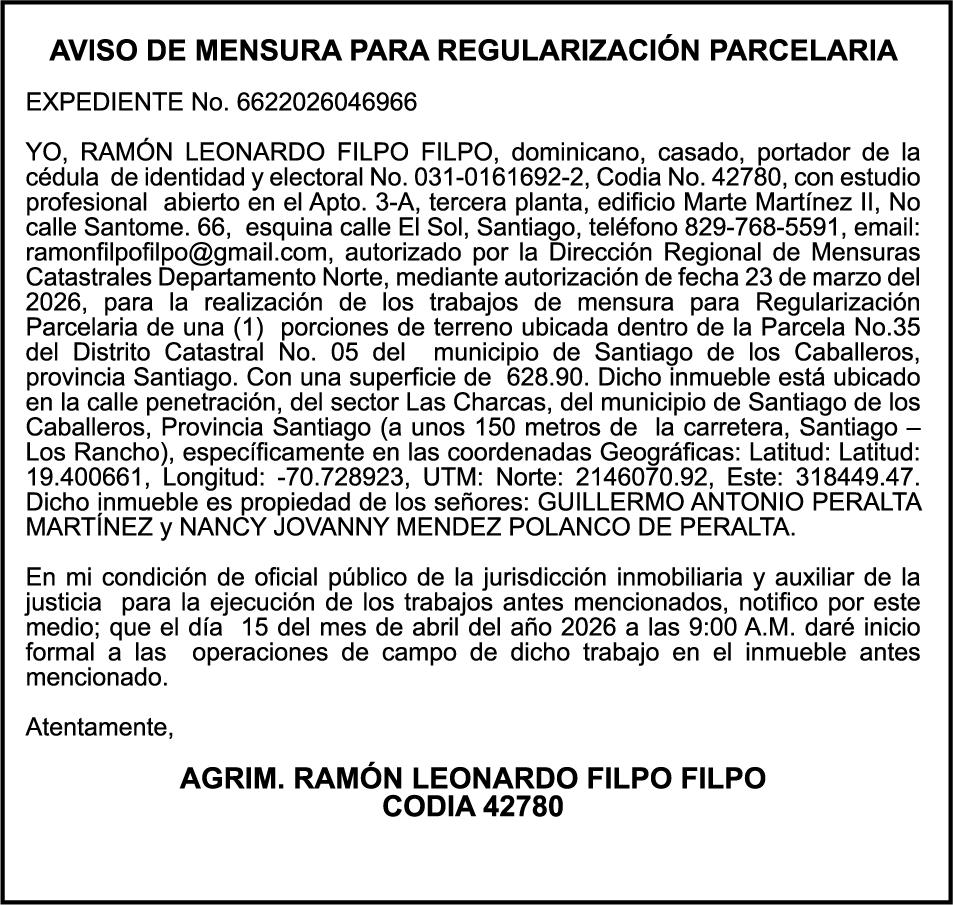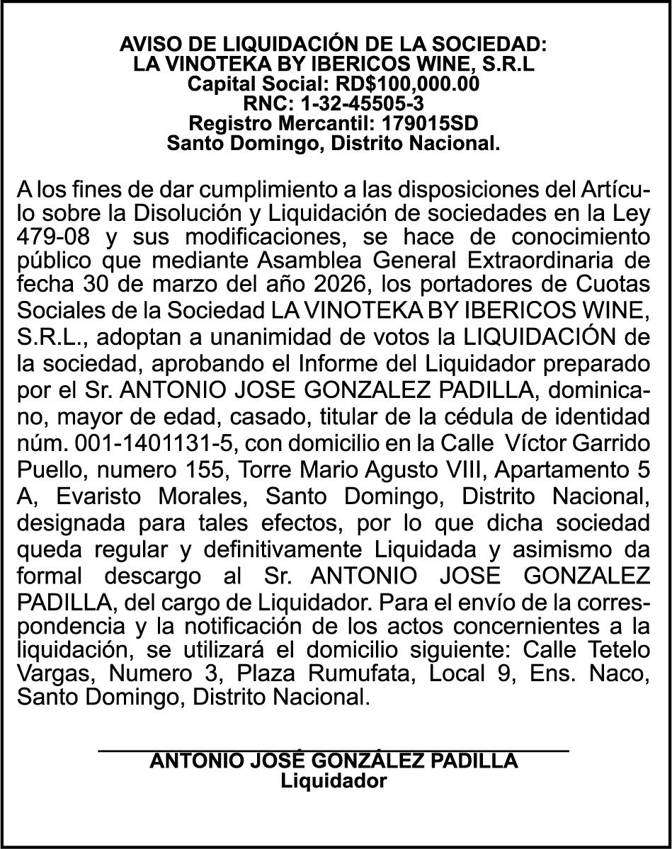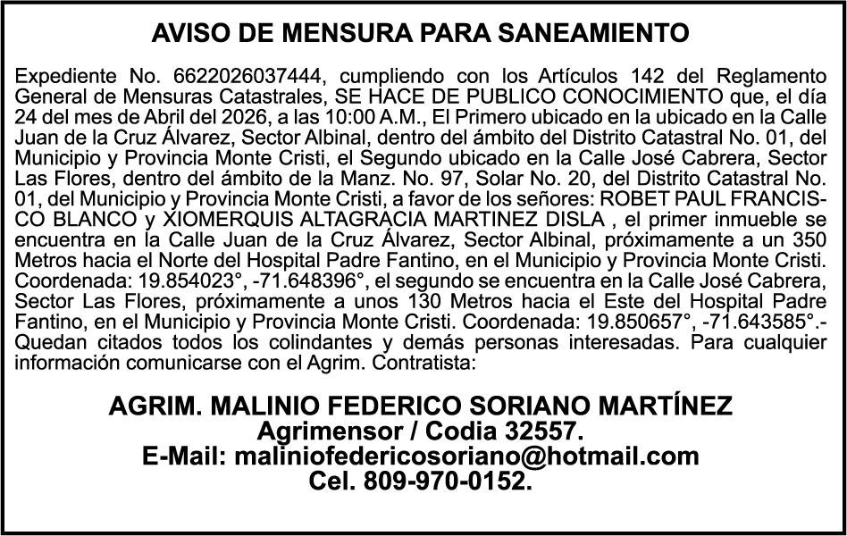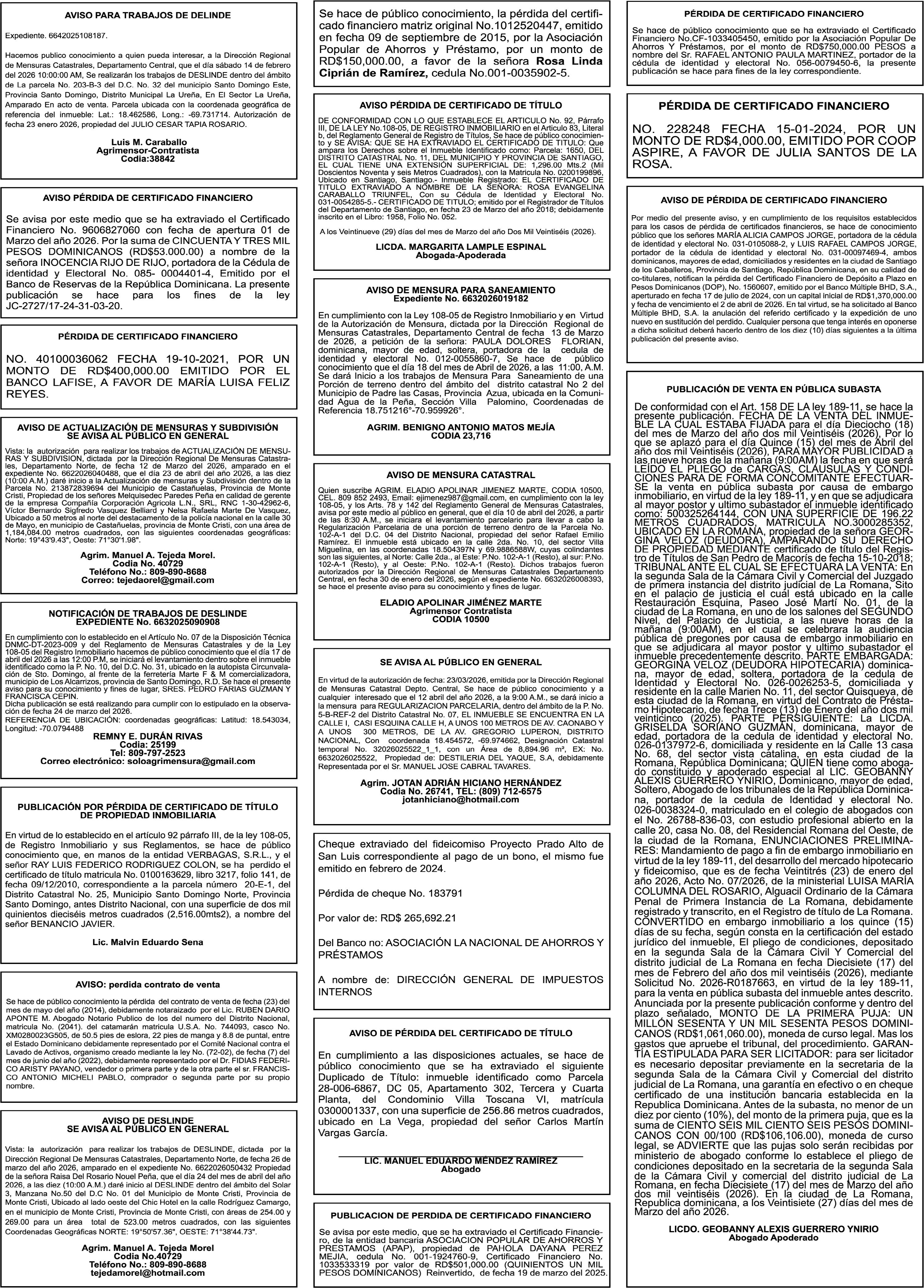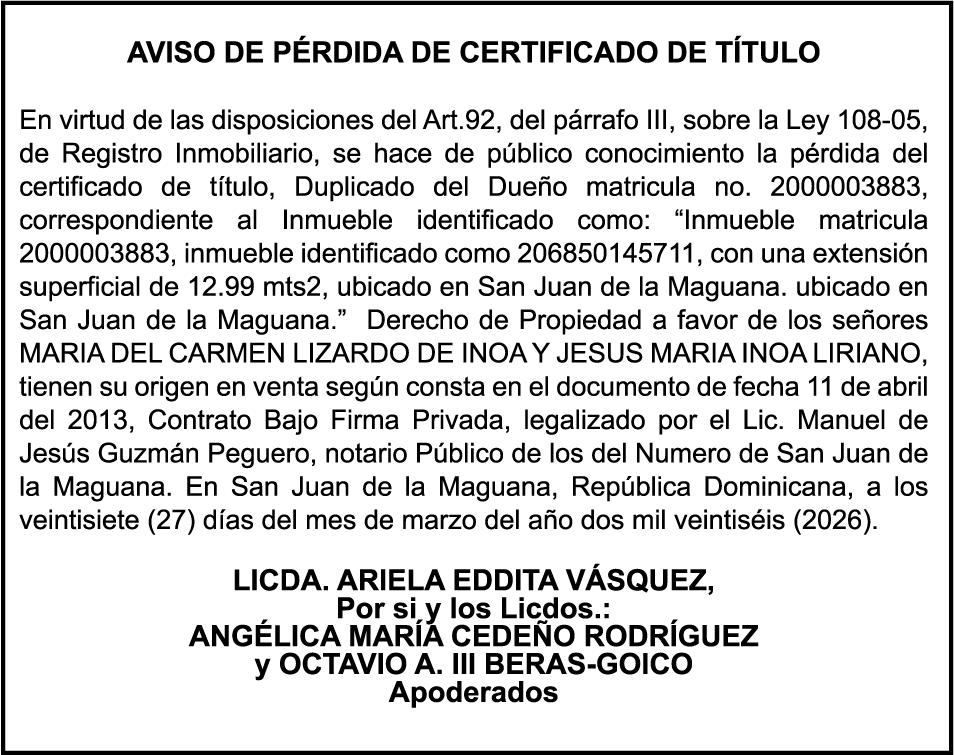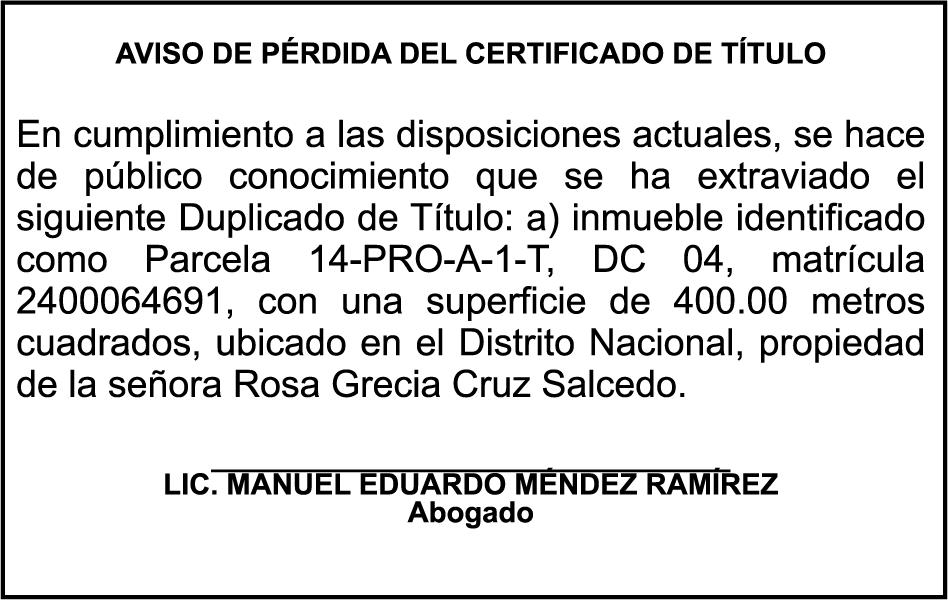 SE hace de público conocimiento la pérdida del Certificado Financiero número 831396775 emitido por Banco Popular Dominicano, S. A. Banco Múltiple, a nombre de GUILLERMO LORENZO ALMONTE, portador de la Cédula de Identidad y Electoral número 402-0077383-2 y GUILLERMO MANUEL LORENZO ORTIZ, portador de la Cédula de Identidad y Electoral número 001-1180879-6 certificado número 831396775 expedido el 28 de diciembre de 2022 por el monto de (USD$53,012.01) más intereses generados a la fecha.