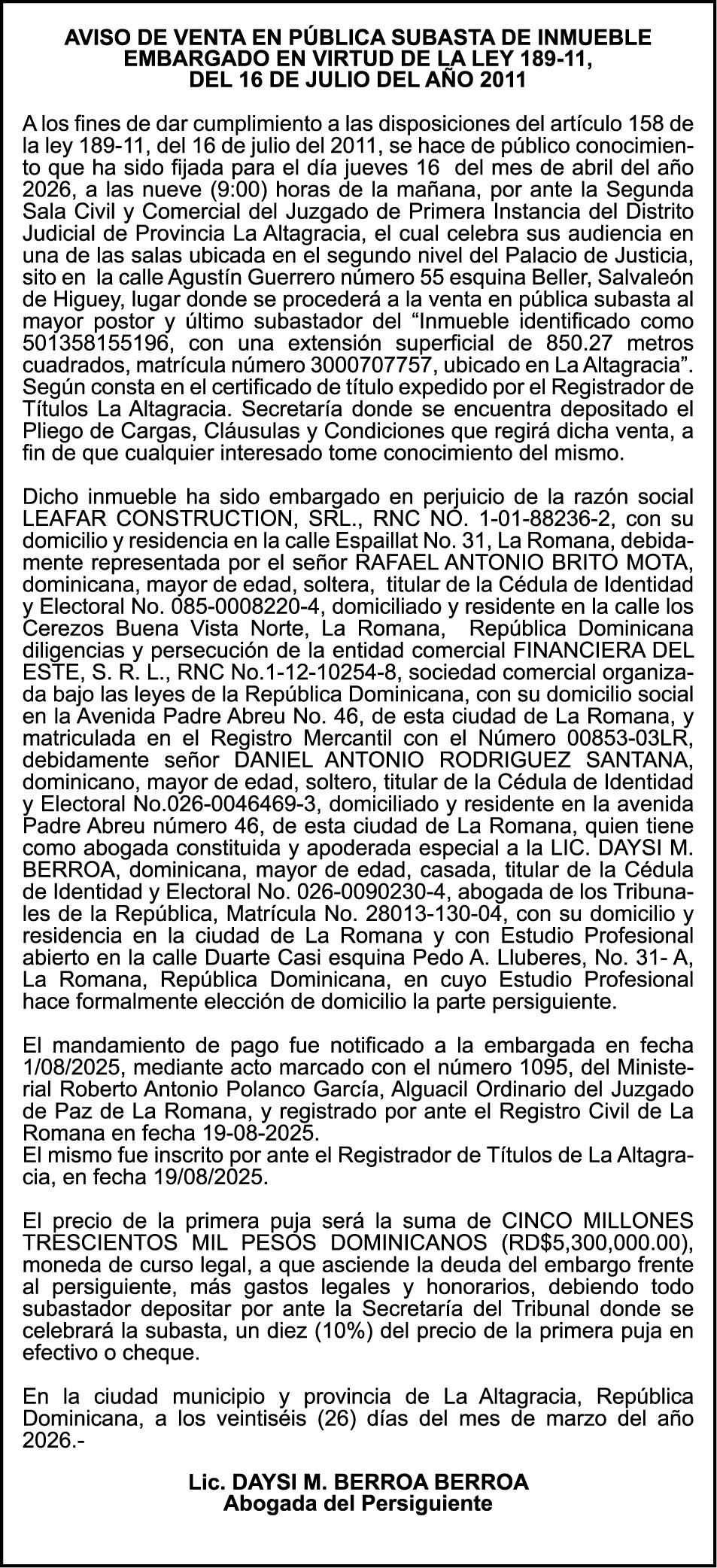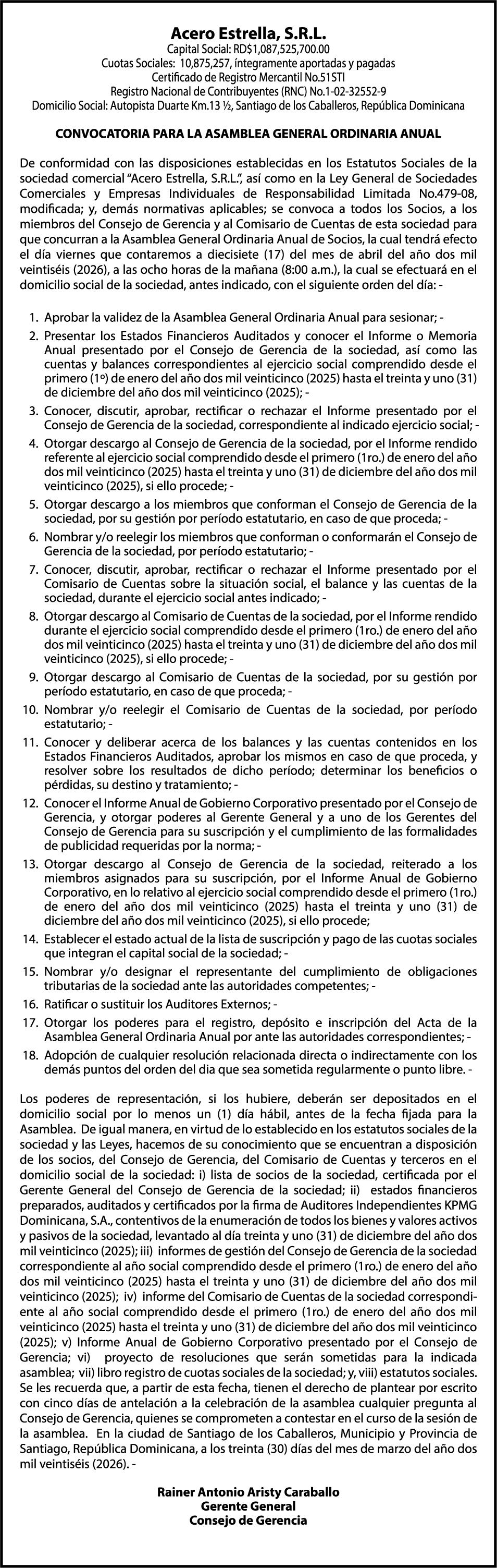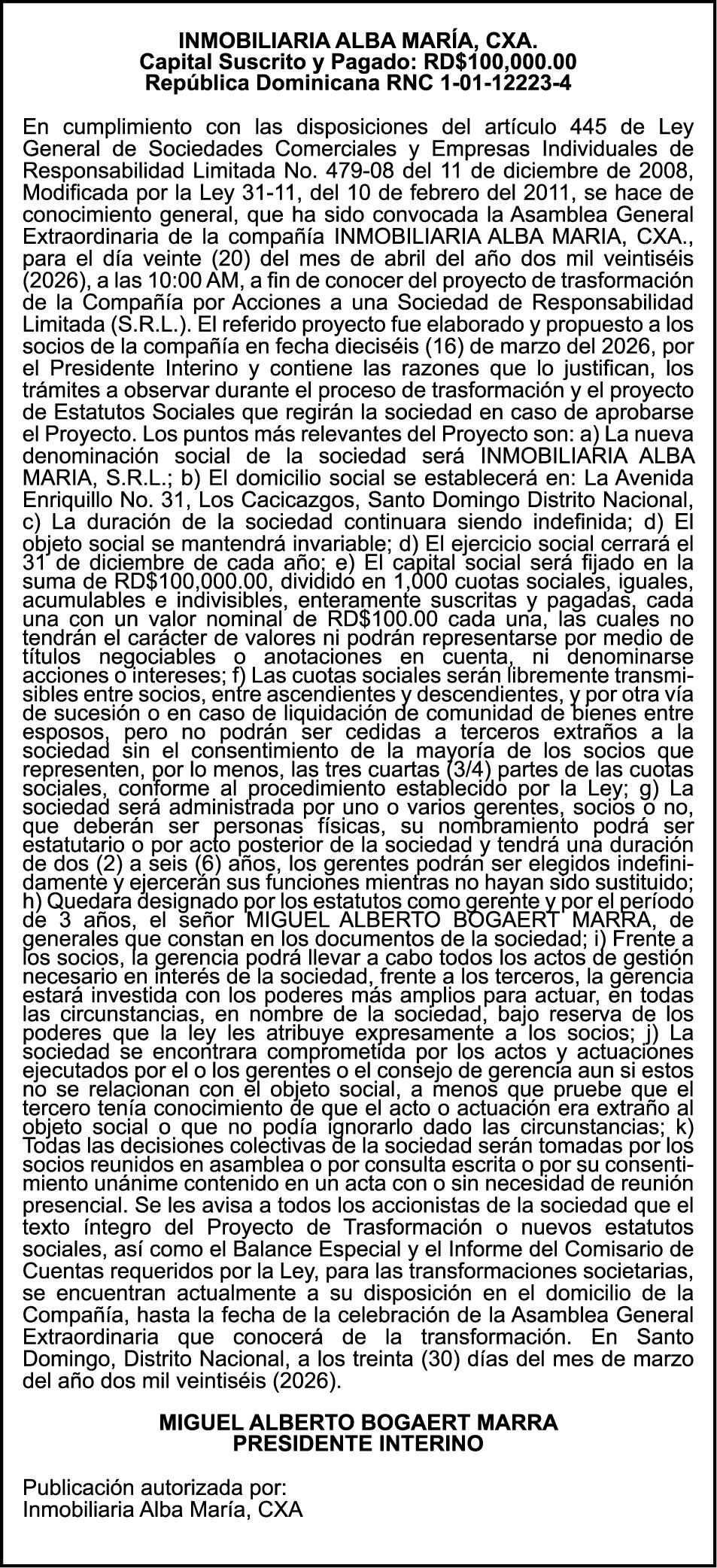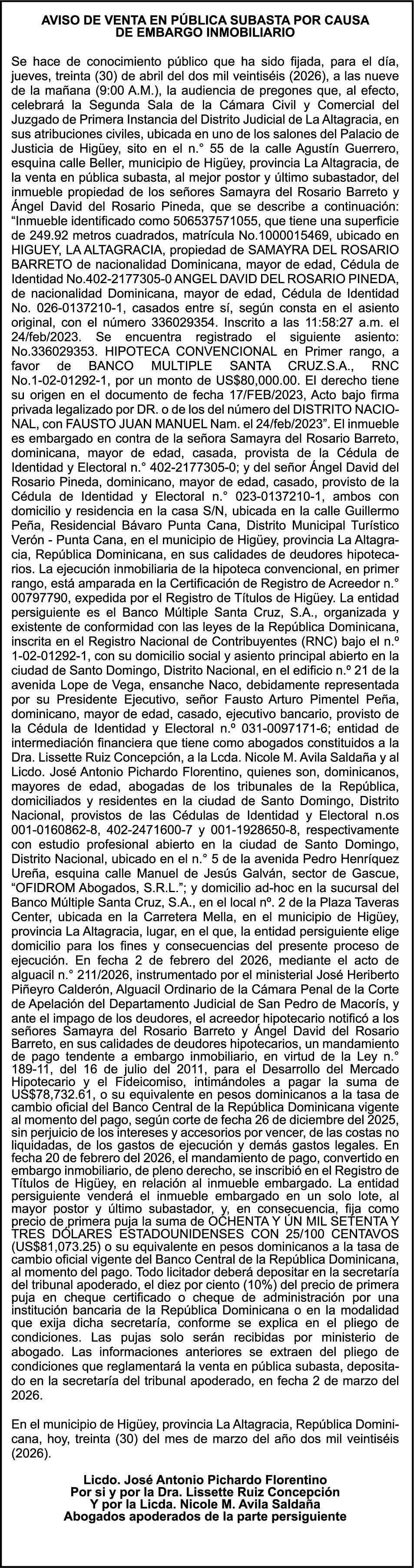 SE hace de público conocimiento la pérdida del Certificado Financiero número 831396775 emitido por Banco Popular Dominicano, S. A. Banco Múltiple, a nombre de GUILLERMO LORENZO ALMONTE, portador de la Cédula de Identidad y Electoral número 402-0077383-2 y GUILLERMO MANUEL LORENZO ORTIZ, portador de la Cédula de Identidad y Electoral número 001-1180879-6 certificado número 831396775 expedido el 28 de diciembre de 2022 por el monto de (USD$53,012.01) más intereses generados a la fecha.
