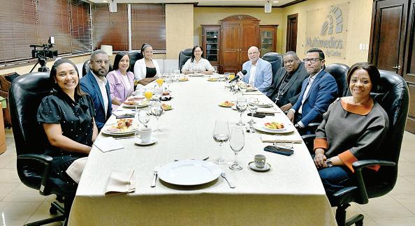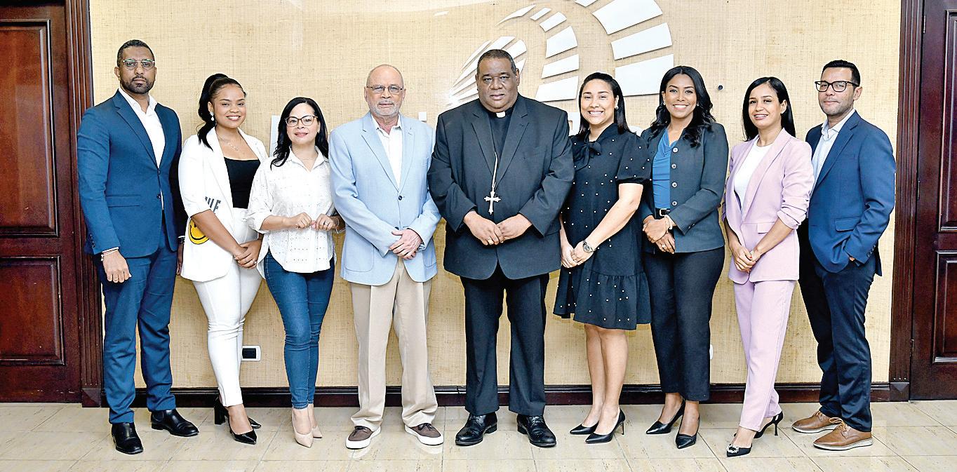 Frankelvin Sánchez, Wendy Leonardo, Yanessi Espinal, Nelson Rodríguez (director de elCaribe), monseñor Jesús Castro Marte, Rosmery Feliz, Raysa Álvarez, Jessica Bonifacio y Andrés Tovar en el Desayuno elCaribe-CDN.