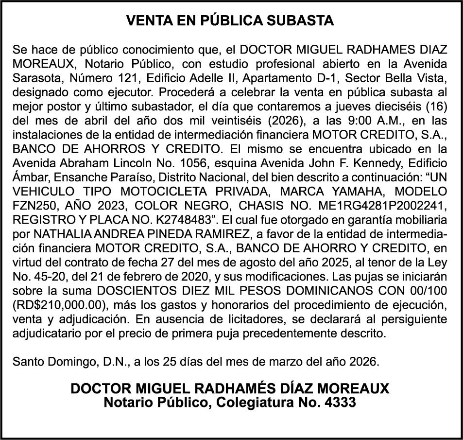 PERDIDA DE PLACA No. K1035854, Motocicleta X1000, modelo NEW LEAD, color blanco perla, año 2025, chasis TBLCKV506R1003141, a nombre de FRAILYN VASQUEZ REYES.