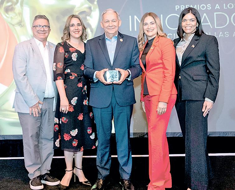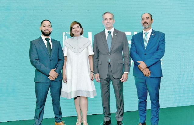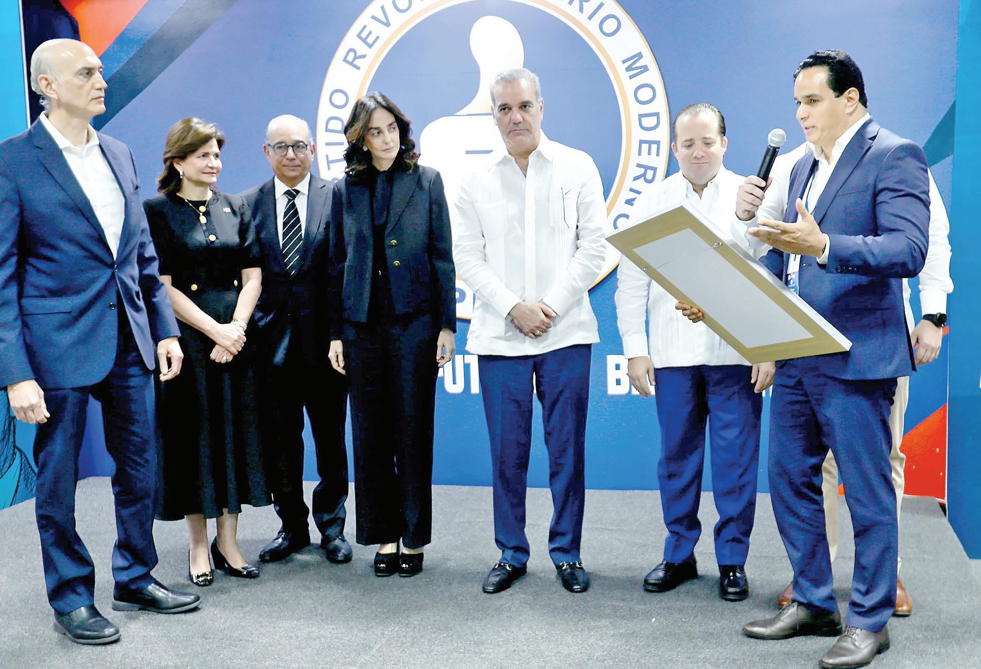 José Abinader, la vicepresidenta Raquel Peña, Rita Abinader y esposo, el presidente Luis Abinader, José Paliza, presidente del Partido Revolucionario Moderno, y Manuel Conde, dirigente, durante el acto de reconocimiento.
