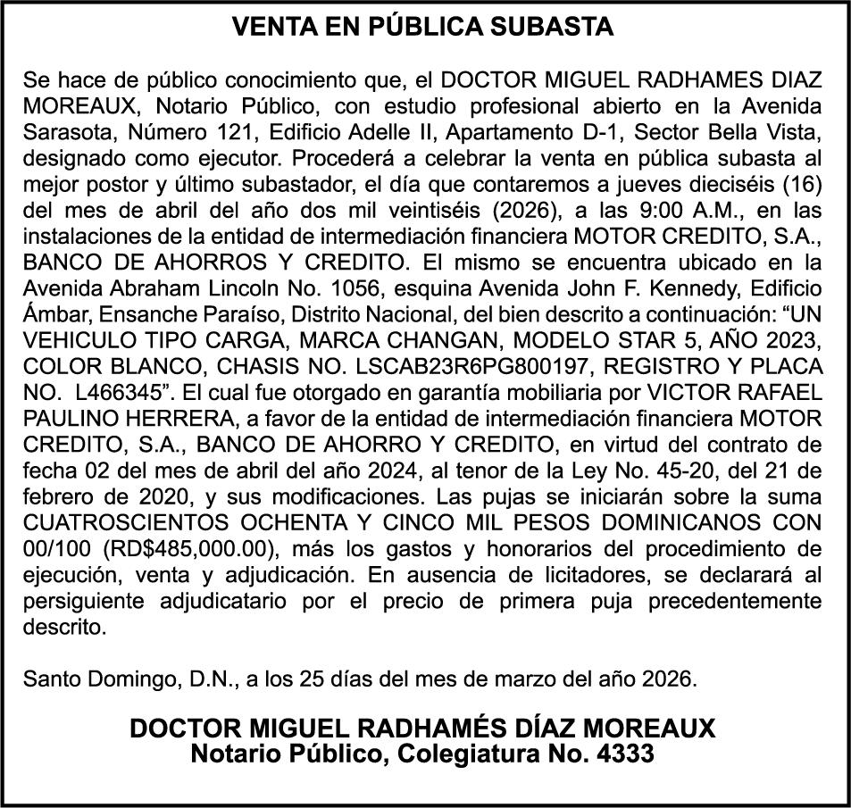 PERDIDA DE MATRICULA Veh. Carga DONGFENG, modelo CARGO BOX V21, color blanco, año 2015, placa L334804, chasis LGHK121A8F9B00118, a nombre de MS GROUP R D SRL. RNC 131147992.