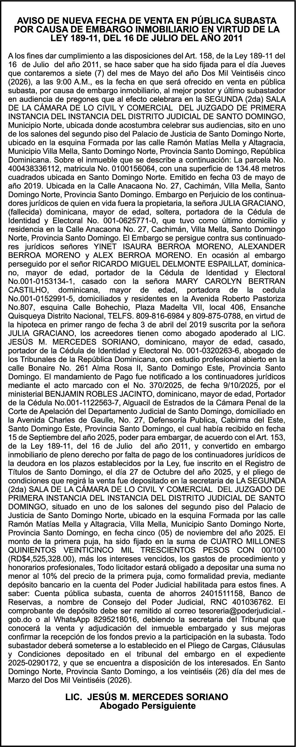 SE hace de público conocimiento la pérdida del Certificado Financiero número 743576027 emitido por Banco Popular Dominicano, S. A. Banco Múltiple, a nombre de MERCEDES YOLANDA SOSA RODRIGUEZ DE GONZALEZ, portadora de la Cédula de Identidad y Electoral número 001-1700927-4, certificado número 743576027 expedido en fecha 22 de noviembre de 2007 por el monto de (RD$190,089.43) más intereses generados a la fecha.