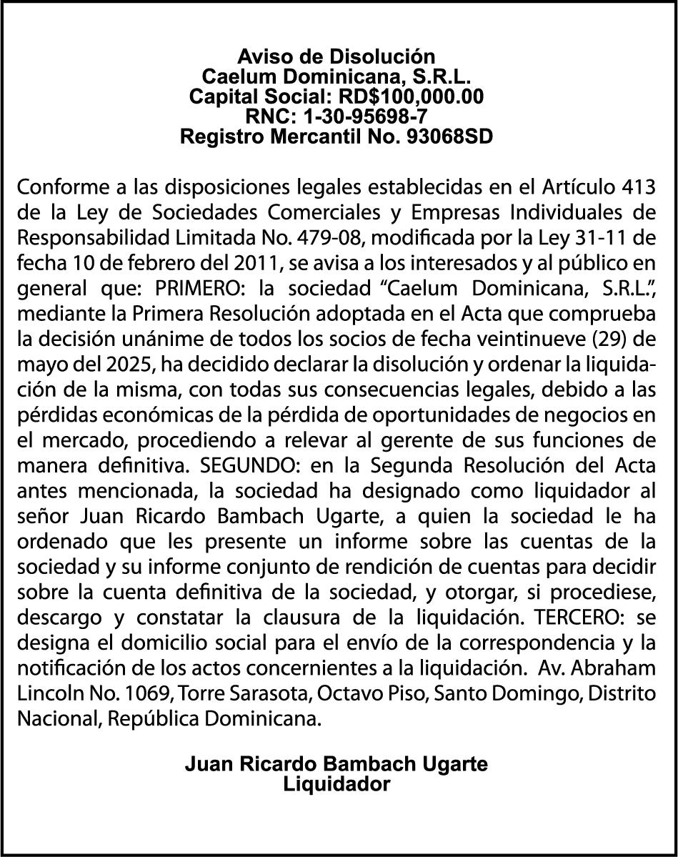 SE hace de público conocimiento la pérdida del Certificado Financiero número 841140668 emitido por Banco Popular Dominicano, S. A. Banco Múltiple, a nombre de DILIA MARGARITA LLUBERES RODRIGUEZ, portadora de la Cédula de Identidad y Electoral número 001-1717940-8, certificado número 841140668 expedido en fecha 6 de mayo de 2024 por el monto de (RD$108,479.57) más intereses generados a la fecha.