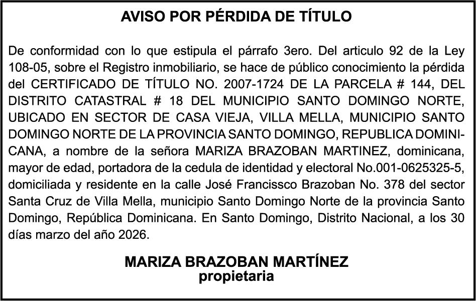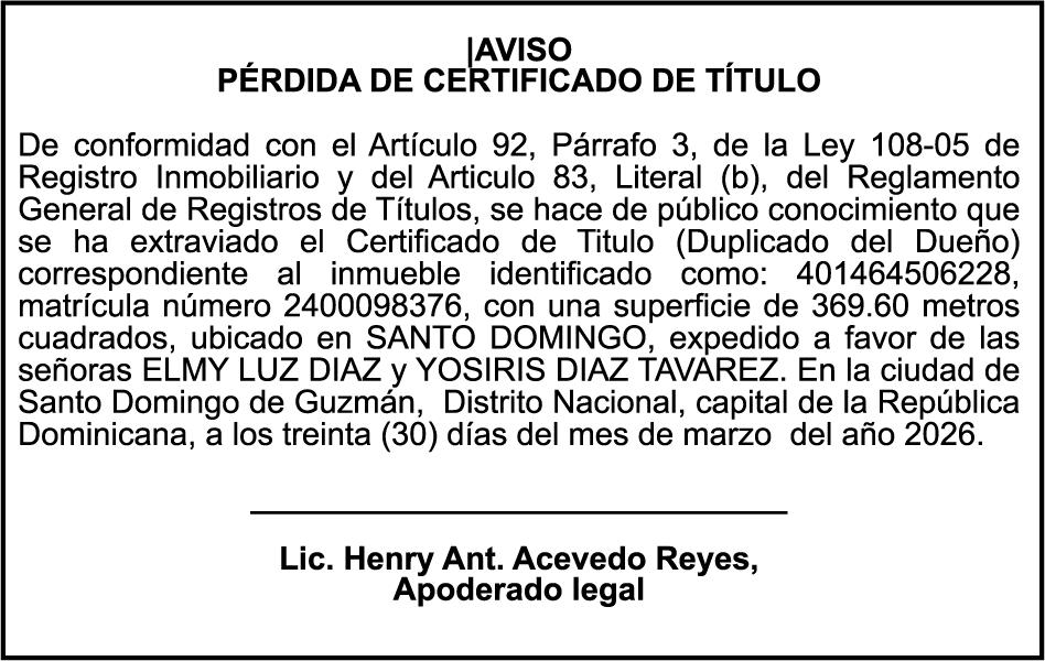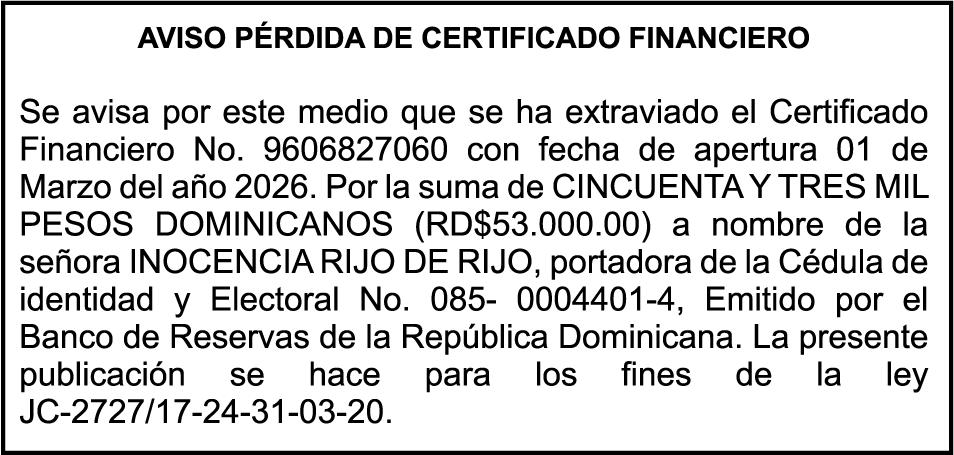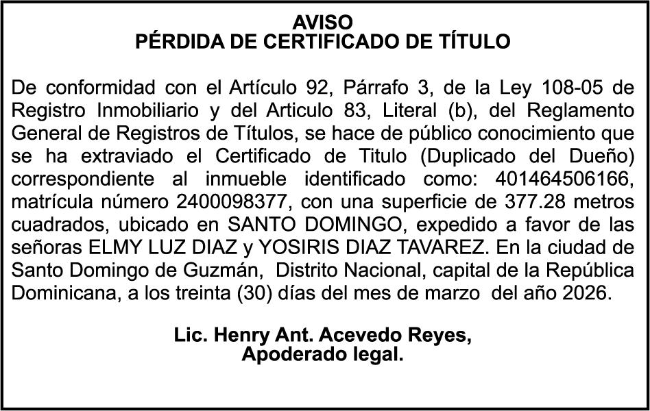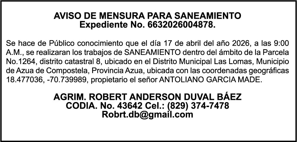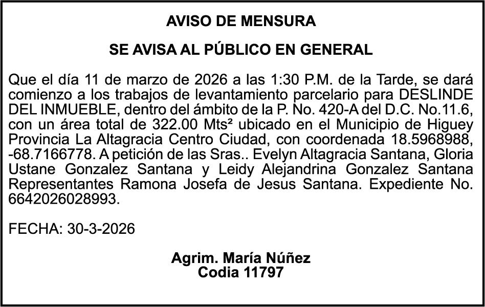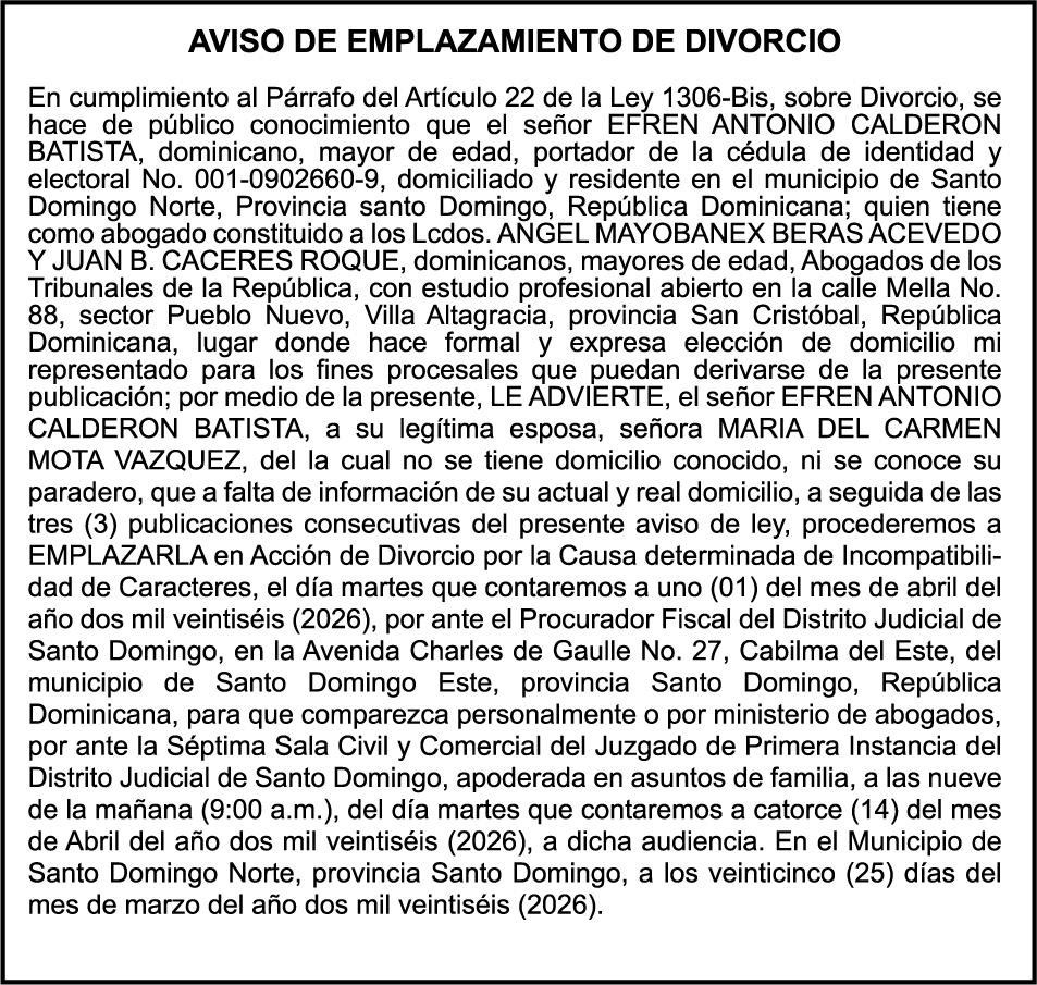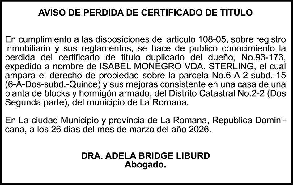 AVISO TRASPASO DE EMBARCACION.La señora DULCE ELENIA SANTANA DE BAEZ, traspasa el bote de pescade nombre ;WAIDY-4” matricula No. BP-W22-1618LR, de 31.0 pies de eslora, para queen lo adelante figure a nombre de la señora SELENA RODRIGUEZ DE LA ROSA , como nueva propietaria.