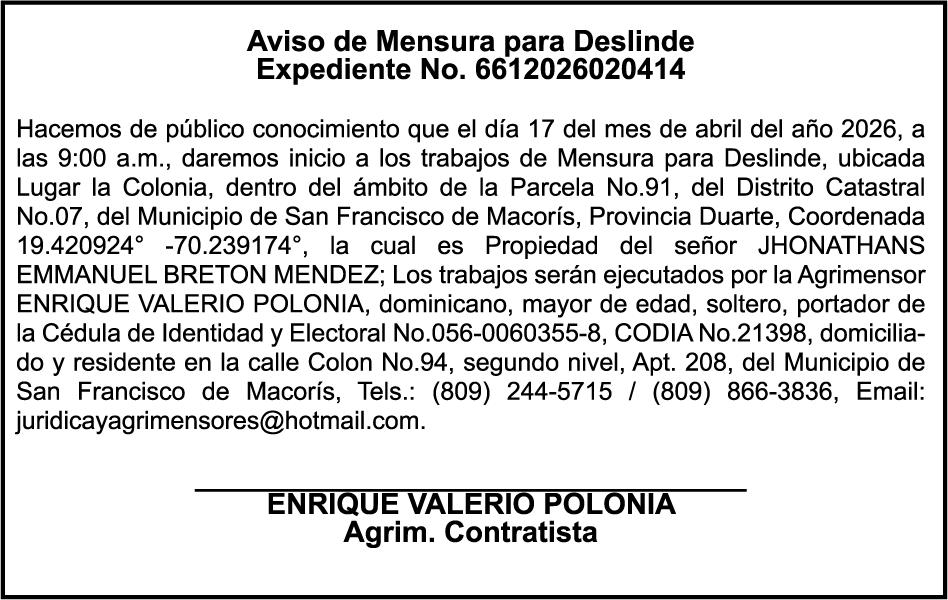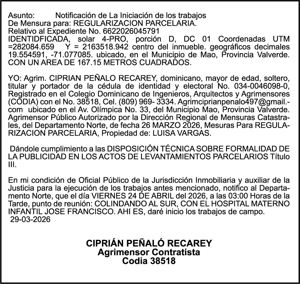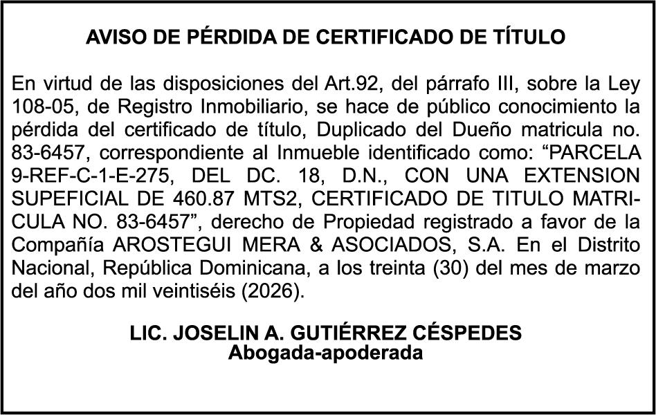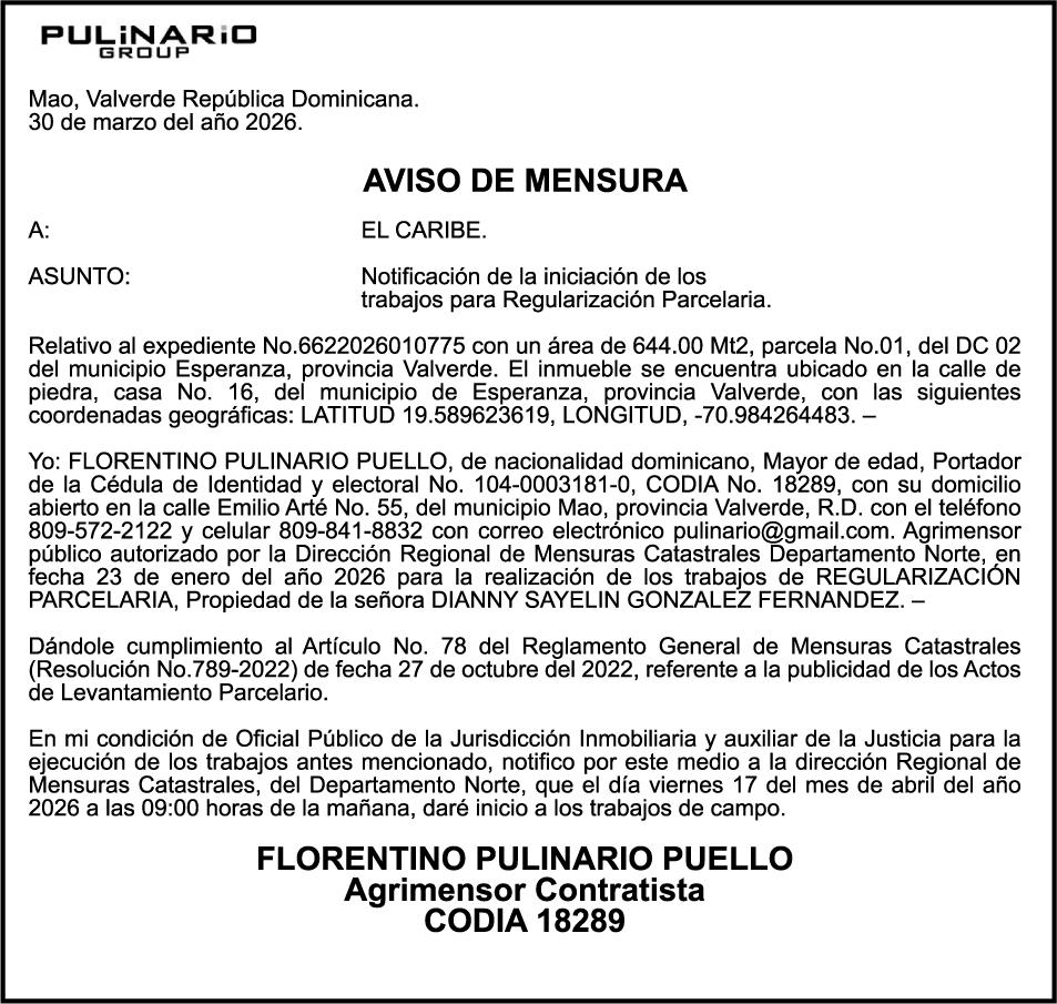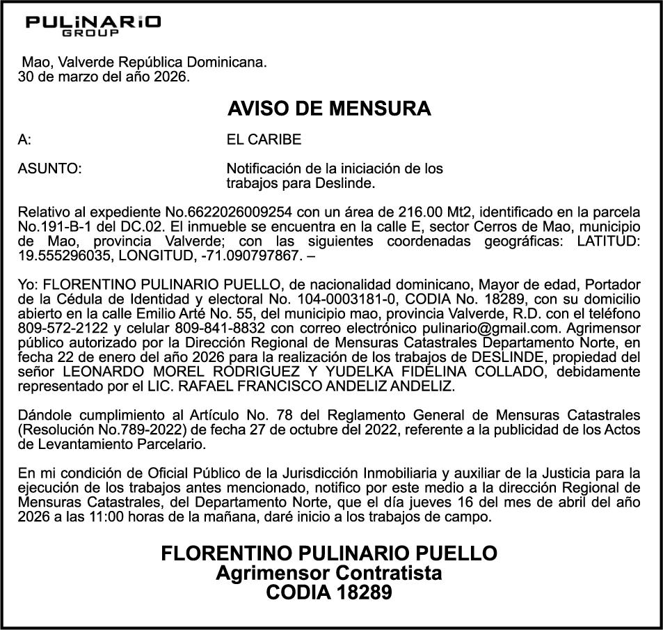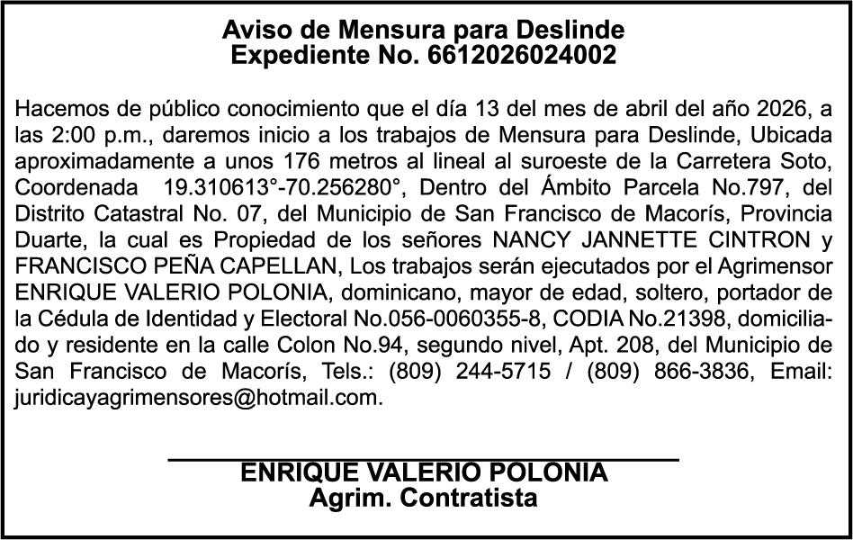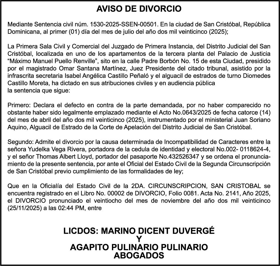 AVISO TRASPASO DE EMBARCACION.La señora DULCE ELENIA SANTANA DE BAEZ, traspasa el bote de pescade nombre ;WAIDY-4” matricula No. BP-W22-1618LR, de 31.0 pies de eslora, para queen lo adelante figure a nombre de la señora SELENA RODRIGUEZ DE LA ROSA , como nueva propietaria.