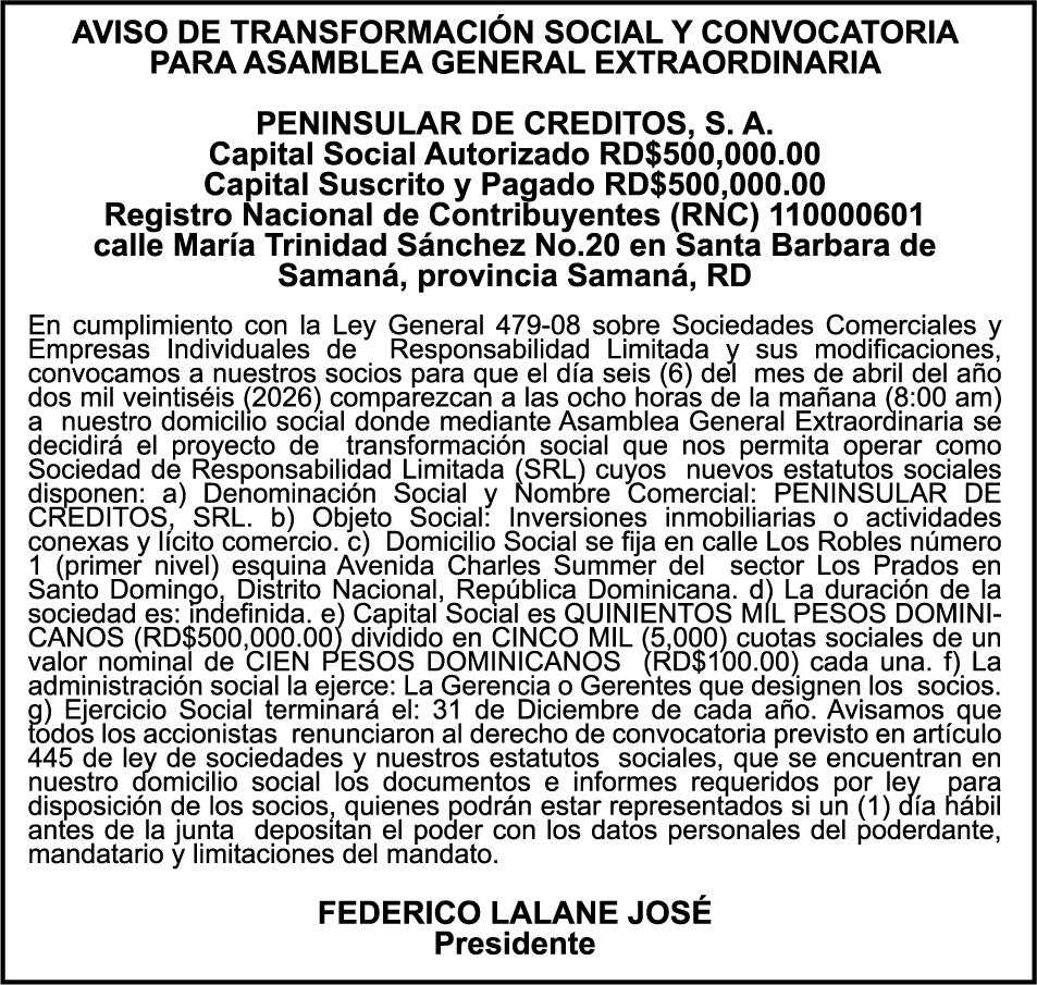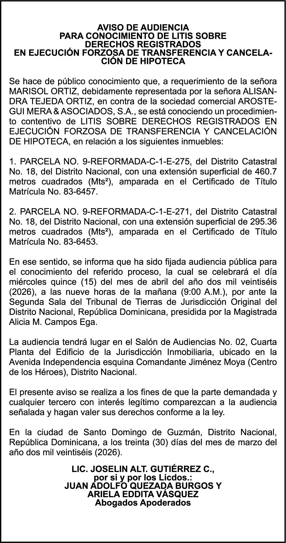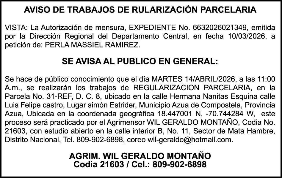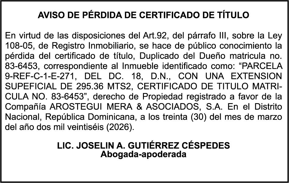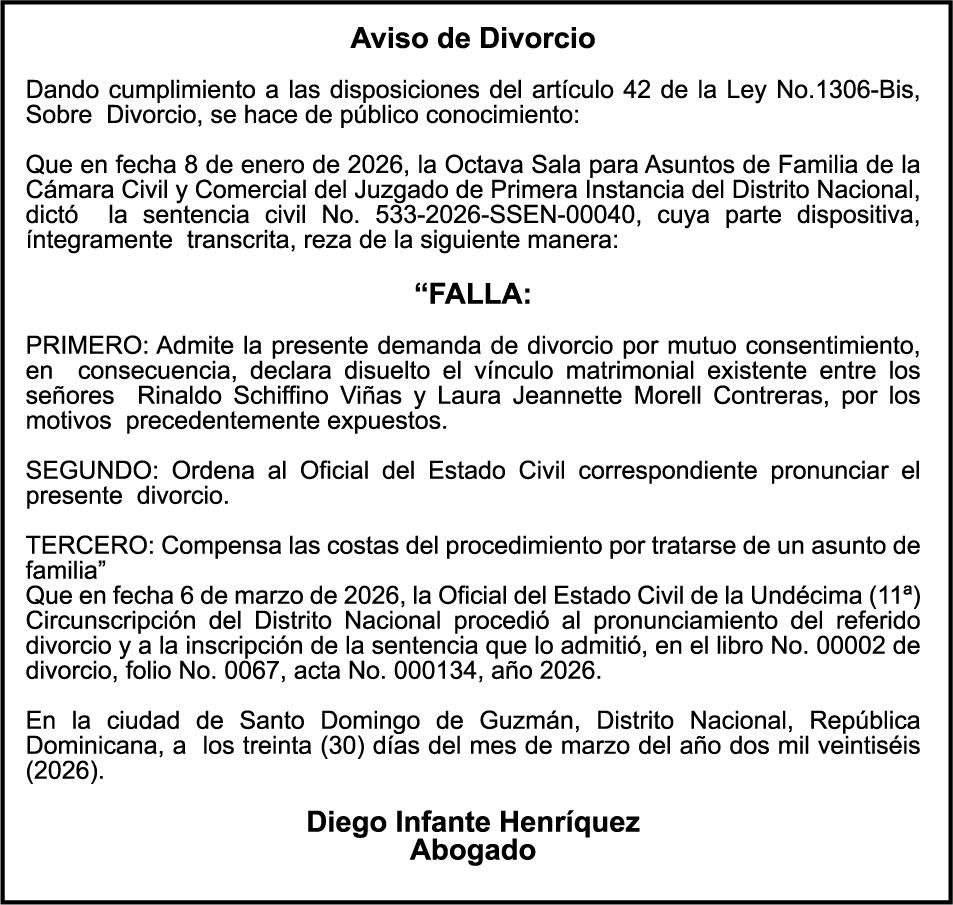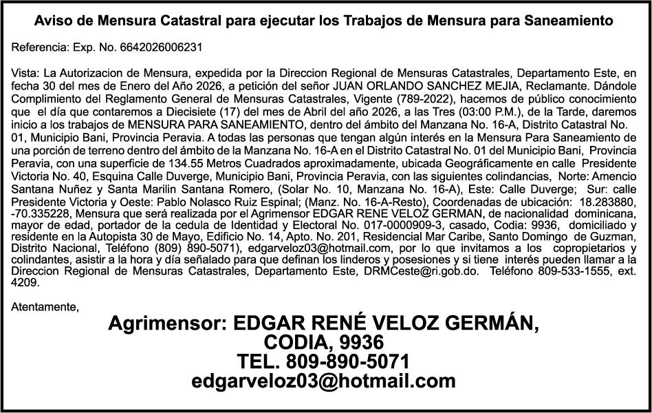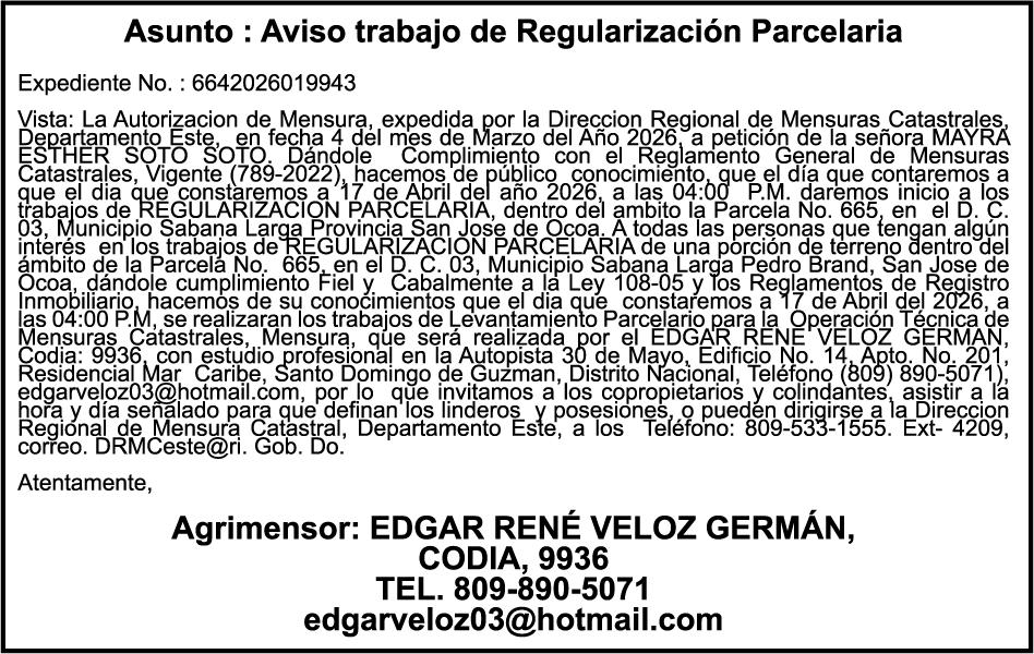 AVISO TRASPASO DE EMBARCACION.La señora DULCE ELENIA SANTANA DE BAEZ, traspasa el bote de pescade nombre ;WAIDY-4” matricula No. BP-W22-1618LR, de 31.0 pies de eslora, para queen lo adelante figure a nombre de la señora SELENA RODRIGUEZ DE LA ROSA , como nueva propietaria.