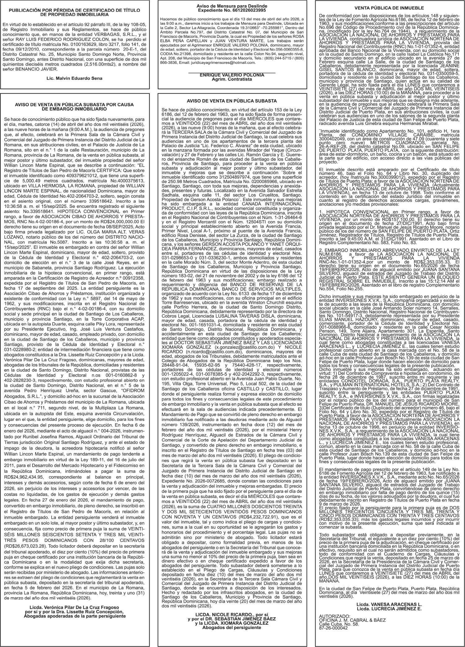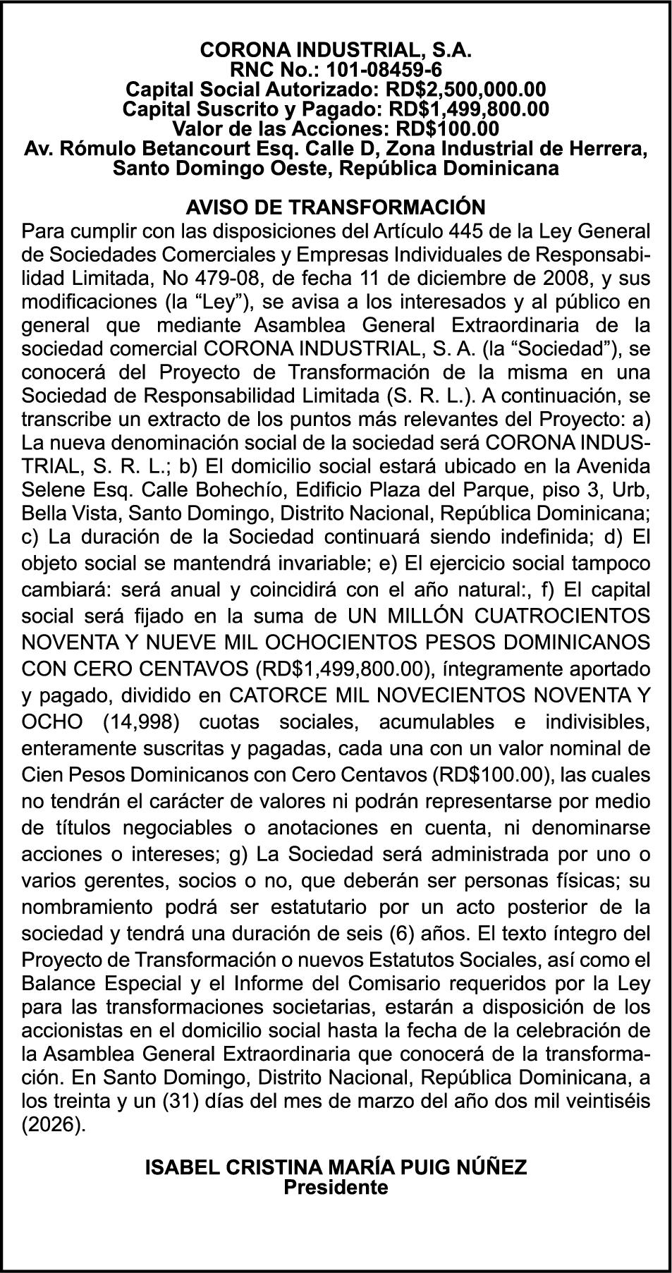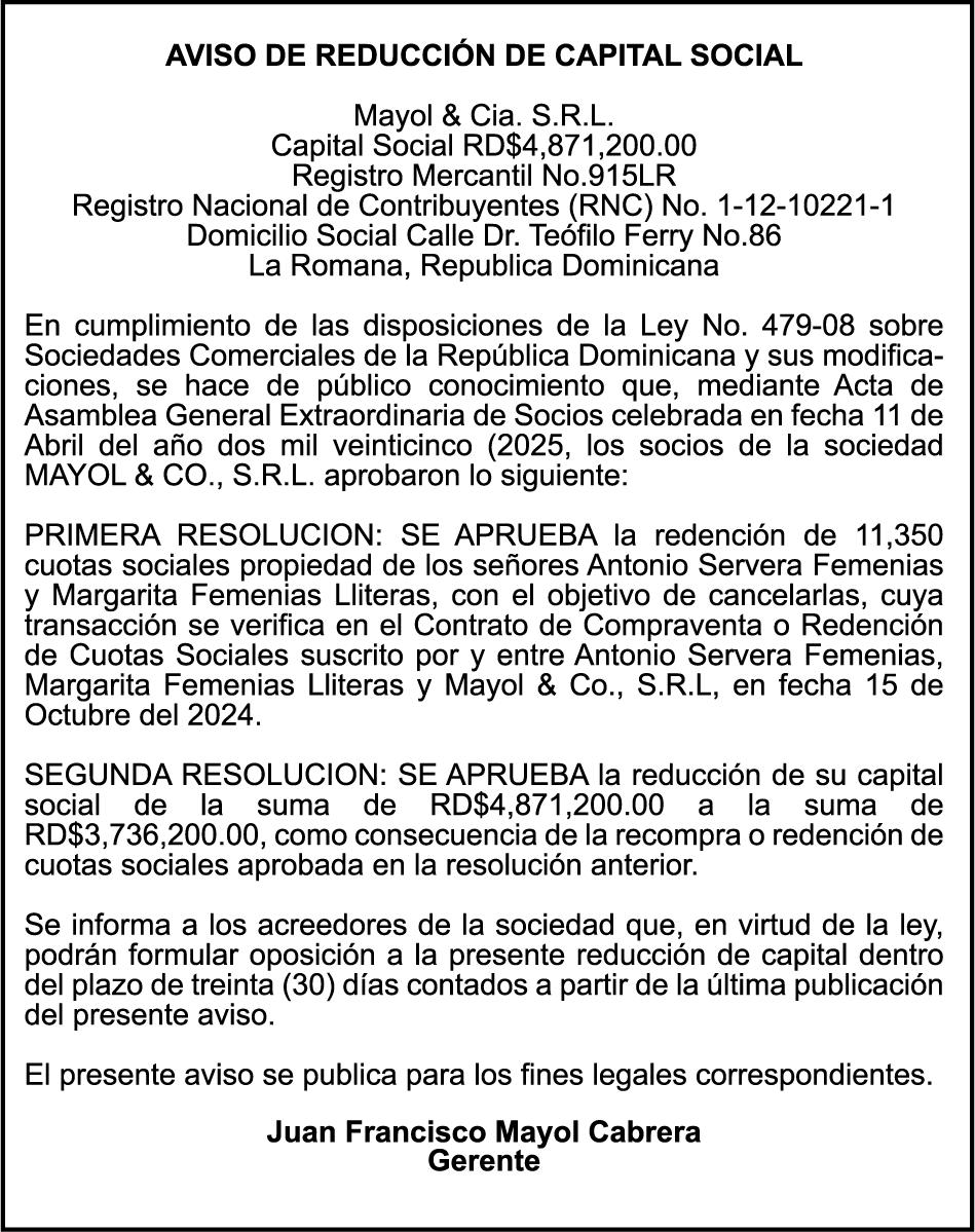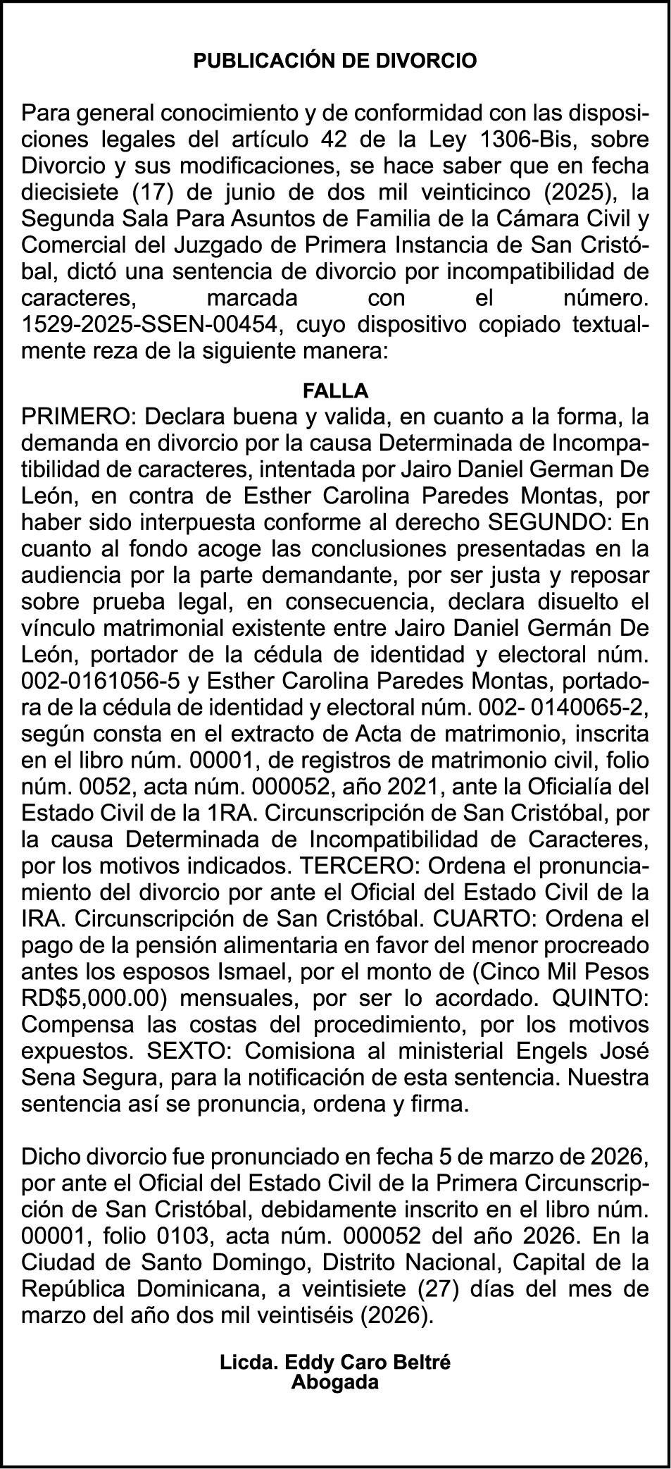 AVISO TRASPASO DE EMBARCACION.La señora DULCE ELENIA SANTANA DE BAEZ, traspasa el bote de pescade nombre ;WAIDY-4” matricula No. BP-W22-1618LR, de 31.0 pies de eslora, para queen lo adelante figure a nombre de la señora SELENA RODRIGUEZ DE LA ROSA , como nueva propietaria.