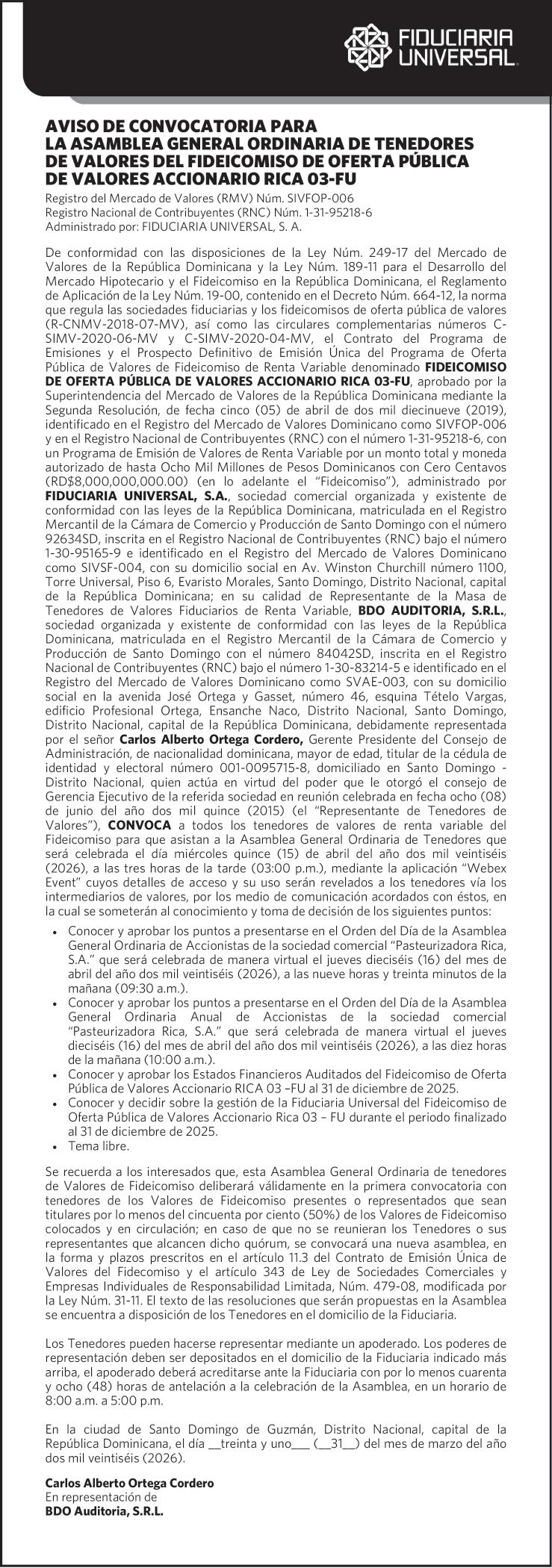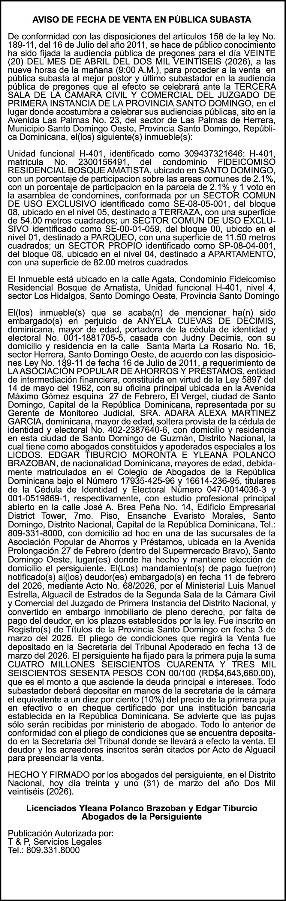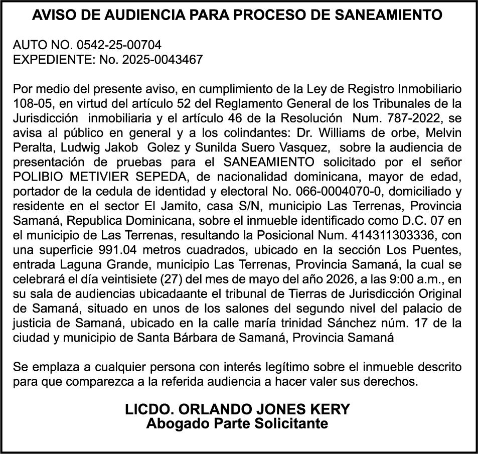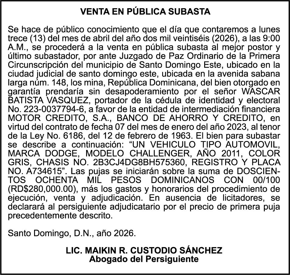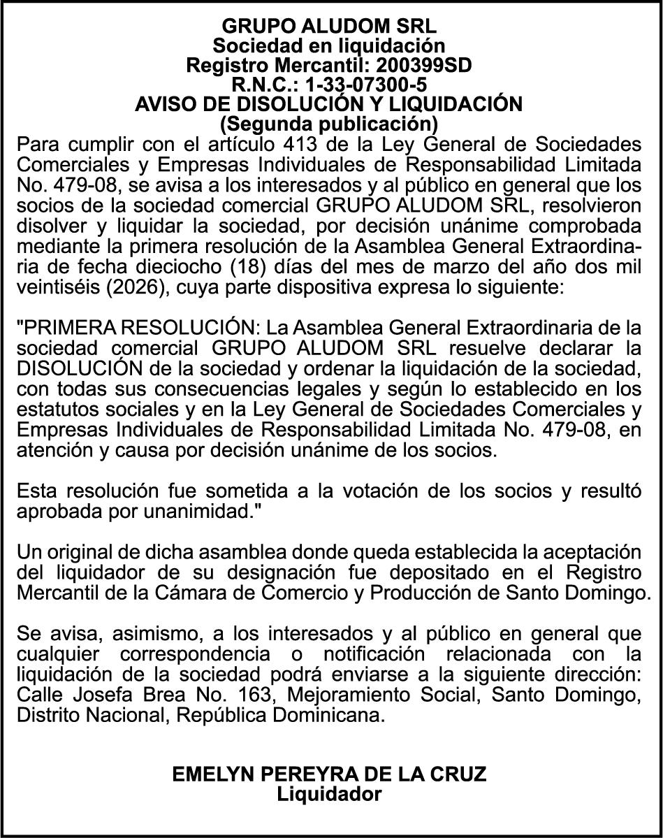 AVISO TRASPASO DE EMBARCACION.La señora DULCE ELENIA SANTANA DE BAEZ, traspasa el bote de pescade nombre ;WAIDY-4” matricula No. BP-W22-1618LR, de 31.0 pies de eslora, para queen lo adelante figure a nombre de la señora SELENA RODRIGUEZ DE LA ROSA , como nueva propietaria.