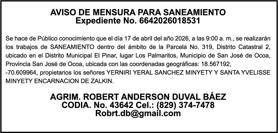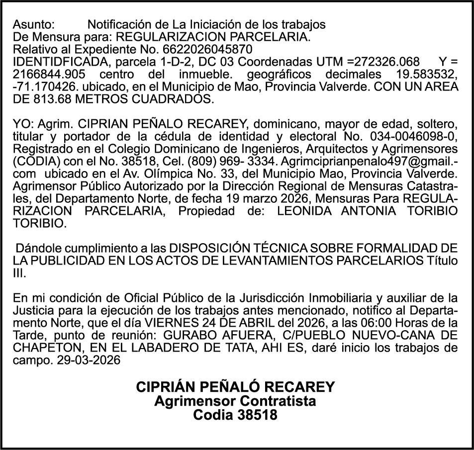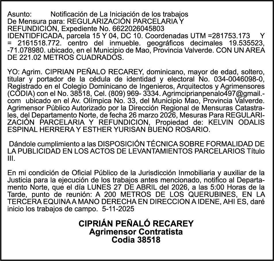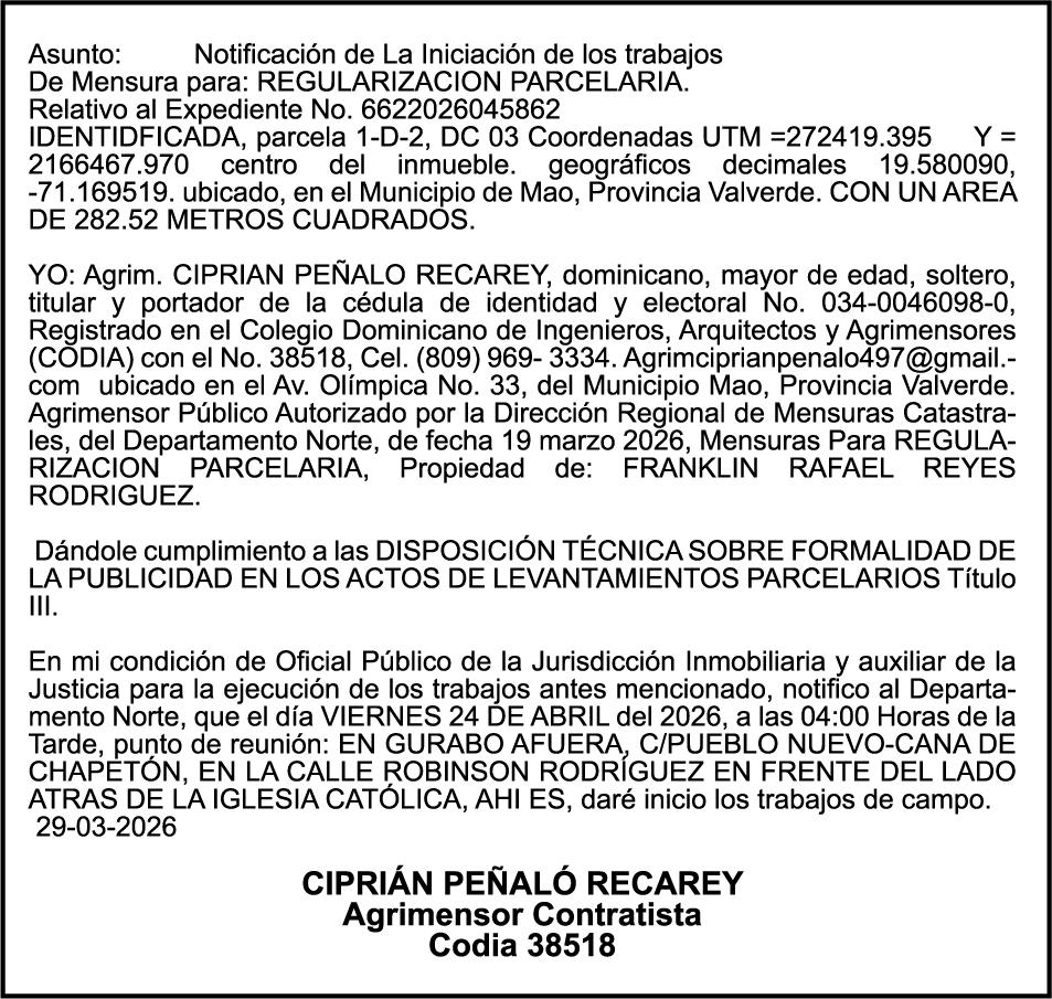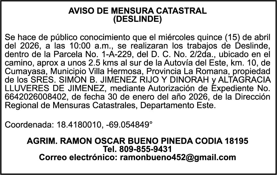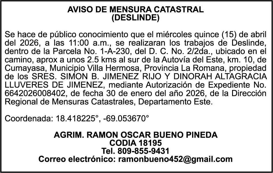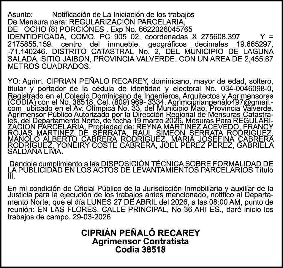 AVISO TRASPASO DE EMBARCACION.EL señor MARTIN CASTRO HENRIQUEZ, traspasa el bote de pesca denombre;CONFIO EN DIOS” matricula No. BP-C120-1748LR, de 29.0 pies de eslora,para que en lo adelante figure a nombre del señor JEFERSON ELIAS RODRIGUEZ DE LA ROSA ,como nuevo propietario.