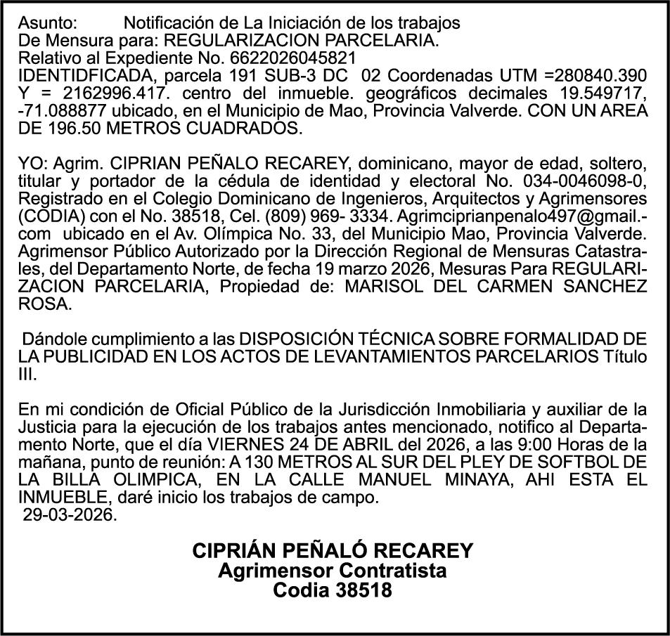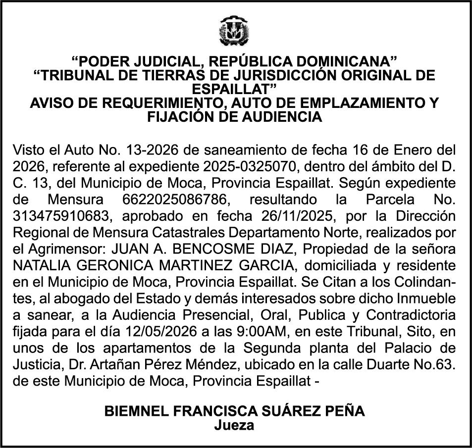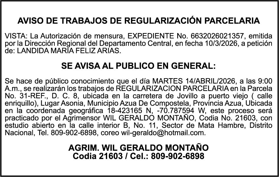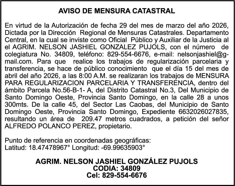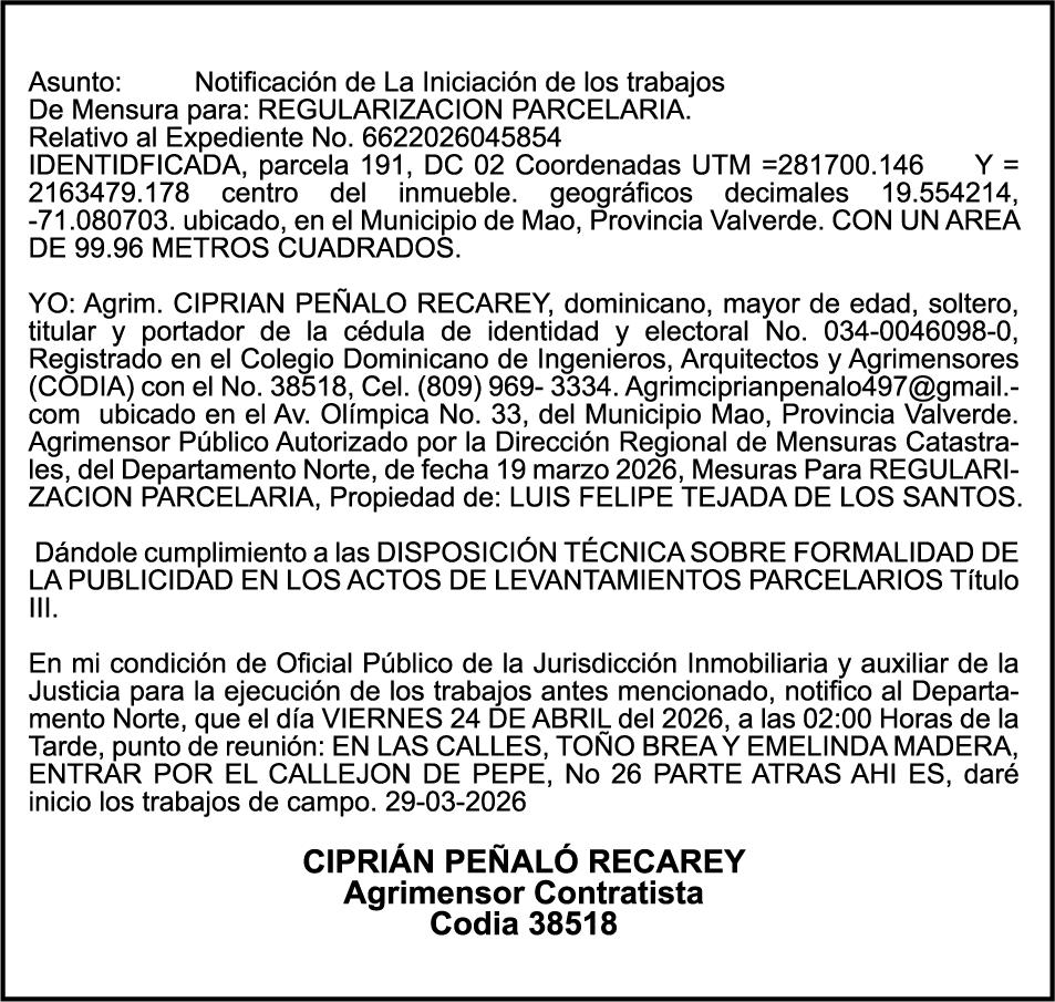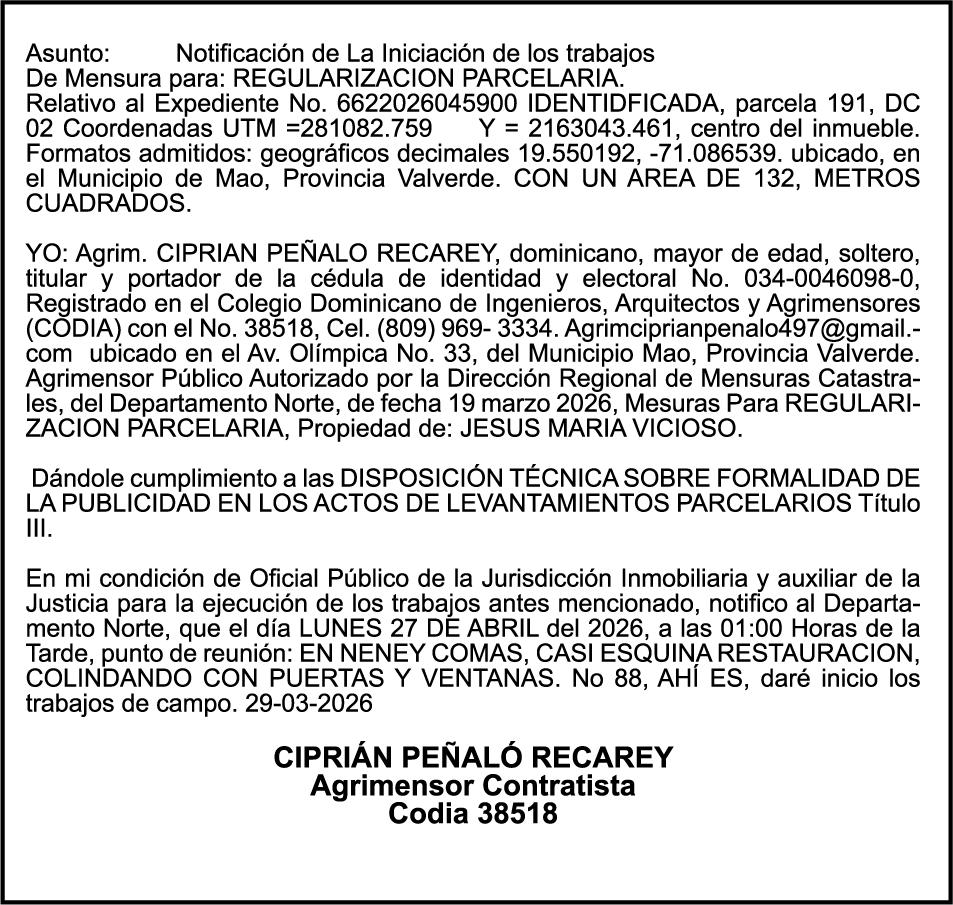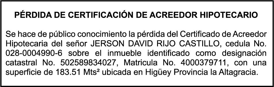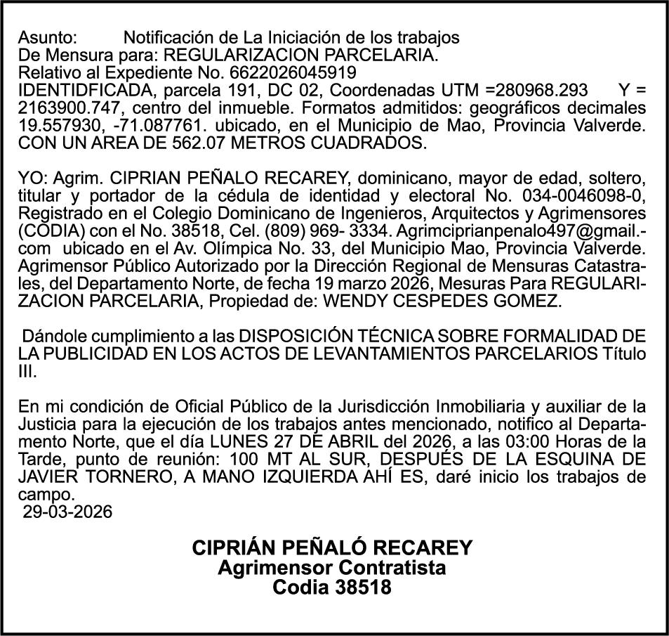 AVISO TRASPASO DE EMBARCACION.EL señor MARTIN CASTRO HENRIQUEZ, traspasa el bote de pesca denombre;CONFIO EN DIOS” matricula No. BP-C120-1748LR, de 29.0 pies de eslora,para que en lo adelante figure a nombre del señor JEFERSON ELIAS RODRIGUEZ DE LA ROSA ,como nuevo propietario.