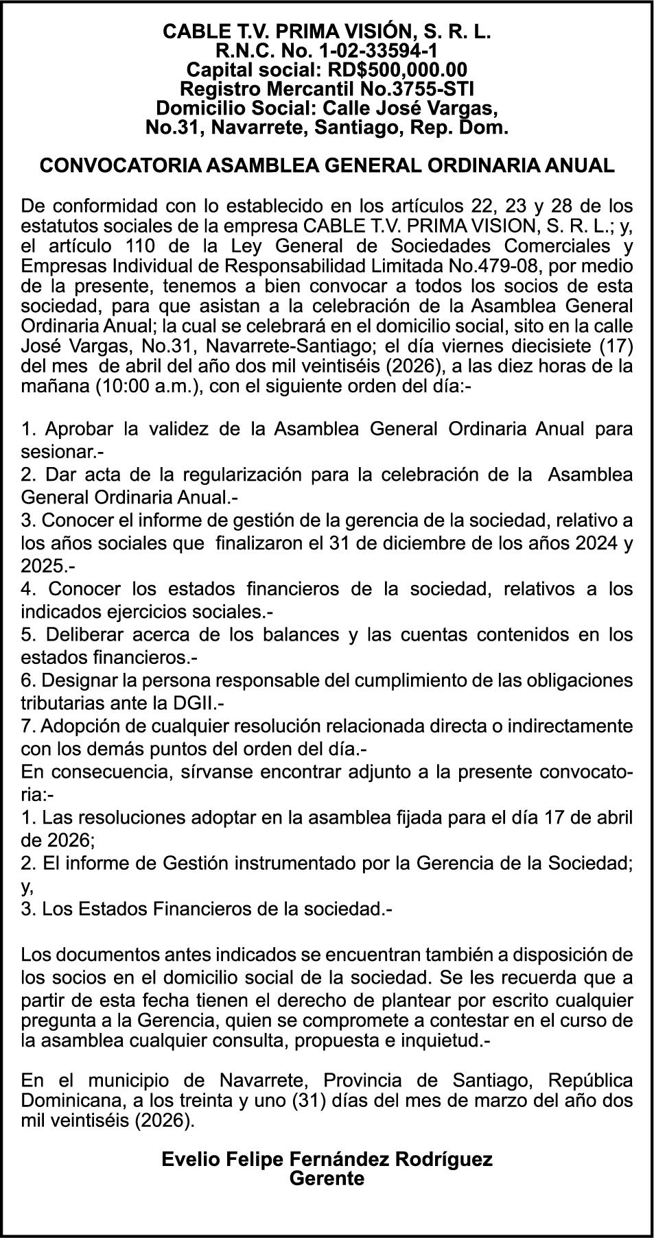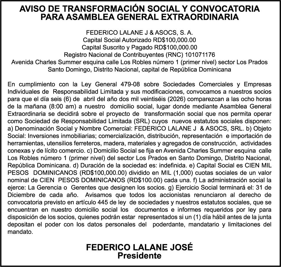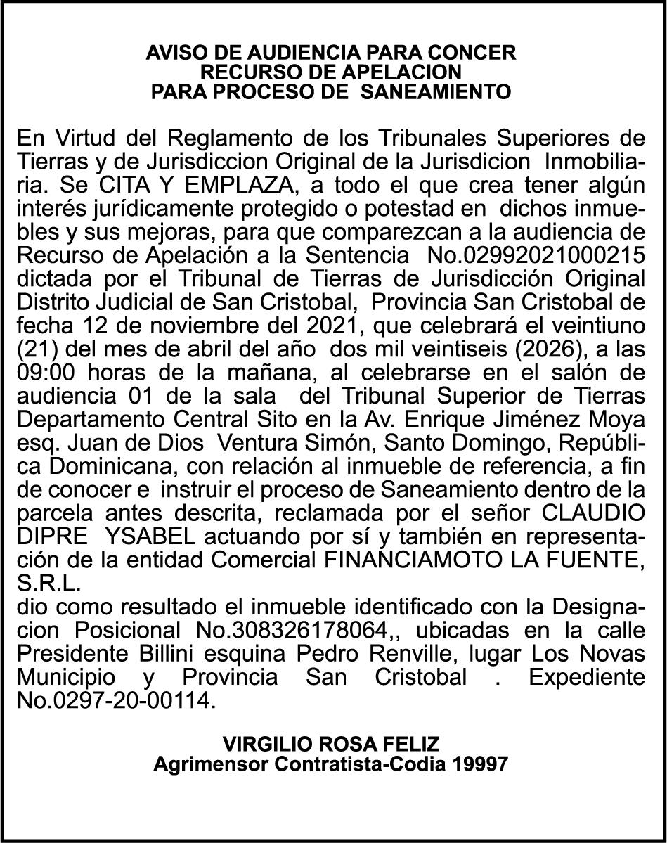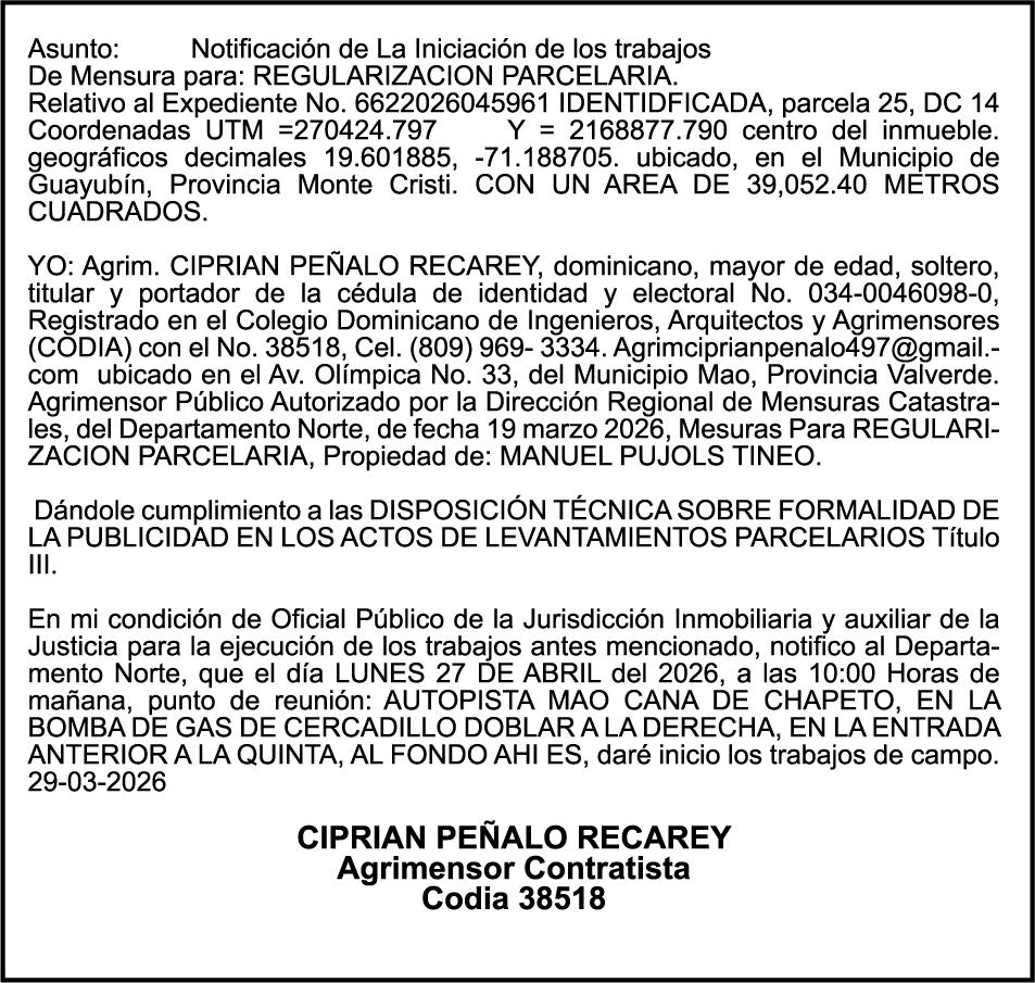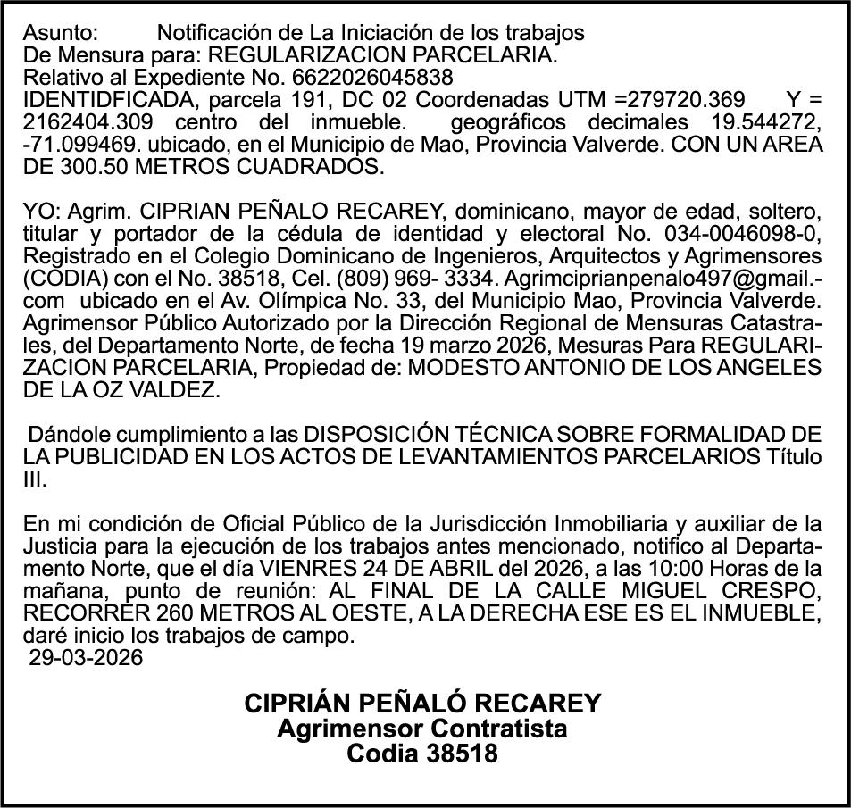 AVISO TRASPASO DE EMBARCACION.EL señor MARTIN CASTRO HENRIQUEZ, traspasa el bote de pesca denombre;CONFIO EN DIOS” matricula No. BP-C120-1748LR, de 29.0 pies de eslora,para que en lo adelante figure a nombre del señor JEFERSON ELIAS RODRIGUEZ DE LA ROSA ,como nuevo propietario.