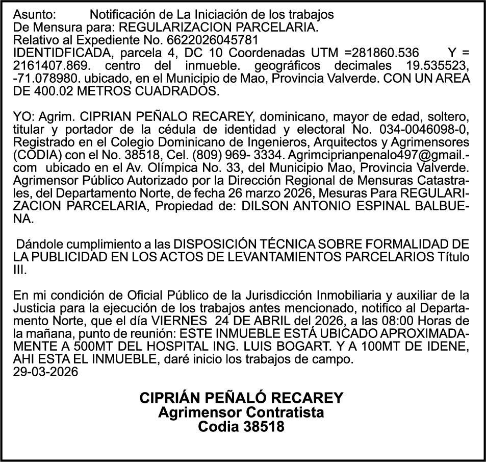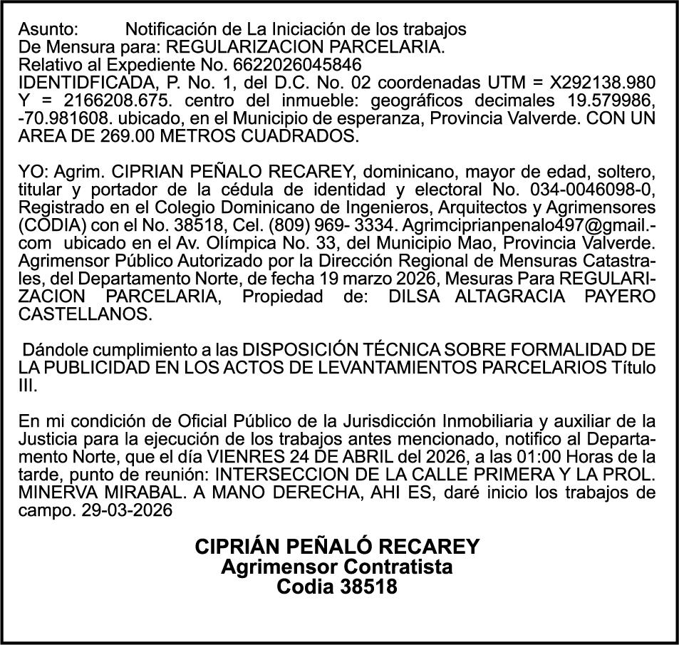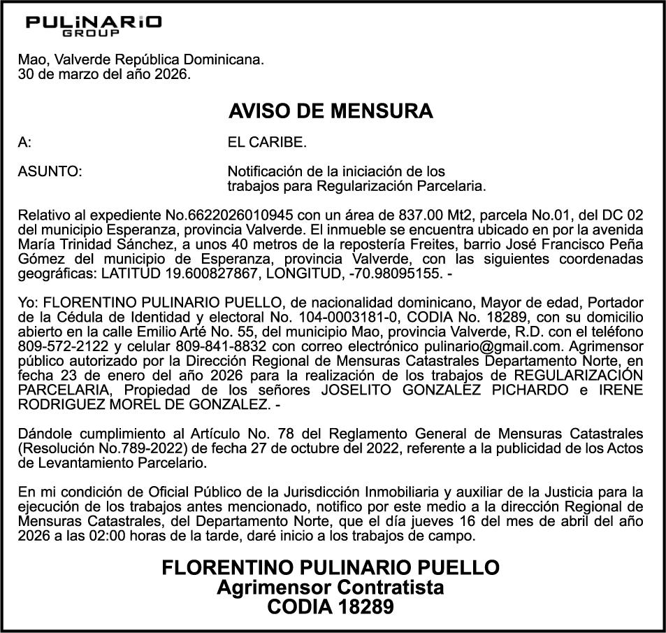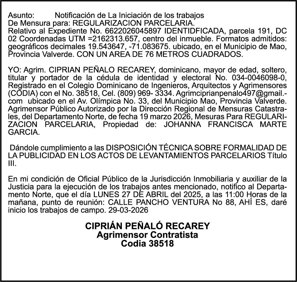 AVISO TRASPASO DE EMBARCACION.EL señor JULIO ANTONIO PACHE GARCIA, traspasa el bote de pesca denombre ;SUR MAR-1” matricula No. BP-S140-1697LR, de 22.5 pies de eslora, para queen lo adelante figure a nombre de la señora ORFELIA DE LA ROSA DE RODRIGUEZ , como nueva propietaria.
