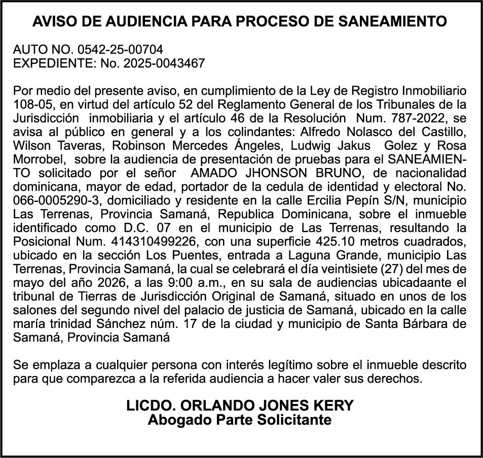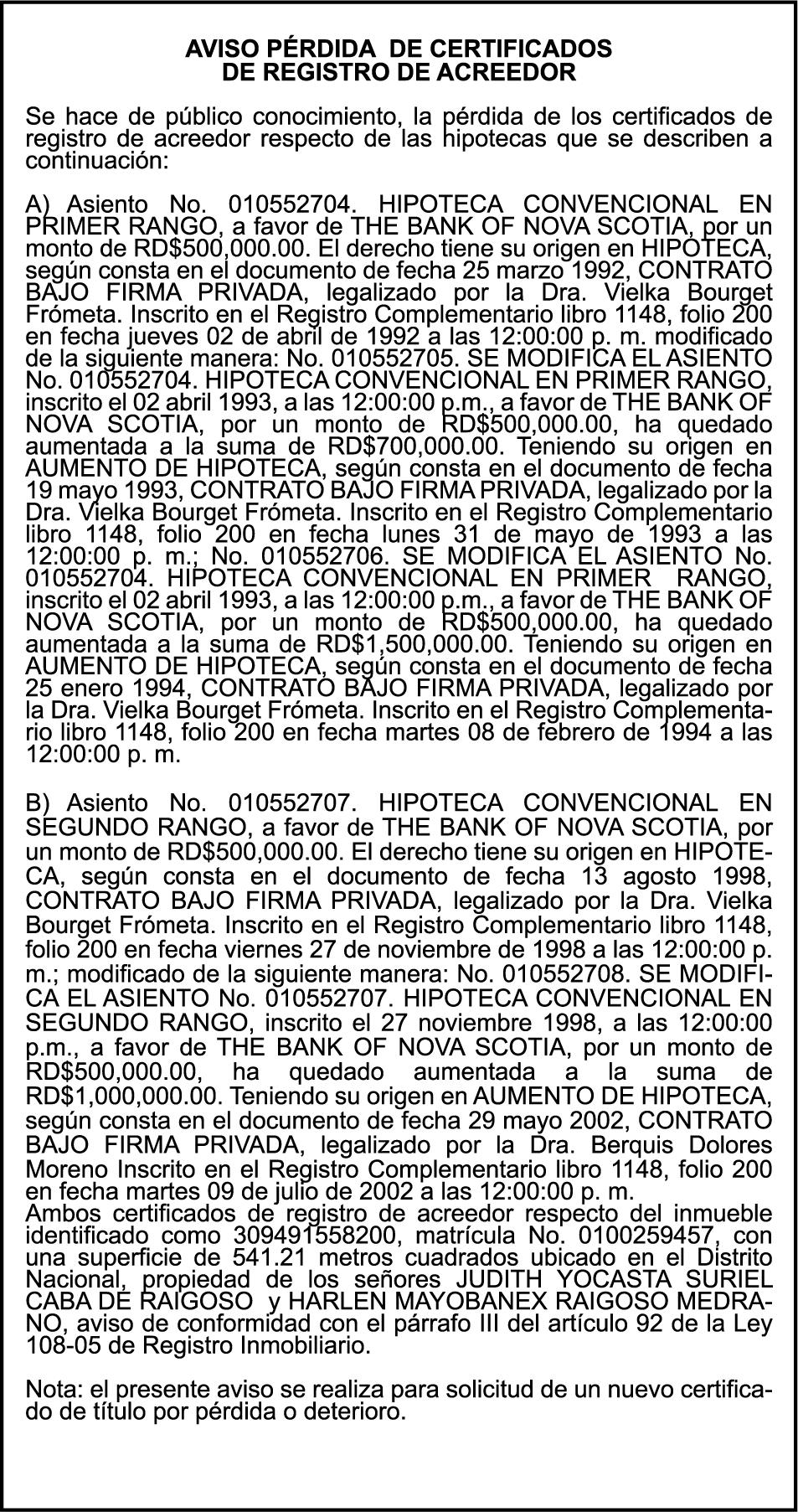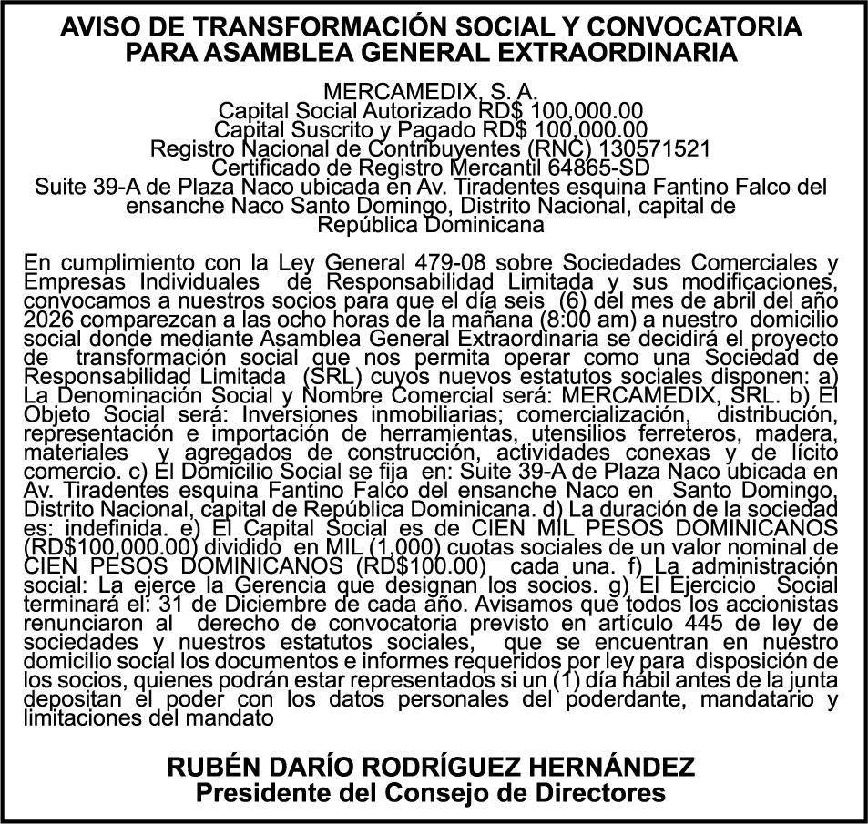 AVISO TRASPASO DE EMBARCACION.EL señor CAONABO CACERES MEJIA, traspasa el bote de recreo de nombre;NAOMI” matricula No. BR-N51-1796LR, de 22.0 pies de eslora, para que en lo adelante figure a nombre del señor ELIAS RODRIGUEZ DOROTEO , como nuevo propietario.
