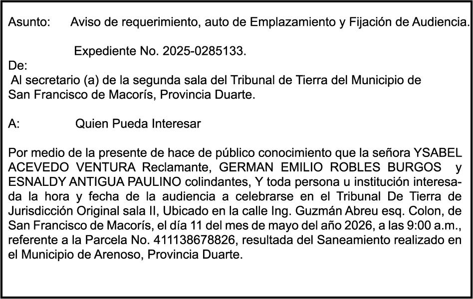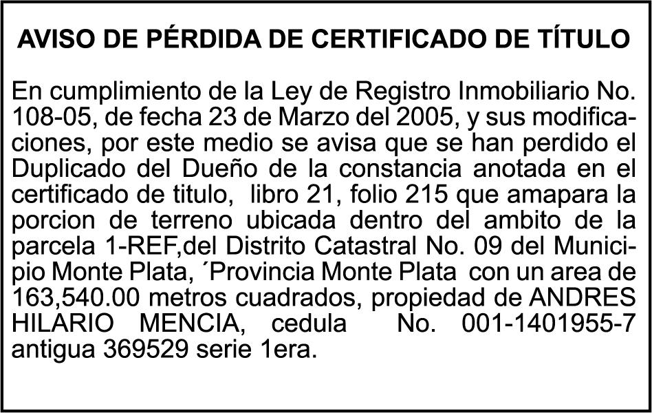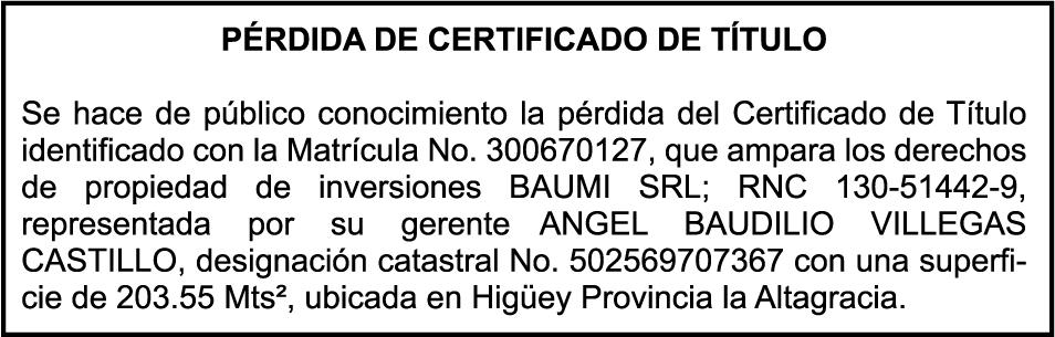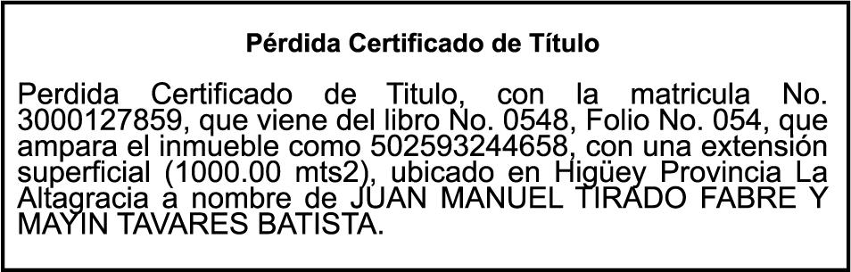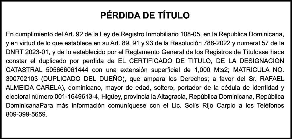 AVISO TRASPASO DE EMBARCACION.La señora DULCE ELENIA SANTANA DE BAEZ, traspasa el bote de pescade nombre ;WAIDY-5” matricula No. BP-W23-1654LR, de 33.0 pies de eslora, para queen lo adelante figure a nombre de la señora SELENA RODRIGUEZ DE LA ROSA , como nueva propietaria.