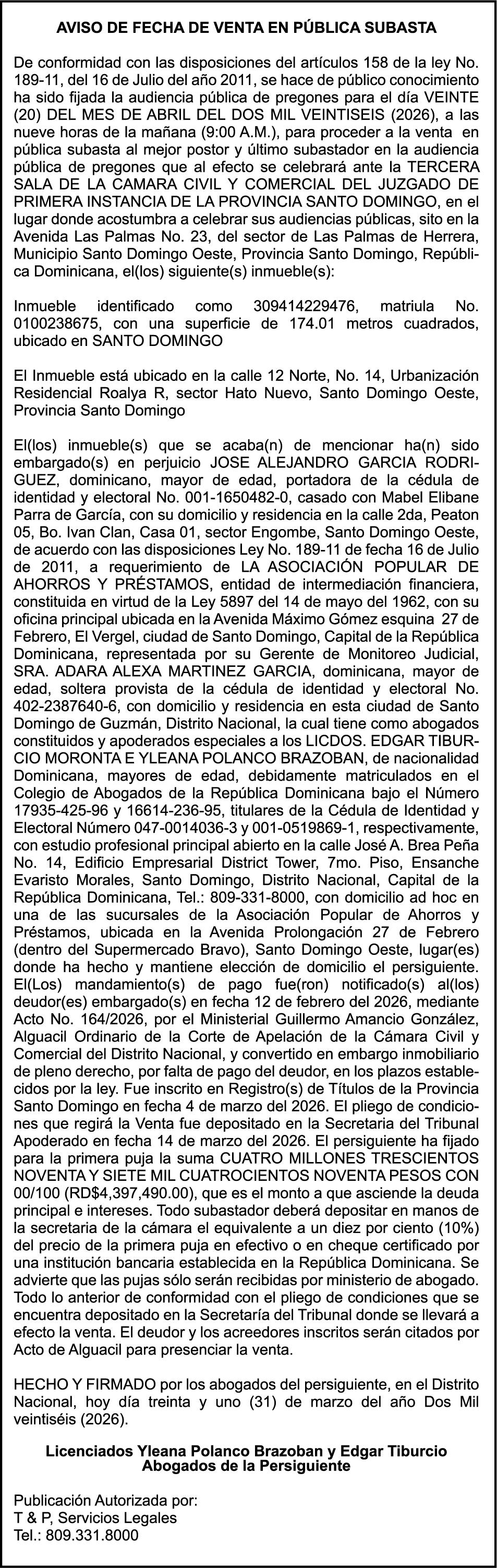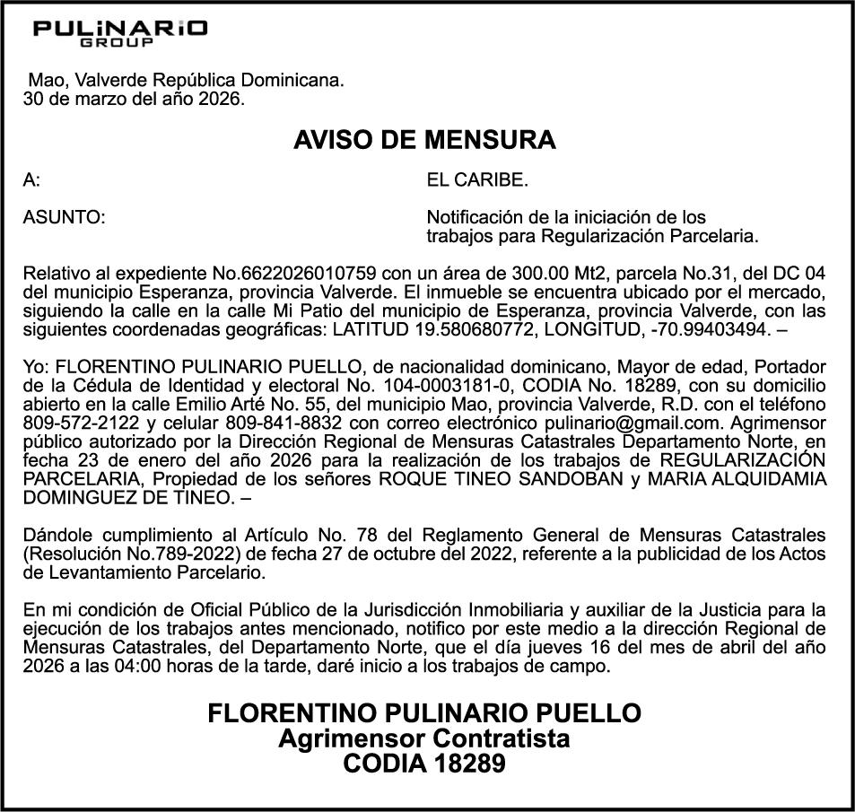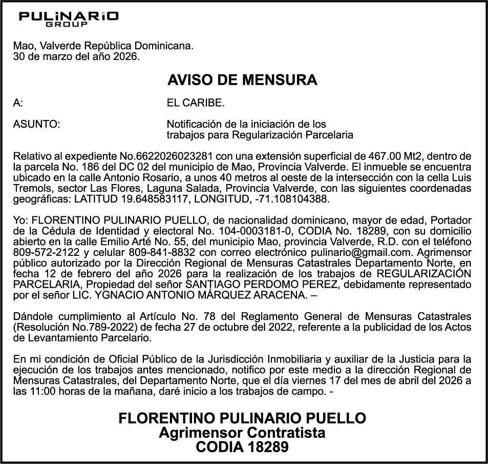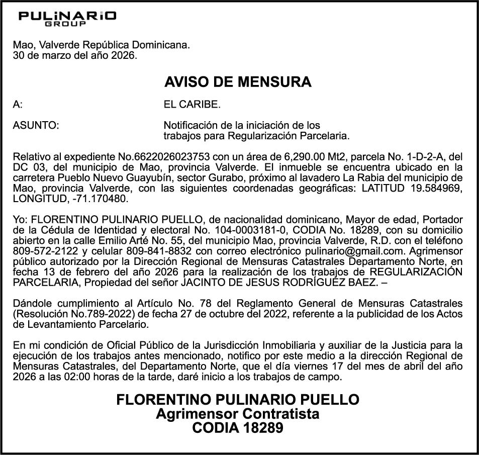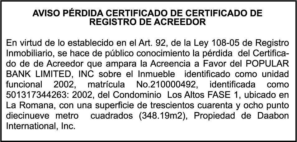AVISO TRASPASO DE EMBARCACION.EL señor JULIO ANTONIO PACHE GARCIA, traspasa el bote de pesca denombre SUR MAR-2” matricula No. BP-S141-1698LR, de 22.5 pies de eslora, para queen lo adelante figure a nombre de la señora ORFELIA DE LA ROSA DE RODRIGUEZ , como nueva propietaria.