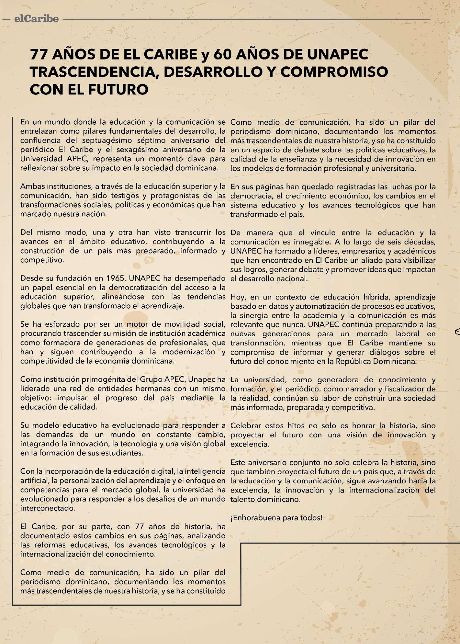 Lo decimos con satisfacción en este septuagésimo séptimo aniversario, de la mano de los ingenieros Manuel Estrella y Félix M. García, empresarios santiagueros que han apostado para que El Caribe continúe como portaestandarte de las mejores causas.