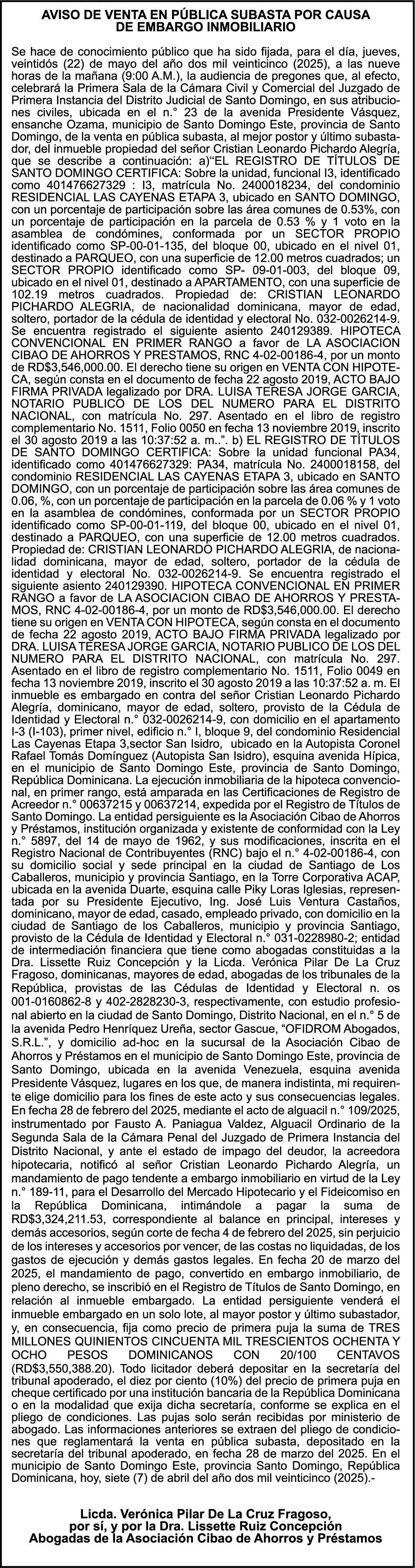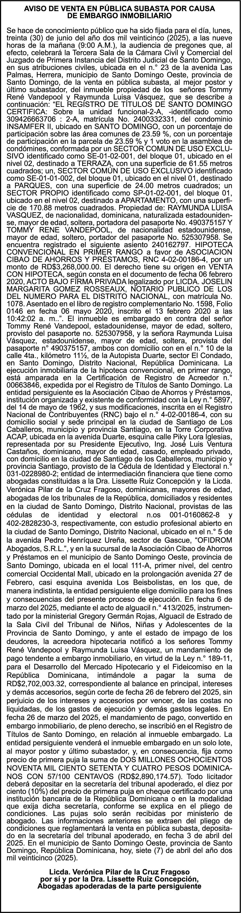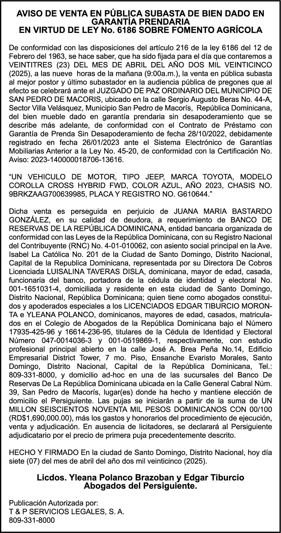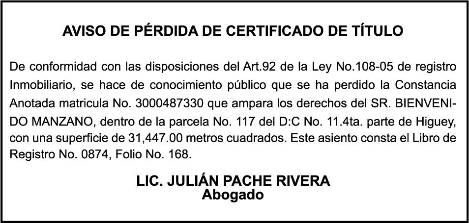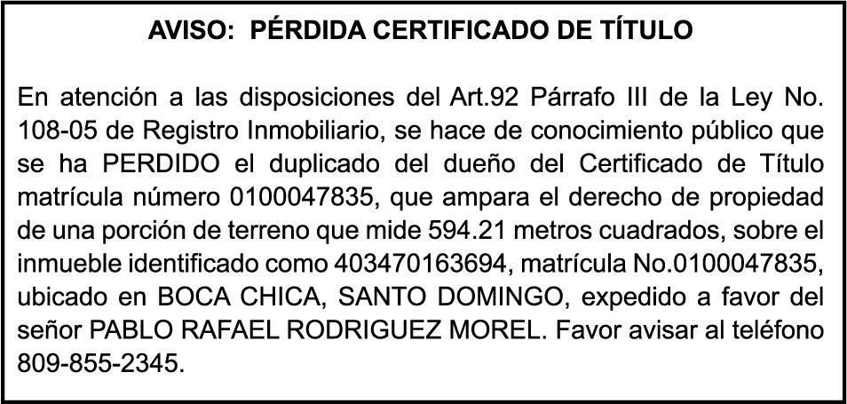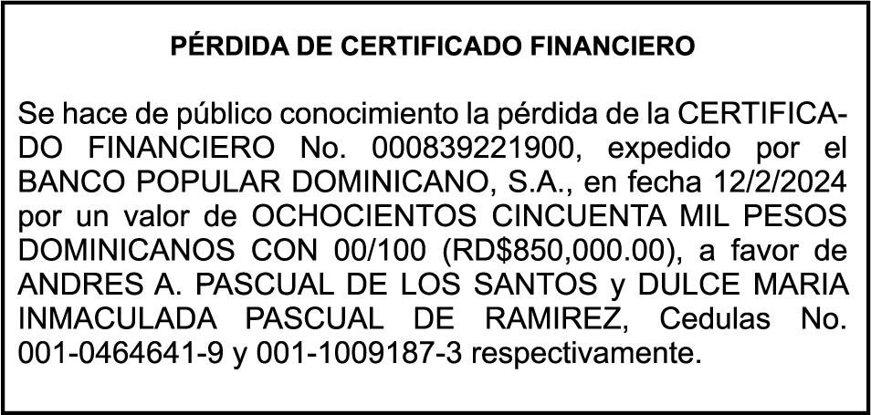 SE hace de público conocimiento la pérdida del Certificado Financiero número 834650848emitido por Banco Popular Dominicano, S. A. Banco Múltiple, a nombre de MILADY ALTAGRACIA VILLAMAN MORROBEL , portadora de la Cédula de Identidad y Electoral número 001-0211098-8 y CAROLINA ESMERALDA CUETO VILLAMAN, portadora de la Cédula de Identidad y Electoral número 001-1272979-3, certificado número 834650848, expedido en fecha 27 de junio de 2023 por el monto de (RD$600,000.00) más intereses generados a la fecha.