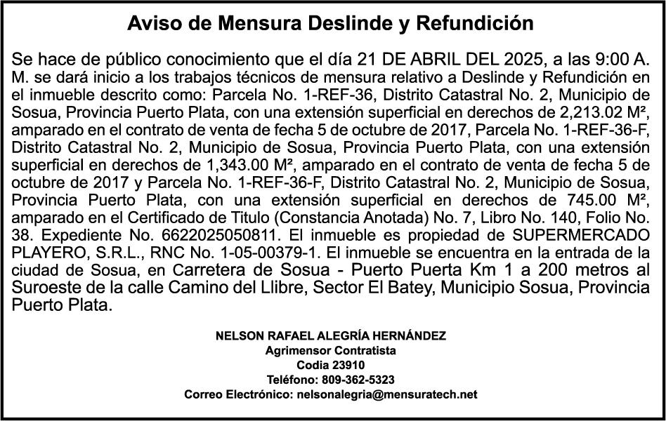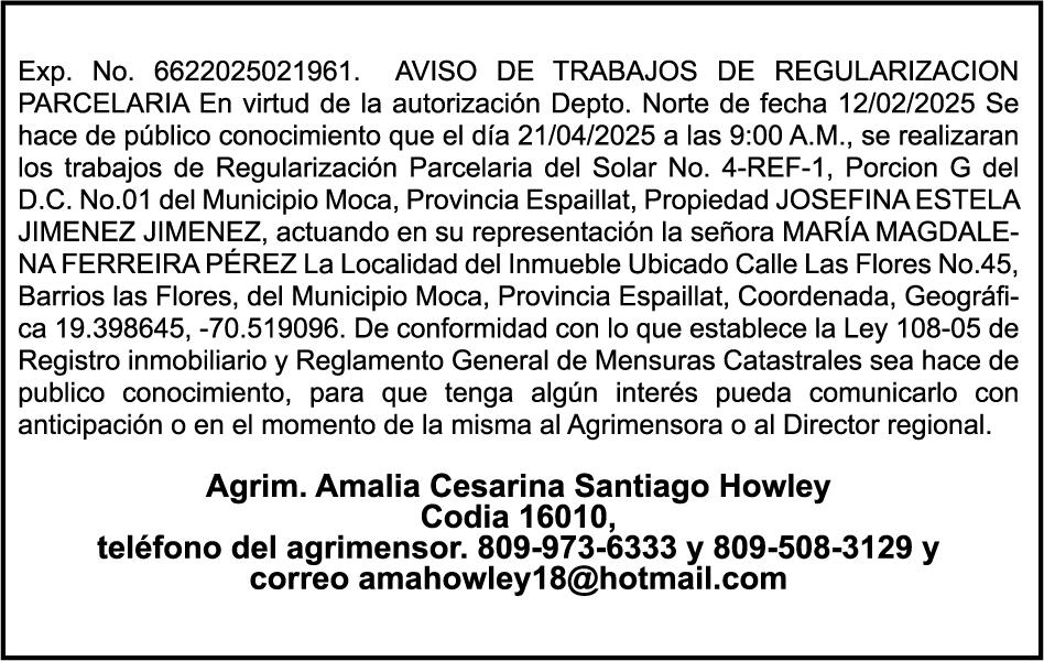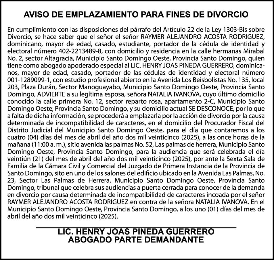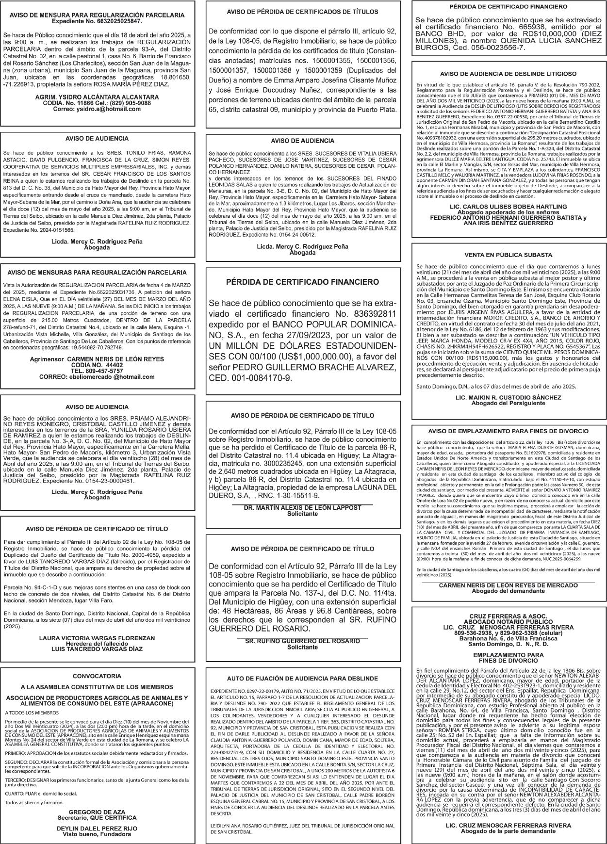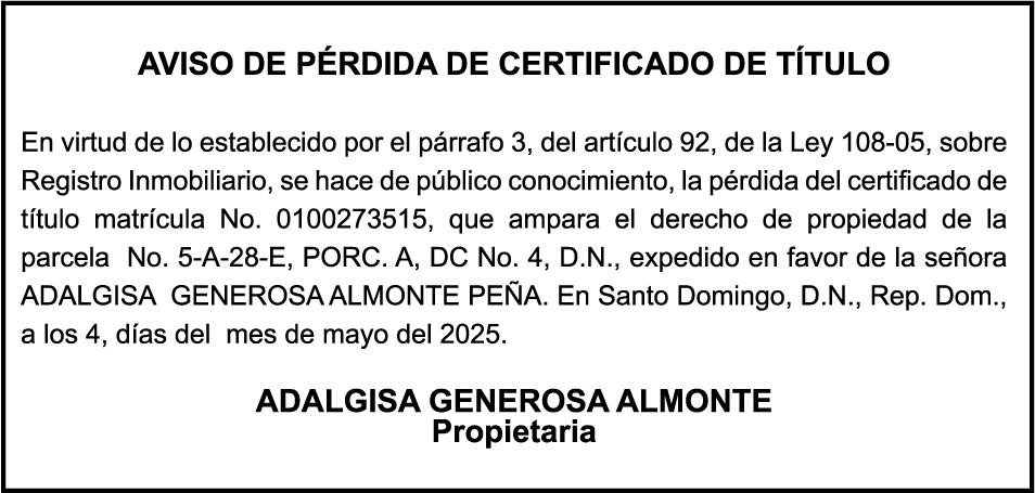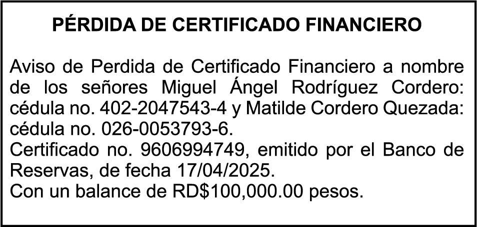 SE hace de público conocimiento la pérdida del Certificado Financiero número 835504838 emitido por Banco Popular Dominicano, S. A. Banco Múltiple, a nombre de ENSLY GRISELL GUILAMO CEBALLOS DE CASTILLO, portadora de la Cédula de Identidad y Electoral número 223-0039977-5, certificado número 835504838 expedido en fecha 10 de agosto de 2023 por el monto de (US$5,421.24) más intereses generados a la fecha.