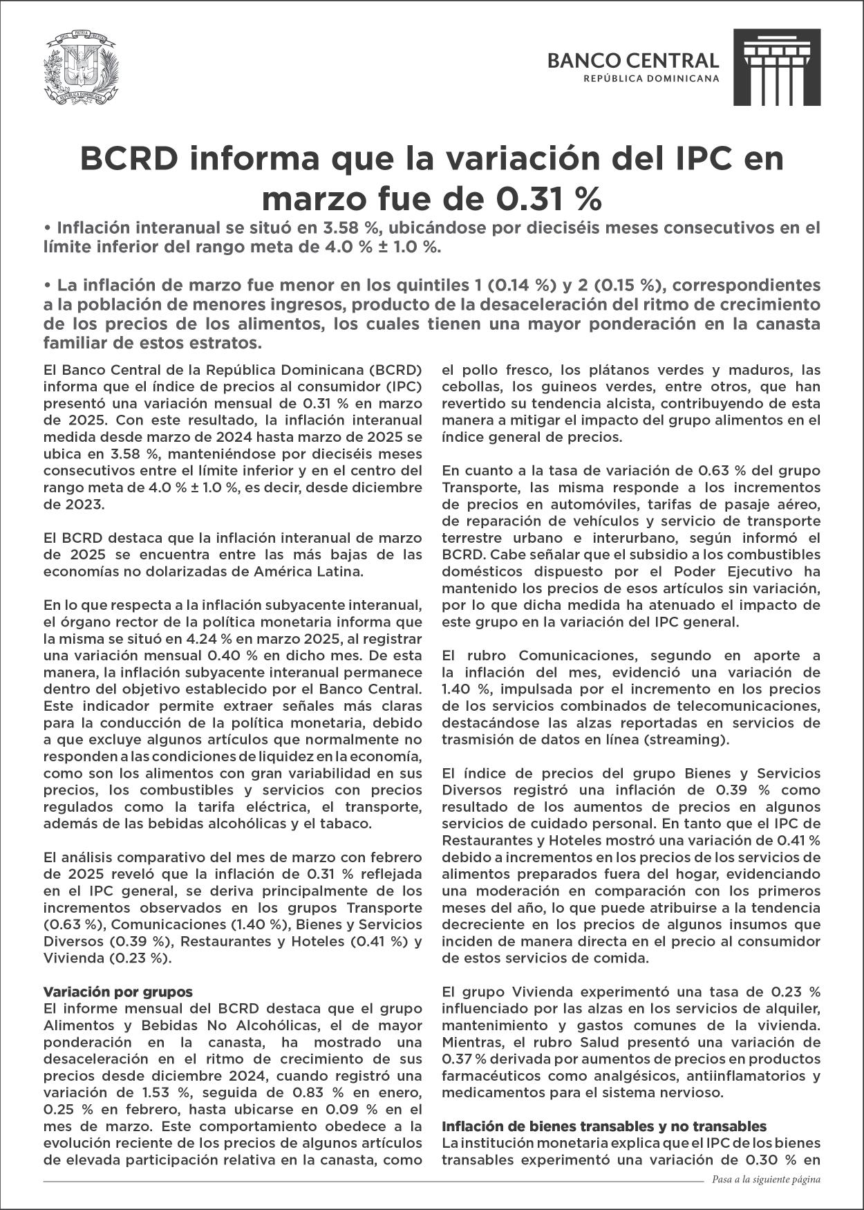 La inflación interanual es 3.58 %; la de marzo se ubicó en 0.31 %