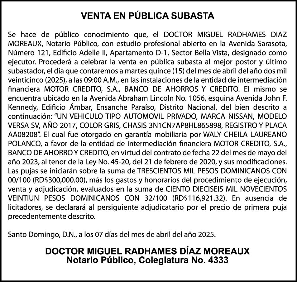 AA73678, Automovil Privado NISSAN, Modelo VERSA SV, Color GRIS, Año 2017, Chasis 3N1CN7AP1HK439671, a nombre de SAMUEL ELIAS MATOS ORTIZ.