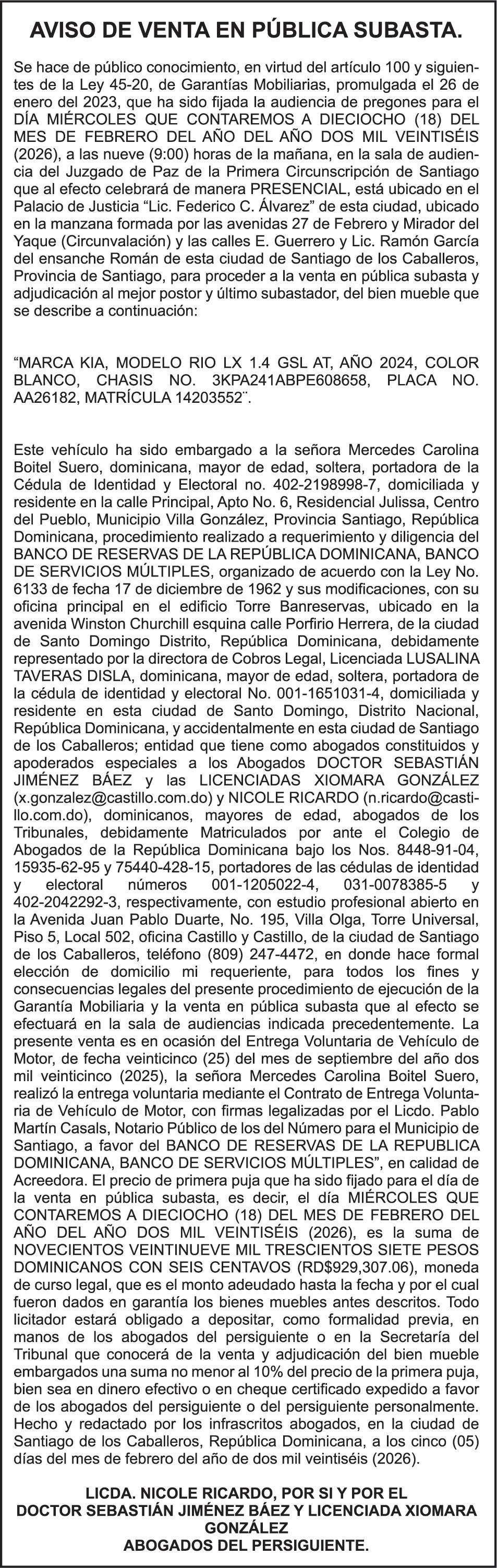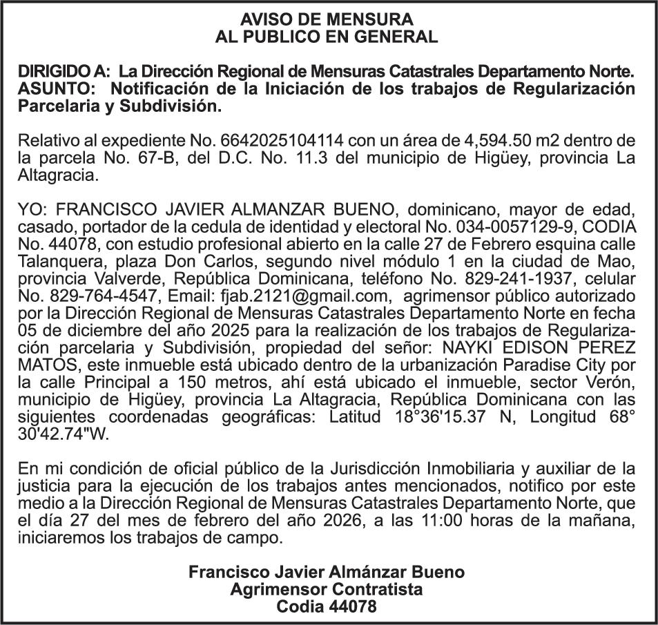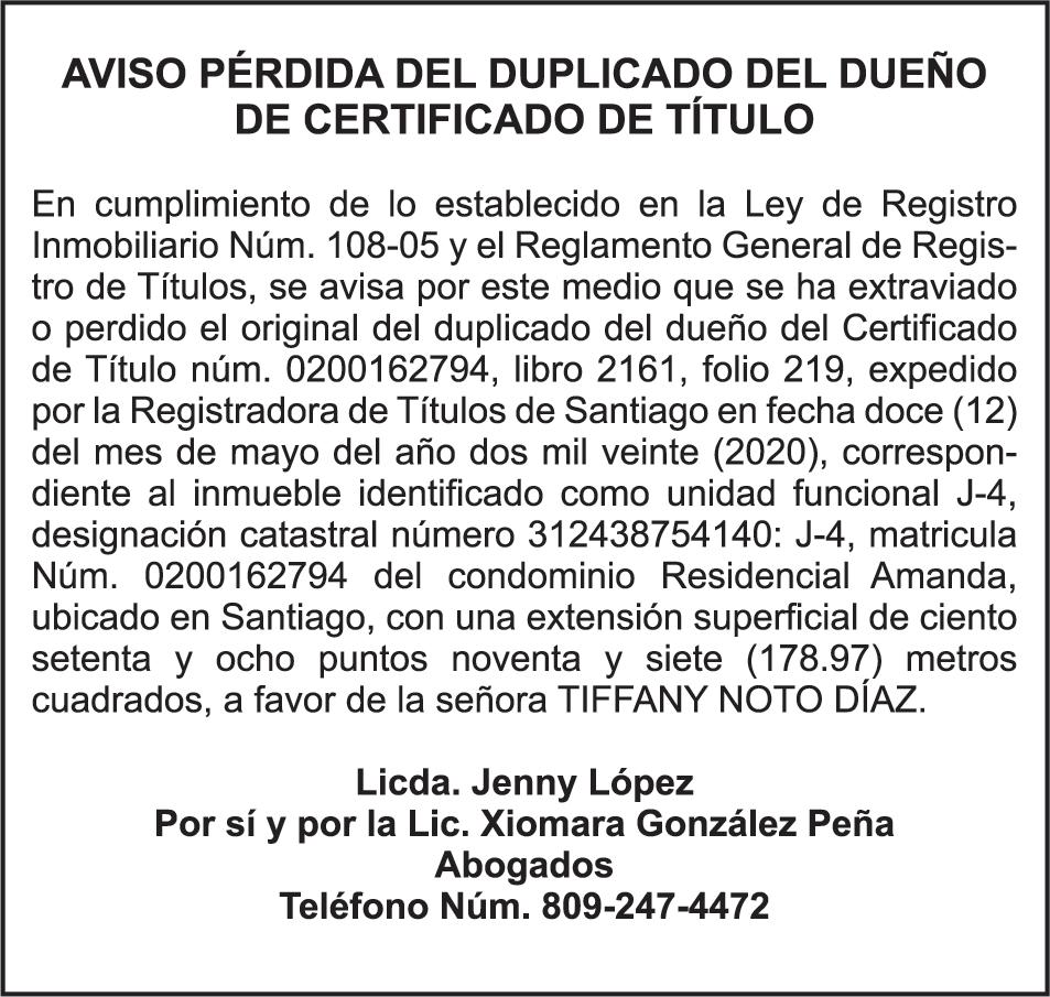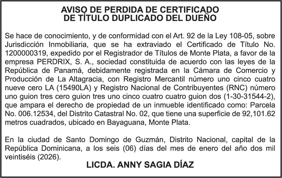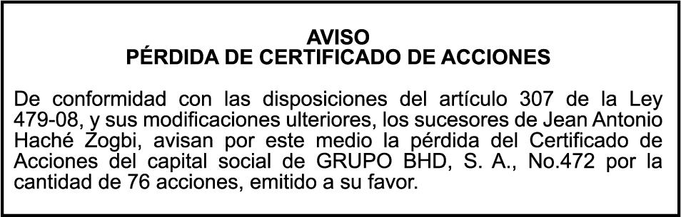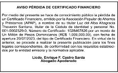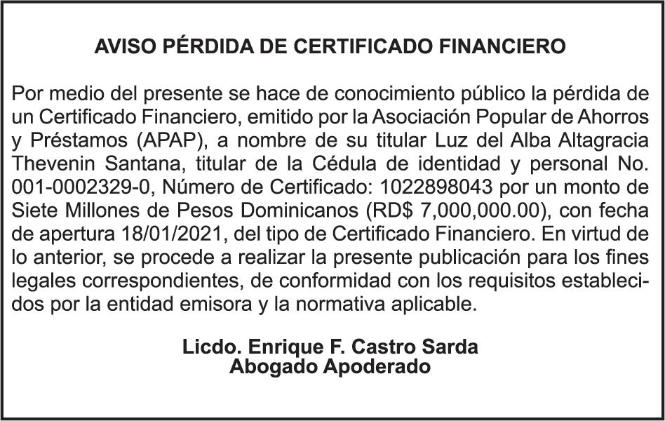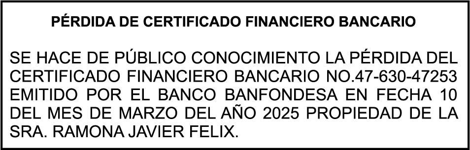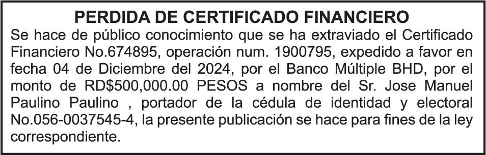 SE hace de público conocimiento la pérdida del Certificado Financiero número 842093775 emitido por Banco Popular Dominicano, S. A. Banco Múltiple, a nombre de PLINIO SAMUEL MENTOR ESPINAL, portador de la Cédula de Identidad y Electoral número 001-1458594-6 , c er t f icad o número 842093775 expedido en fecha 14 de junio de 2024, por el monto de (RD$300,000.00) más intereses generados a la fecha.
