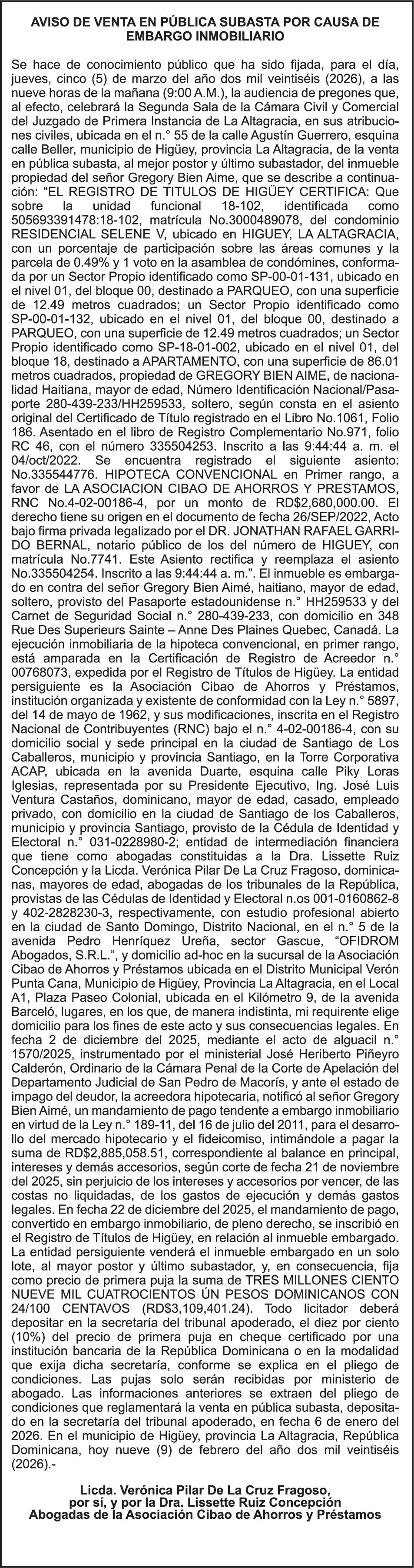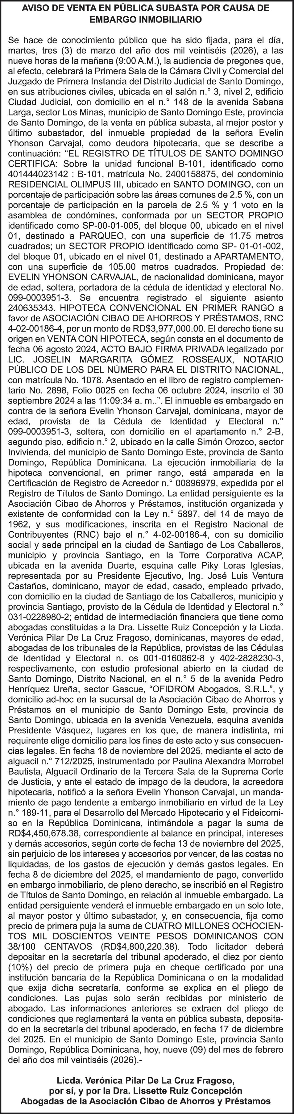 Múltiple, a nombre de MARIA SOLEDAD CARELA ORTIZ, portadora de la Cédula de Identidad y Electoral número 093-0011515-2 , c er t f icad o número 845703313 expedido en fecha 29 de noviembre de 2024 por el monto de (RD$105,417.90) más intereses generados a la fecha.