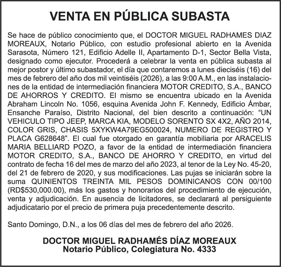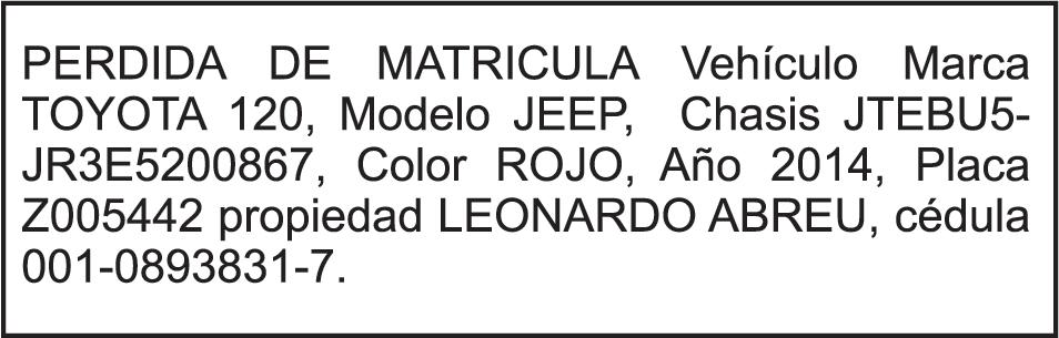 PERDIDA DE MATRICULA VEH. CARGA CHEVROLET, Modelo N300, Color blanco, Año 2015, placa L346427, Chasis LZWCCAGA8F6027443, a nombre de JUAN ISAAC DIAZ AGRAMONTE, Céd 010-0070816-8