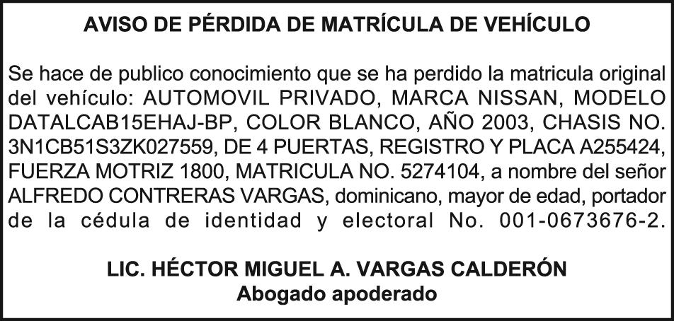 PERDIDA DE MATRICULA Automóvil privado DAIHATSU, modelo MIRA, placa A233525, color azul, año 1999, chasis L200S705609, propiedad de LILIAN MATEO CORNELIO.