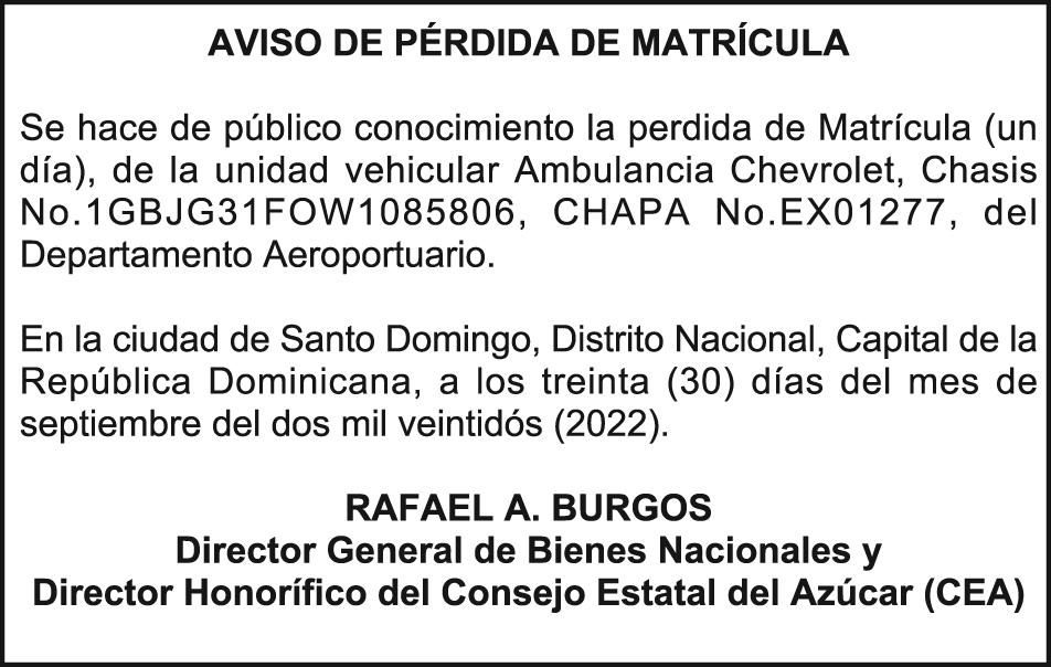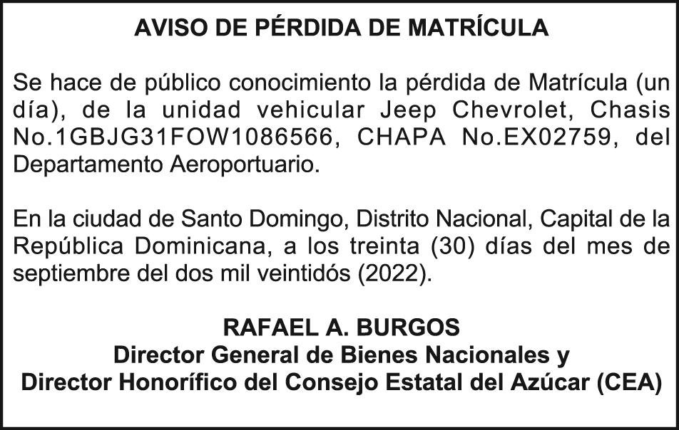 PERDIDA DE MATRICULA:Del JEEP, Placa G292282, Chasis WVGZZZ7PZCD031578, Marca VOLKSWAGEN, Modelo TAUAREG, AñO 2012, Color GRIS, a nombre de GARRIDO & MARTINEZ ALTERNATIVAS TEXTILES SRL, RNC130110182