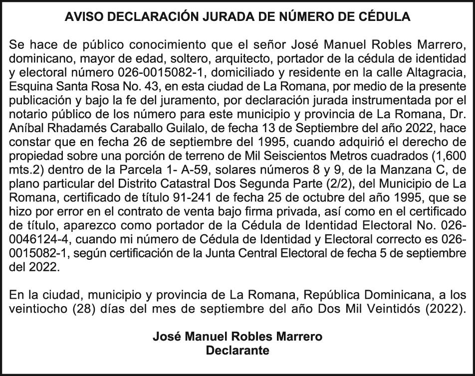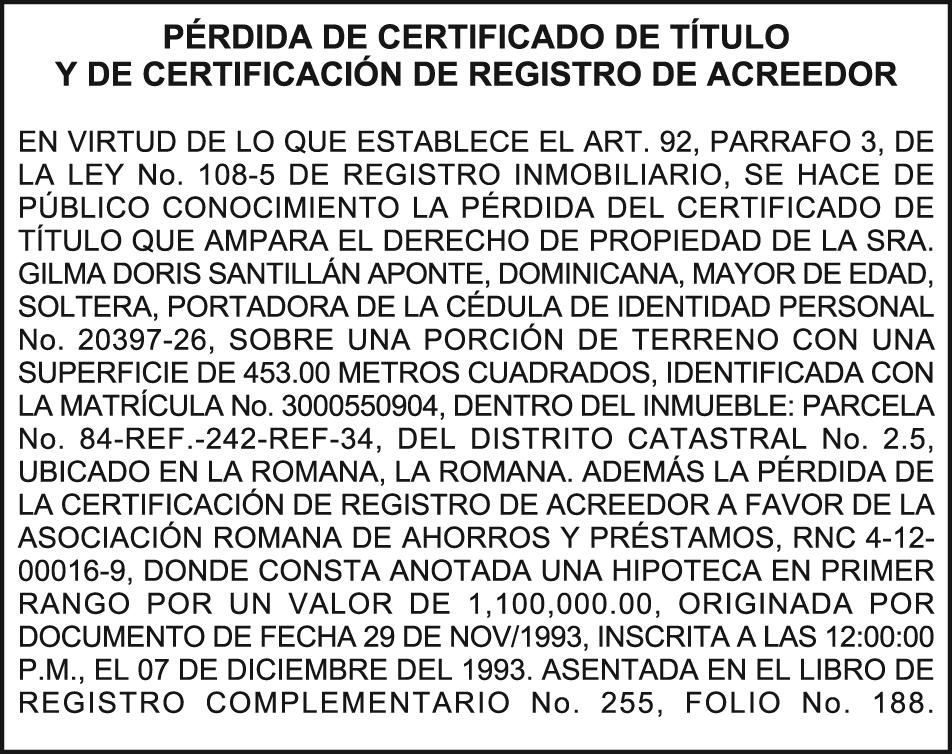SE hace de público conocimiento la pérdida de certificado de depósito número 826542664 emitido por Banco Popular Dominicano, S. A., a favor de PRISCILA INES PERALTA VALDEZ, portadora de la Cédula de Identidad y Electoral número 402-3013562-2, expedido en fecha 1 de marzo de 2022 por el monto de (RD$506,823.48), capital más intereses generados a la fecha.