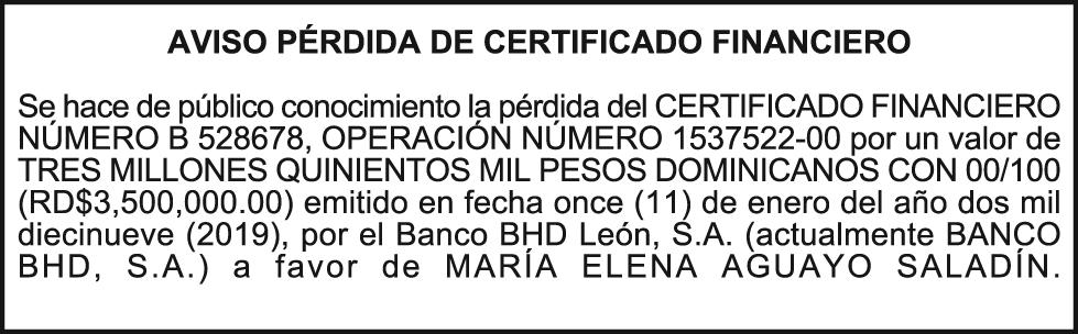 SE hace de público conocimiento la pérdida de certificado de depósito número 750257081 emitido por Banco Popular Dominicano, S. A., a favor de ROSA SENEIDA PEÑA NUNEZ, portadora de la Cédula de Identidad y Electoral número 054-0075646-5, expedido en fecha 5 de noviembre de 2008 por el monto de (RD$103,757.00), capital más intereses generados a la fecha.