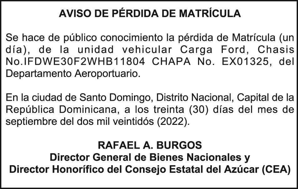 PERDIDA DE MATRICULA:Del Vehiculo, Placa L344741, Chasis 1FUJA6CK94LM78920, Marca FREIGHTLINER, Modelo FLD120,Color BLANCO, AñO 2004, a nombre de RUFINO RAFAEL MARTE SANTIAGO, Ced. 04700671193