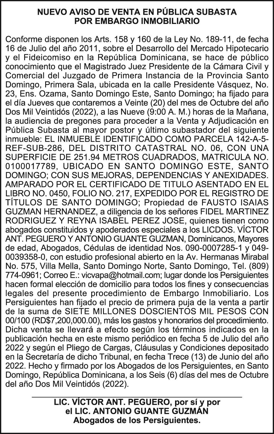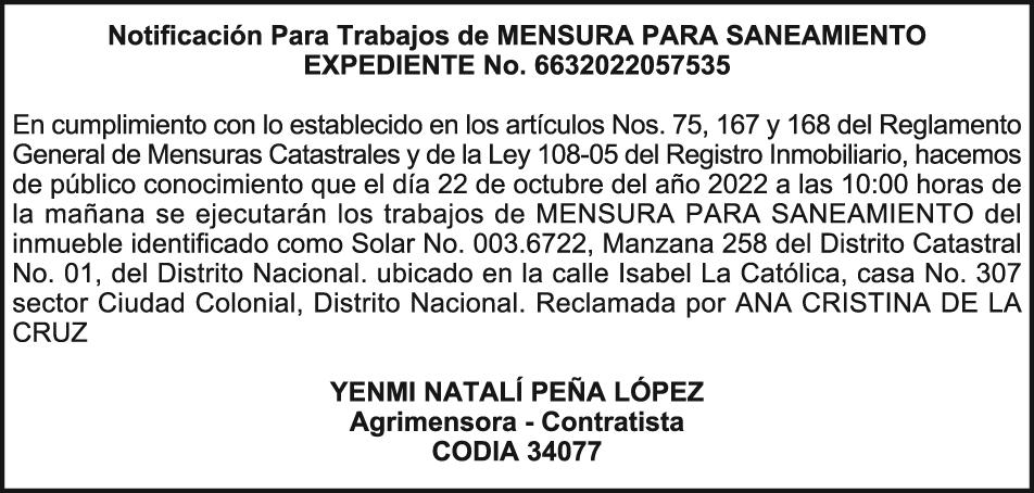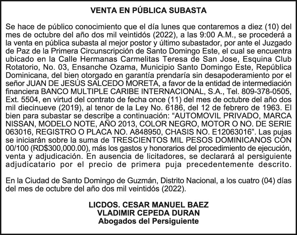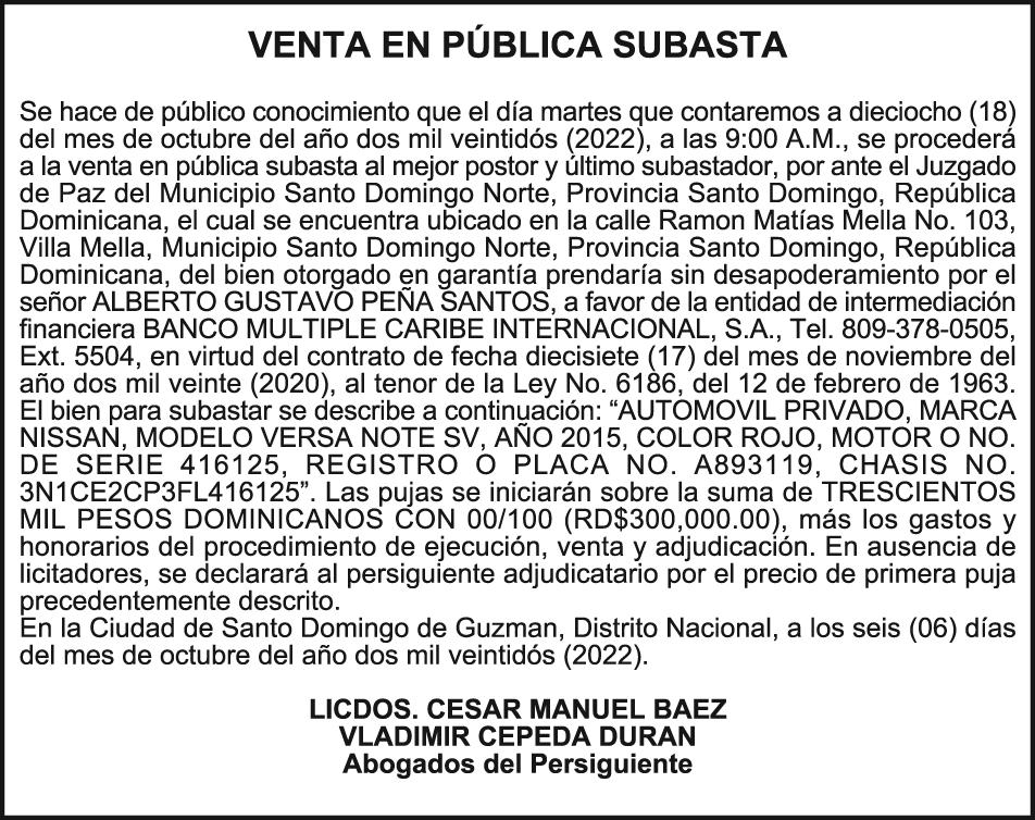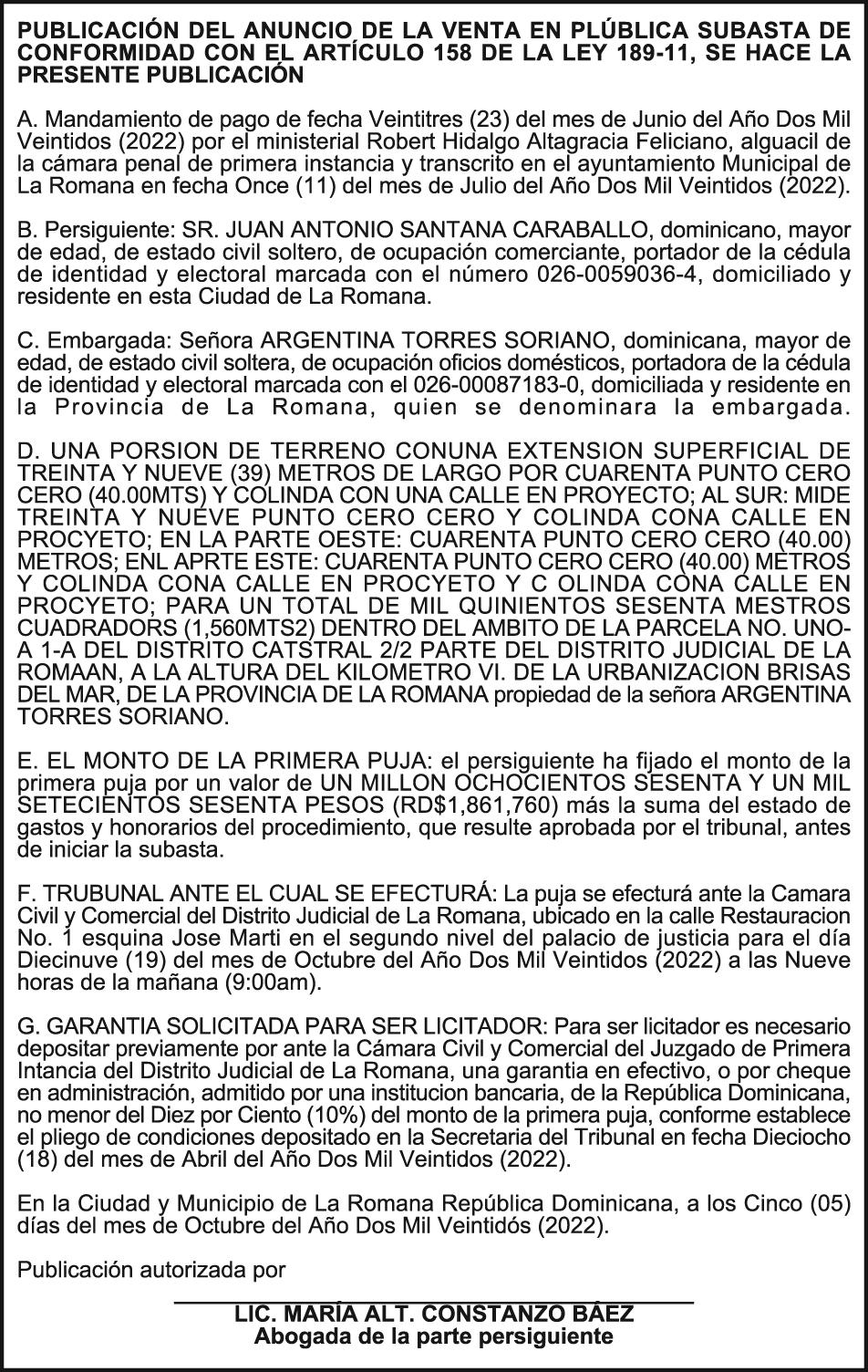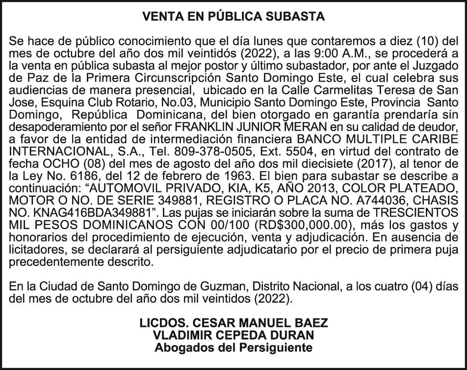 PESOS DOMINICANOS (RD$72,600.00) PROPIEDAD DE LA PLAZA DEBORA