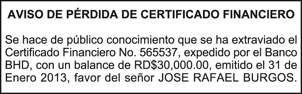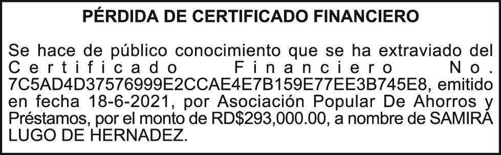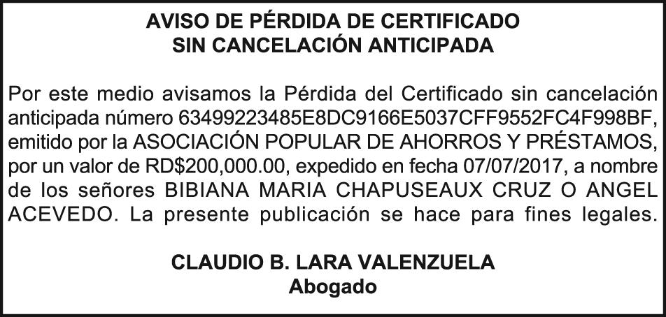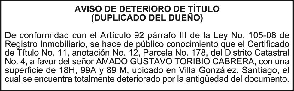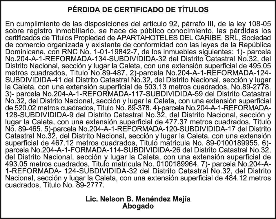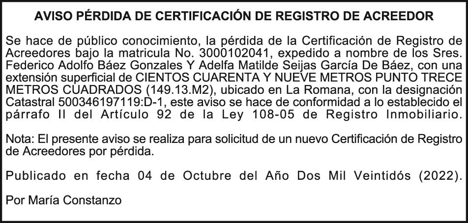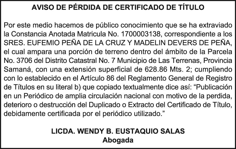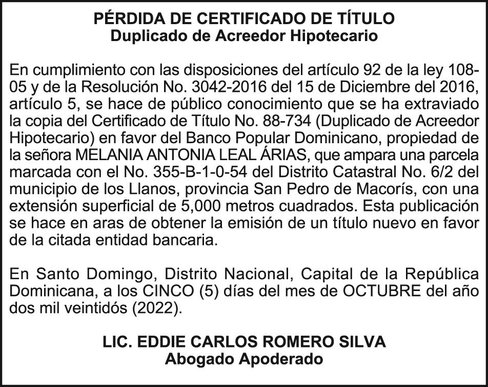 PERDIDA Certificado de Titulo, que ampara el inmueble No. 501371588738, con la matricula 3000215493, con una porción de Terreno de 416.56 Mts2, ubicado en San Rafael del Yuma, La Altagracia, a nombre de ESPERANZA RAYMUNDO BALTAZAR.