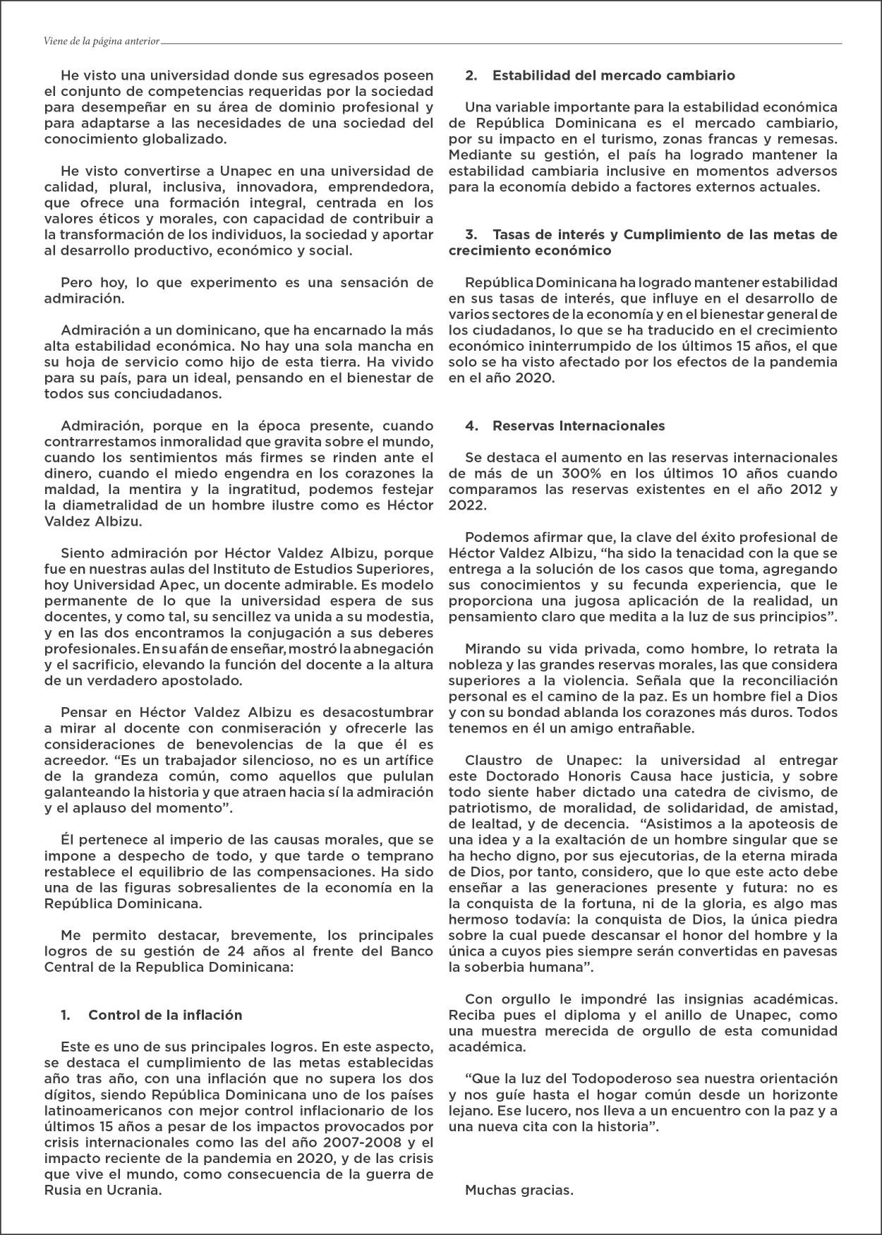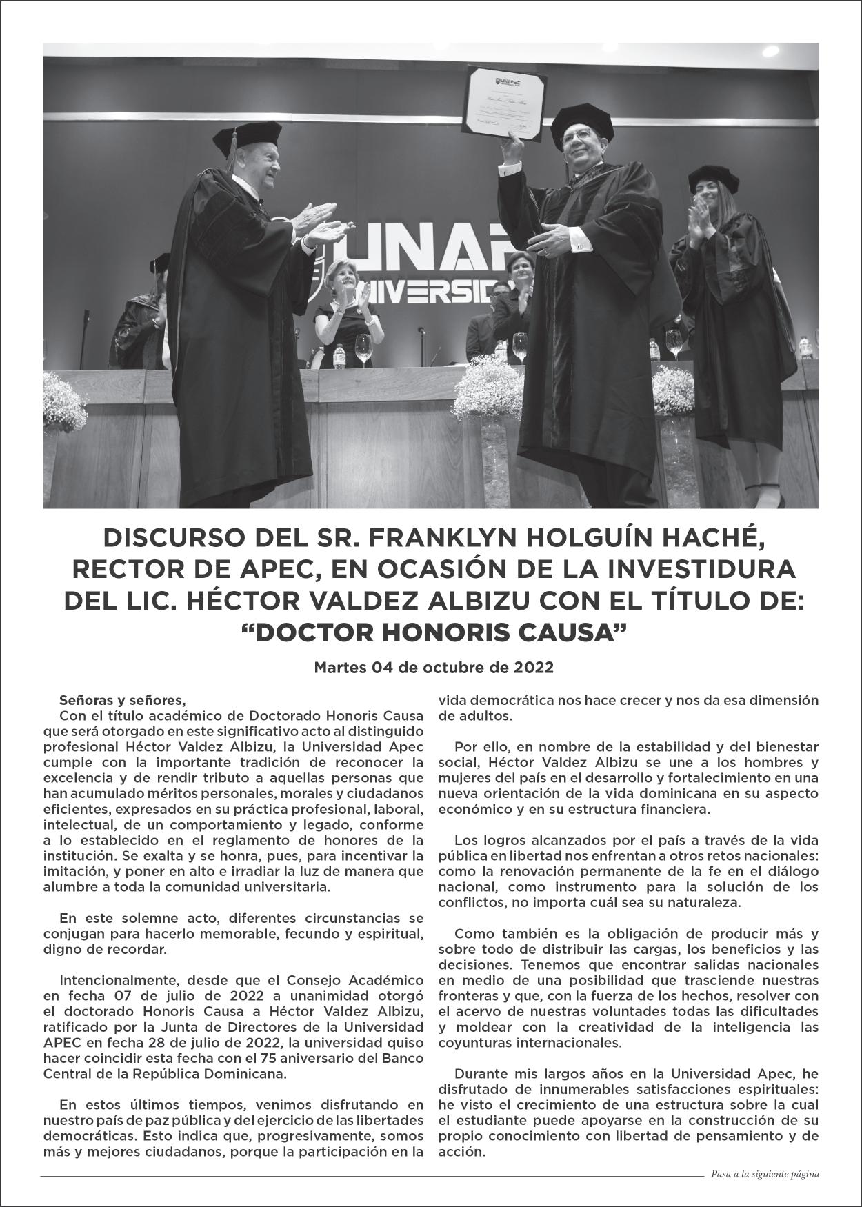 Fueron las palabras de Franklyn Holguín Haché, rector de la Universidad APEC, en ocasión de investidura de doctor honoris causa al gobernador del Banco Central Héctor Valdez Albizu el pasado martes.