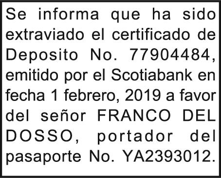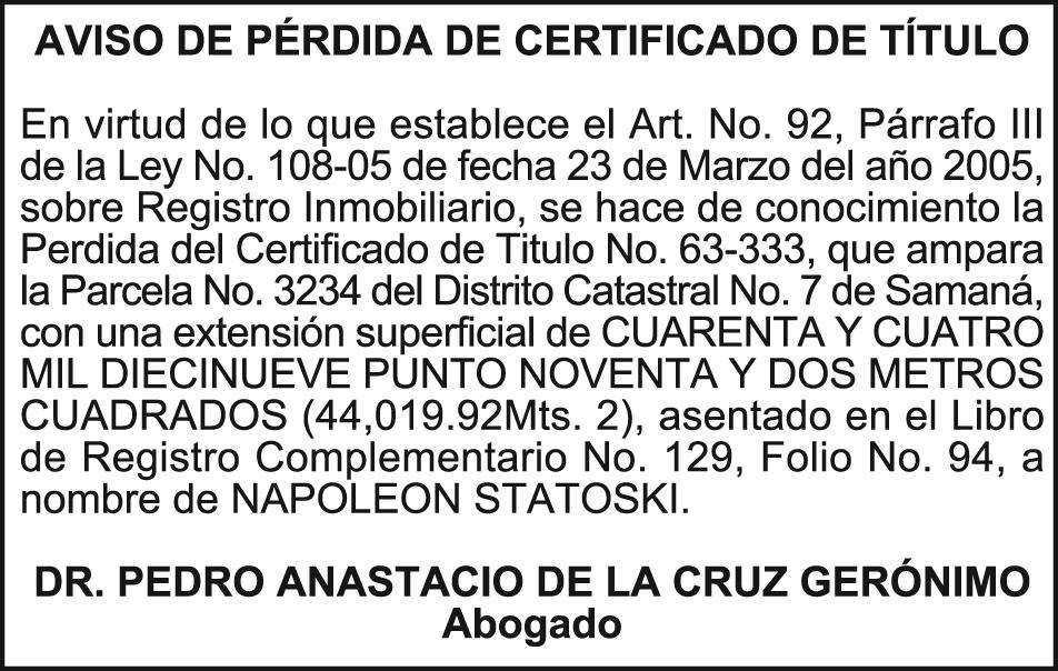 PERDIDA Certificado de Titulo, que ampara el inmueble No. 501371588738, con la matricula 3000215493, con una porción de Terreno de 400.02 Mts2, ubicado en San Rafael del Yuma, La Altagracia, a nombre de SALVATORE DE SIMONE.