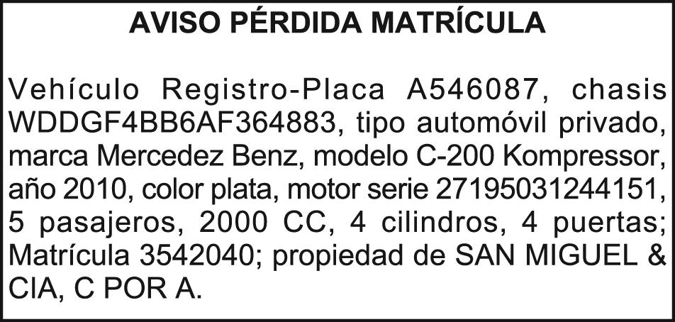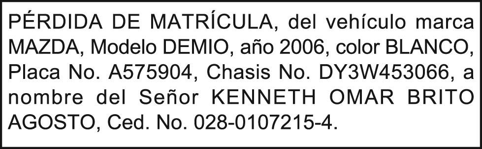 PERDIDA DE PLACANo. K0345327, Del Veh. marca