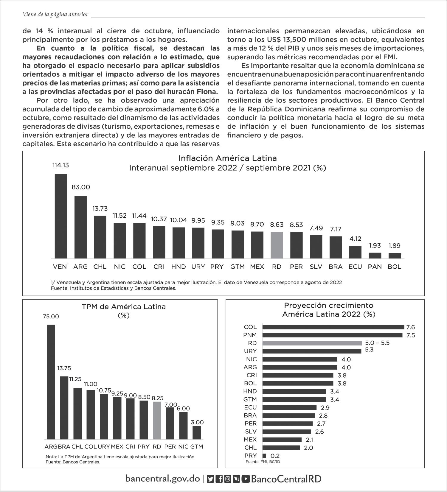 El documento indica que “en el complejo panorama actual, los riesgos se mantienen elevados” y que en ese sentido, “el BCRD estará dando seguimiento permanente a las condiciones financieras externas y a las expectativas de los agentes económicos, por si fuera necesario tomar medidas adicionales para preservar la estabilidad de precios”. En el entorno internacional, el BCRD dice que las tensiones geopolíticas han provocado un deterioro de las proyecciones económicas globales, y cita en ese orden que en su informe más reciente de las Perspectivas Económicas Mundiales el Fondo Monetario Internacional (FMI) prevé un crecimiento global para el presente año 2022 de 3.2 %, mientras permanecen elevadas las perspectivas para la inflación mundial. “En Estados Unidos de América, nuestro principal socio comercial, el crecimiento interanual se ubicó en 1.8 % en el tercer trimestre”.