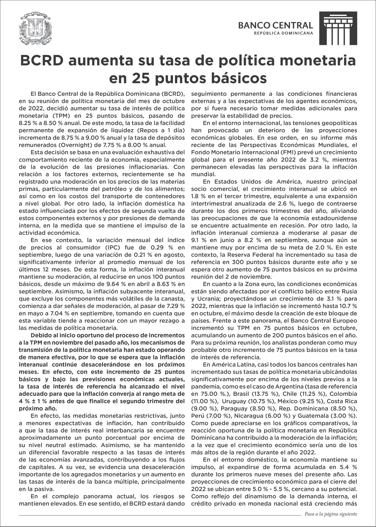 CONTROL. El Banco Central de la República Dominicana (BCRD), en su reunión de política monetaria de octubre de 2022, aumentó su tasa de interés de política monetaria (TPM) en 25 puntos básicos, al pasarla de 8.25 % a 8.50 % anual, y dijo que espera que con la medida “la inflación converja al rango meta de 4 % ± 1 % antes de que finalice el segundo trimestre del próximo año”.