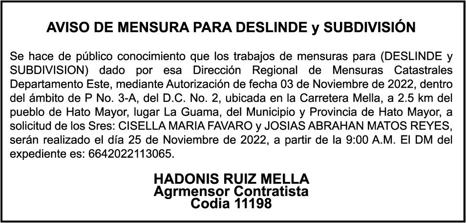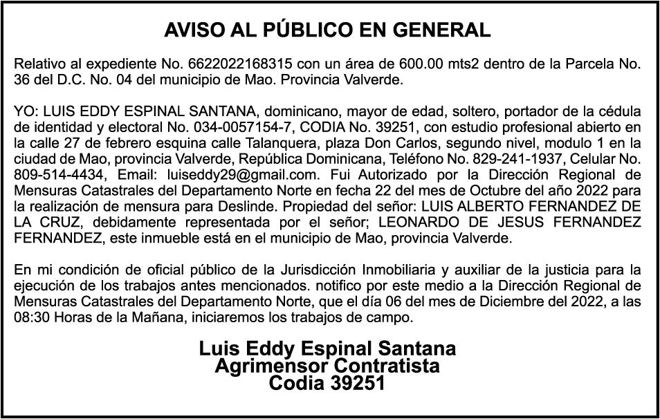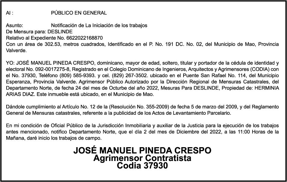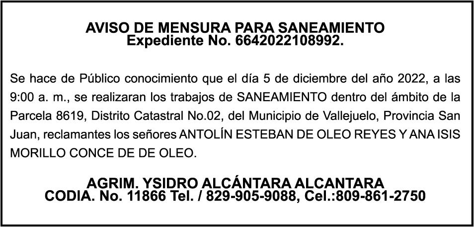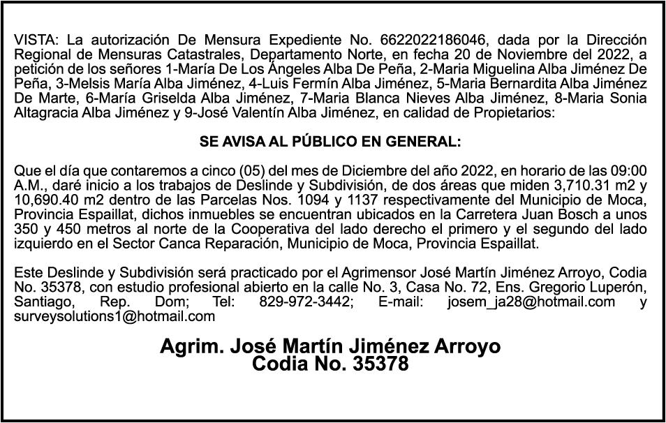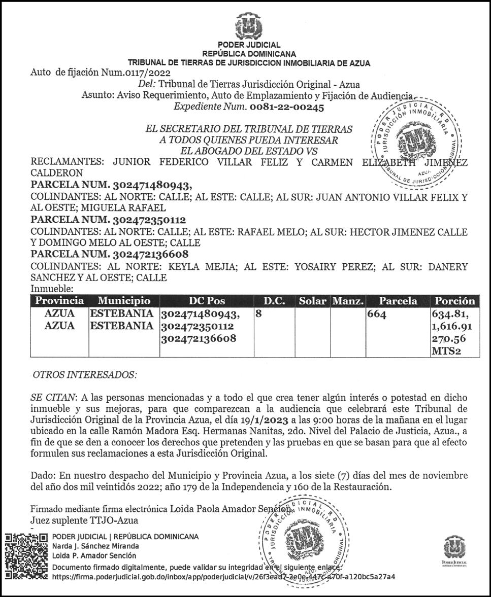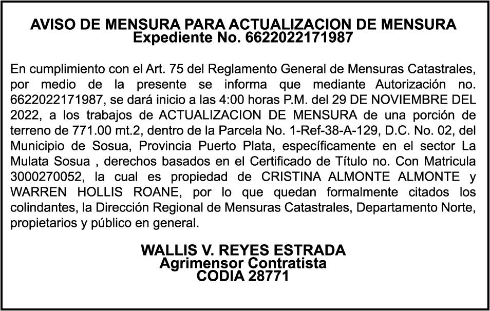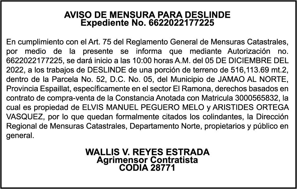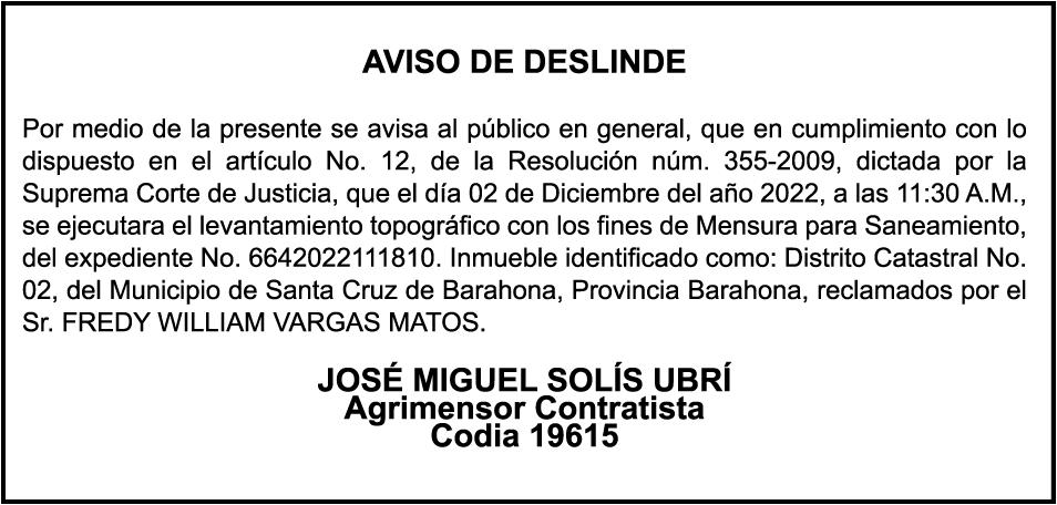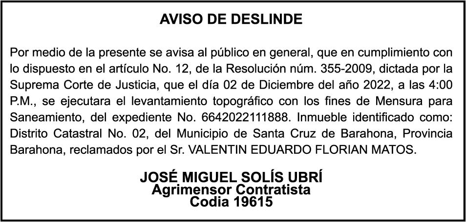 AVISO DE REGULARIZACION DE SOLAR No. 13-A, manzana No.124, ubicado en la calle FRANCISCO RICHIEZ, No. 105-A, de la ciudad de La Romana, Rep. Dom., no se encuentra a nombre de ninguna persona e institución.
