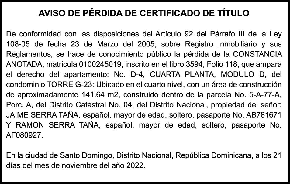 SE hace de público conocimiento la pérdida de certificado de depósito número 809695752 emitido por Banco Popular Dominicano, S. A., a favor de ISABEL TAVERAS FRIAS, portadora de la Cedula de identidad y Electoral número 001-1130321-0, expedido en fecha 12 de septiembre de 2018 por el monto de (RD$845,683.32), capital más intereses generados a la fecha.
